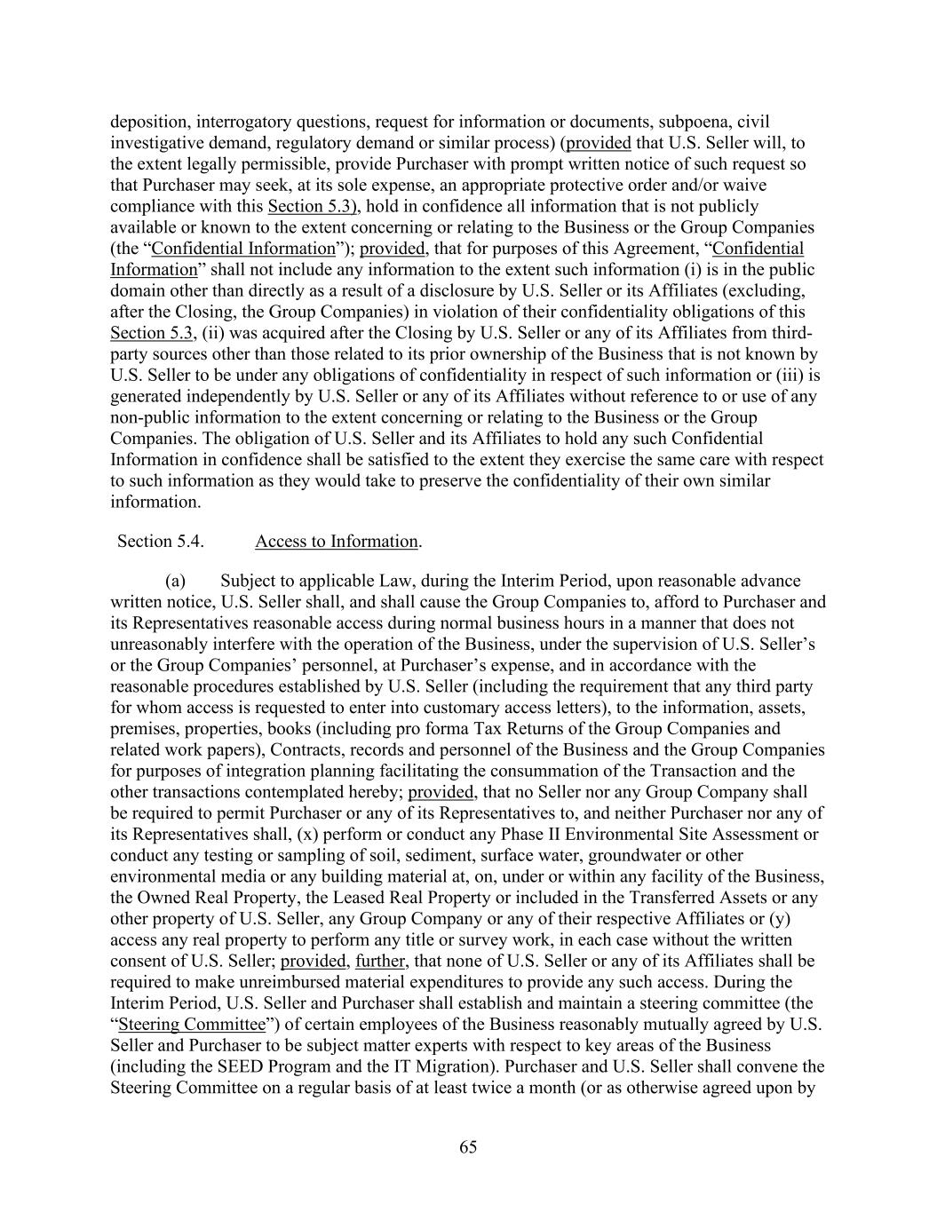 65 deposition, interrogatory questions, request for information or documents, subpoena, civil investigative demand, regulatory demand or similar process) (provided that U.S. Seller will, to the extent legally permissible, provide Purchaser with prompt written notice of such request so that Purchaser may seek, at its sole expense, an appropriate protective order and/or waive compliance with this Section 5.3), hold in confidence all information that is not publicly available or known to the extent concerning or relating to the Business or the Group Companies (the “Confidential Information”); provided, that for purposes of this Agreement, “Confidential Information” shall not include any information to the extent such information (i) is in the public domain other than directly as a result of a disclosure by U.S. Seller or its Affiliates (excluding, after the Closing, the Group Companies) in violation of their confidentiality obligations of this Section 5.3, (ii) was acquired after the Closing by U.S. Seller or any of its Affiliates from third- party sources other than those related to its prior ownership of the Business that is not known by U.S. Seller to be under any obligations of confidentiality in respect of such information or (iii) is generated independently by U.S. Seller or any of its Affiliates without reference to or use of any non-public information to the extent concerning or relating to the Business or the Group Companies. The obligation of U.S. Seller and its Affiliates to hold any such Confidential Information in confidence shall be satisfied to the extent they exercise the same care with respect to such information as they would take to preserve the confidentiality of their own similar information. Section 5.4. Access to Information. (a) Subject to applicable Law, during the Interim Period, upon reasonable advance written notice, U.S. Seller shall, and shall cause the Group Companies to, afford to Purchaser and its Representatives reasonable access during normal business hours in a manner that does not unreasonably interfere with the operation of the Business, under the supervision of U.S. Seller’s or the Group Companies’ personnel, at Purchaser’s expense, and in accordance with the reasonable procedures established by U.S. Seller (including the requirement that any third party for whom access is requested to enter into customary access letters), to the information, assets, premises, properties, books (including pro forma Tax Returns of the Group Companies and related work papers), Contracts, records and personnel of the Business and the Group Companies for purposes of integration planning facilitating the consummation of the Transaction and the other transactions contemplated hereby; provided, that no Seller nor any Group Company shall be required to permit Purchaser or any of its Representatives to, and neither Purchaser nor any of its Representatives shall, (x) perform or conduct any Phase II Environmental Site Assessment or conduct any testing or sampling of soil, sediment, surface water, groundwater or other environmental media or any building material at, on, under or within any facility of the Business, the Owned Real Property, the Leased Real Property or included in the Transferred Assets or any other property of U.S. Seller, any Group Company or any of their respective Affiliates or (y) access any real property to perform any title or survey work, in each case without the written consent of U.S. Seller; provided, further, that none of U.S. Seller or any of its Affiliates shall be required to make unreimbursed material expenditures to provide any such access. During the Interim Period, U.S. Seller and Purchaser shall establish and maintain a steering committee (the “Steering Committee”) of certain employees of the Business reasonably mutually agreed by U.S. Seller and Purchaser to be subject matter experts with respect to key areas of the Business (including the SEED Program and the IT Migration). Purchaser and U.S. Seller shall convene the Steering Committee on a regular basis of at least twice a month (or as otherwise agreed upon by
