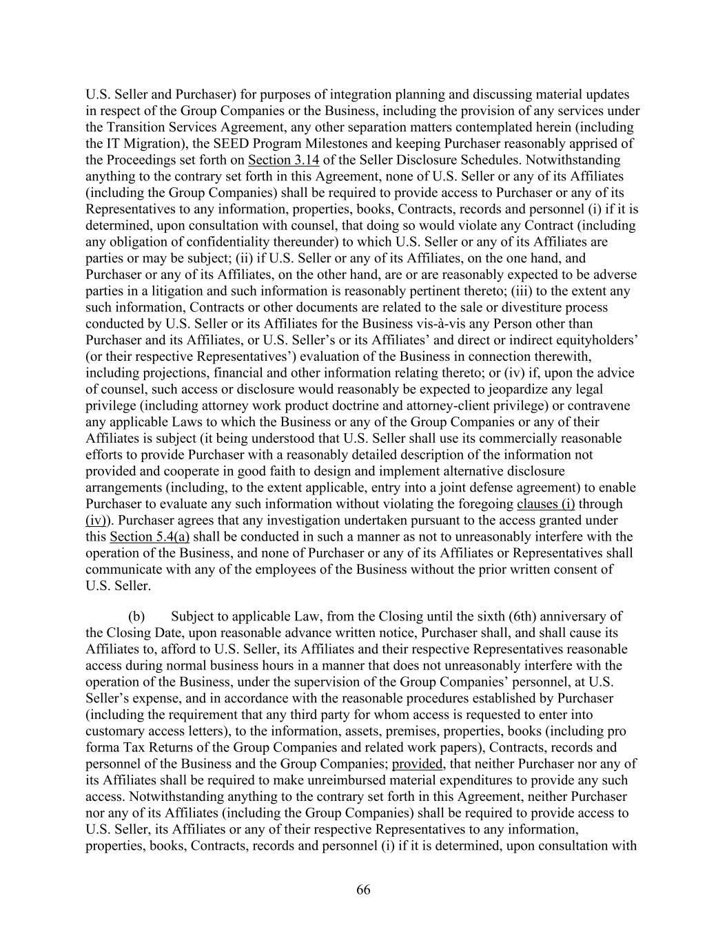 66 U.S. Seller and Purchaser) for purposes of integration planning and discussing material updates in respect of the Group Companies or the Business, including the provision of any services under the Transition Services Agreement, any other separation matters contemplated herein (including the IT Migration), the SEED Program Milestones and keeping Purchaser reasonably apprised of the Proceedings set forth on Section 3.14 of the Seller Disclosure Schedules. Notwithstanding anything to the contrary set forth in this Agreement, none of U.S. Seller or any of its Affiliates (including the Group Companies) shall be required to provide access to Purchaser or any of its Representatives to any information, properties, books, Contracts, records and personnel (i) if it is determined, upon consultation with counsel, that doing so would violate any Contract (including any obligation of confidentiality thereunder) to which U.S. Seller or any of its Affiliates are parties or may be subject; (ii) if U.S. Seller or any of its Affiliates, on the one hand, and Purchaser or any of its Affiliates, on the other hand, are or are reasonably expected to be adverse parties in a litigation and such information is reasonably pertinent thereto; (iii) to the extent any such information, Contracts or other documents are related to the sale or divestiture process conducted by U.S. Seller or its Affiliates for the Business vis-à-vis any Person other than Purchaser and its Affiliates, or U.S. Seller’s or its Affiliates’ and direct or indirect equityholders’ (or their respective Representatives’) evaluation of the Business in connection therewith, including projections, financial and other information relating thereto; or (iv) if, upon the advice of counsel, such access or disclosure would reasonably be expected to jeopardize any legal privilege (including attorney work product doctrine and attorney-client privilege) or contravene any applicable Laws to which the Business or any of the Group Companies or any of their Affiliates is subject (it being understood that U.S. Seller shall use its commercially reasonable efforts to provide Purchaser with a reasonably detailed description of the information not provided and cooperate in good faith to design and implement alternative disclosure arrangements (including, to the extent applicable, entry into a joint defense agreement) to enable Purchaser to evaluate any such information without violating the foregoing clauses (i) through (iv)). Purchaser agrees that any investigation undertaken pursuant to the access granted under this Section 5.4(a) shall be conducted in such a manner as not to unreasonably interfere with the operation of the Business, and none of Purchaser or any of its Affiliates or Representatives shall communicate with any of the employees of the Business without the prior written consent of U.S. Seller. (b) Subject to applicable Law, from the Closing until the sixth (6th) anniversary of the Closing Date, upon reasonable advance written notice, Purchaser shall, and shall cause its Affiliates to, afford to U.S. Seller, its Affiliates and their respective Representatives reasonable access during normal business hours in a manner that does not unreasonably interfere with the operation of the Business, under the supervision of the Group Companies’ personnel, at U.S. Seller’s expense, and in accordance with the reasonable procedures established by Purchaser (including the requirement that any third party for whom access is requested to enter into customary access letters), to the information, assets, premises, properties, books (including pro forma Tax Returns of the Group Companies and related work papers), Contracts, records and personnel of the Business and the Group Companies; provided, that neither Purchaser nor any of its Affiliates shall be required to make unreimbursed material expenditures to provide any such access. Notwithstanding anything to the contrary set forth in this Agreement, neither Purchaser nor any of its Affiliates (including the Group Companies) shall be required to provide access to U.S. Seller, its Affiliates or any of their respective Representatives to any information, properties, books, Contracts, records and personnel (i) if it is determined, upon consultation with