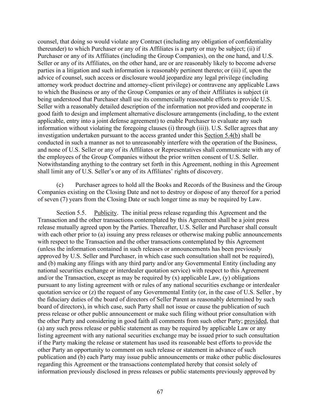 67 counsel, that doing so would violate any Contract (including any obligation of confidentiality thereunder) to which Purchaser or any of its Affiliates is a party or may be subject; (ii) if Purchaser or any of its Affiliates (including the Group Companies), on the one hand, and U.S. Seller or any of its Affiliates, on the other hand, are or are reasonably likely to become adverse parties in a litigation and such information is reasonably pertinent thereto; or (iii) if, upon the advice of counsel, such access or disclosure would jeopardize any legal privilege (including attorney work product doctrine and attorney-client privilege) or contravene any applicable Laws to which the Business or any of the Group Companies or any of their Affiliates is subject (it being understood that Purchaser shall use its commercially reasonable efforts to provide U.S. Seller with a reasonably detailed description of the information not provided and cooperate in good faith to design and implement alternative disclosure arrangements (including, to the extent applicable, entry into a joint defense agreement) to enable Purchaser to evaluate any such information without violating the foregoing clauses (i) through (iii)). U.S. Seller agrees that any investigation undertaken pursuant to the access granted under this Section 5.4(b) shall be conducted in such a manner as not to unreasonably interfere with the operation of the Business, and none of U.S. Seller or any of its Affiliates or Representatives shall communicate with any of the employees of the Group Companies without the prior written consent of U.S. Seller. Notwithstanding anything to the contrary set forth in this Agreement, nothing in this Agreement shall limit any of U.S. Seller’s or any of its Affiliates’ rights of discovery. (c) Purchaser agrees to hold all the Books and Records of the Business and the Group Companies existing on the Closing Date and not to destroy or dispose of any thereof for a period of seven (7) years from the Closing Date or such longer time as may be required by Law. Section 5.5. Publicity. The initial press release regarding this Agreement and the Transaction and the other transactions contemplated by this Agreement shall be a joint press release mutually agreed upon by the Parties. Thereafter, U.S. Seller and Purchaser shall consult with each other prior to (a) issuing any press releases or otherwise making public announcements with respect to the Transaction and the other transactions contemplated by this Agreement (unless the information contained in such releases or announcements has been previously approved by U.S. Seller and Purchaser, in which case such consultation shall not be required), and (b) making any filings with any third party and/or any Governmental Entity (including any national securities exchange or interdealer quotation service) with respect to this Agreement and/or the Transaction, except as may be required by (x) applicable Law, (y) obligations pursuant to any listing agreement with or rules of any national securities exchange or interdealer quotation service or (z) the request of any Governmental Entity (or, in the case of U.S. Seller , by the fiduciary duties of the board of directors of Seller Parent as reasonably determined by such board of directors), in which case, such Party shall not issue or cause the publication of such press release or other public announcement or make such filing without prior consultation with the other Party and considering in good faith all comments from such other Party; provided, that (a) any such press release or public statement as may be required by applicable Law or any listing agreement with any national securities exchange may be issued prior to such consultation if the Party making the release or statement has used its reasonable best efforts to provide the other Party an opportunity to comment on such release or statement in advance of such publication and (b) each Party may issue public announcements or make other public disclosures regarding this Agreement or the transactions contemplated hereby that consist solely of information previously disclosed in press releases or public statements previously approved by
