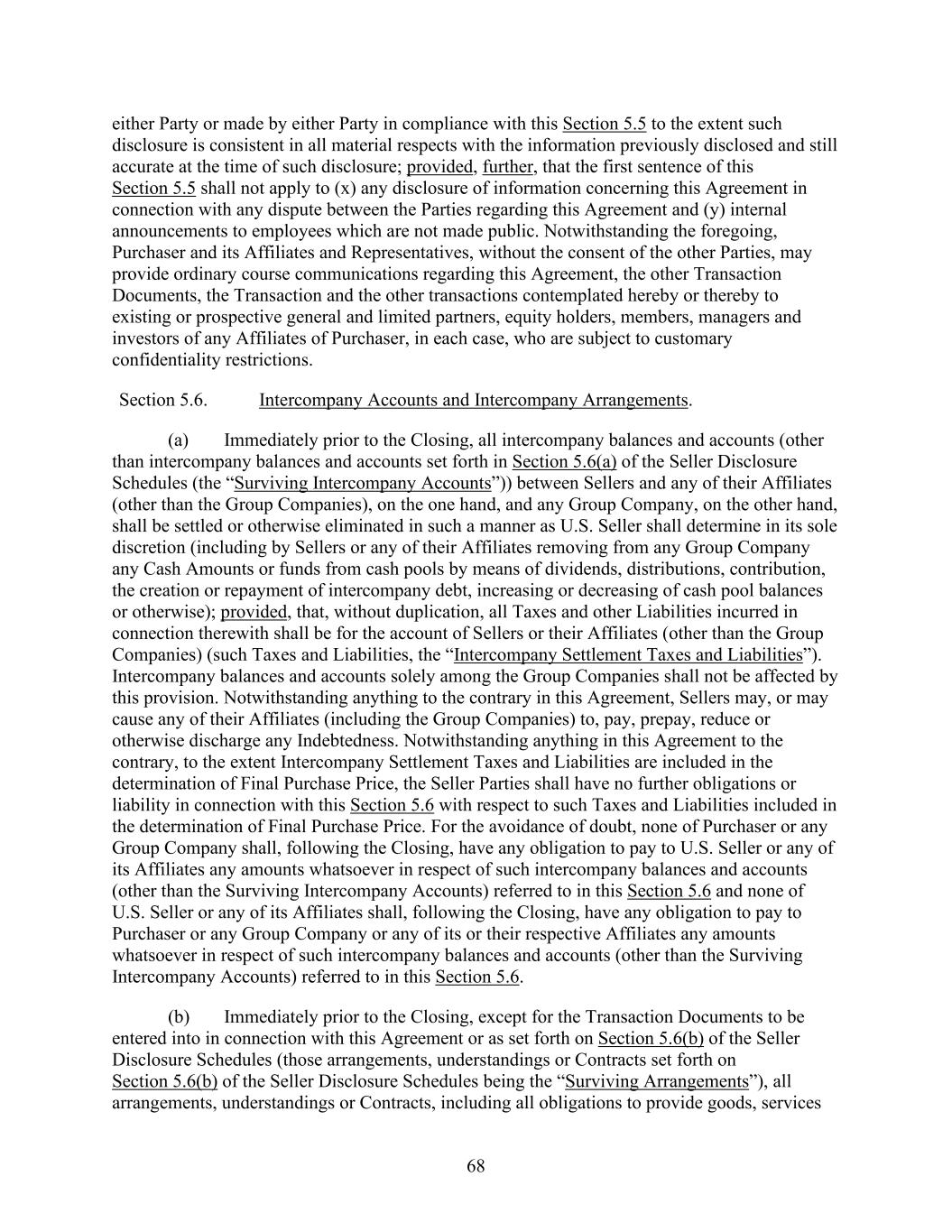 68 either Party or made by either Party in compliance with this Section 5.5 to the extent such disclosure is consistent in all material respects with the information previously disclosed and still accurate at the time of such disclosure; provided, further, that the first sentence of this Section 5.5 shall not apply to (x) any disclosure of information concerning this Agreement in connection with any dispute between the Parties regarding this Agreement and (y) internal announcements to employees which are not made public. Notwithstanding the foregoing, Purchaser and its Affiliates and Representatives, without the consent of the other Parties, may provide ordinary course communications regarding this Agreement, the other Transaction Documents, the Transaction and the other transactions contemplated hereby or thereby to existing or prospective general and limited partners, equity holders, members, managers and investors of any Affiliates of Purchaser, in each case, who are subject to customary confidentiality restrictions. Section 5.6. Intercompany Accounts and Intercompany Arrangements. (a) Immediately prior to the Closing, all intercompany balances and accounts (other than intercompany balances and accounts set forth in Section 5.6(a) of the Seller Disclosure Schedules (the “Surviving Intercompany Accounts”)) between Sellers and any of their Affiliates (other than the Group Companies), on the one hand, and any Group Company, on the other hand, shall be settled or otherwise eliminated in such a manner as U.S. Seller shall determine in its sole discretion (including by Sellers or any of their Affiliates removing from any Group Company any Cash Amounts or funds from cash pools by means of dividends, distributions, contribution, the creation or repayment of intercompany debt, increasing or decreasing of cash pool balances or otherwise); provided, that, without duplication, all Taxes and other Liabilities incurred in connection therewith shall be for the account of Sellers or their Affiliates (other than the Group Companies) (such Taxes and Liabilities, the “Intercompany Settlement Taxes and Liabilities”). Intercompany balances and accounts solely among the Group Companies shall not be affected by this provision. Notwithstanding anything to the contrary in this Agreement, Sellers may, or may cause any of their Affiliates (including the Group Companies) to, pay, prepay, reduce or otherwise discharge any Indebtedness. Notwithstanding anything in this Agreement to the contrary, to the extent Intercompany Settlement Taxes and Liabilities are included in the determination of Final Purchase Price, the Seller Parties shall have no further obligations or liability in connection with this Section 5.6 with respect to such Taxes and Liabilities included in the determination of Final Purchase Price. For the avoidance of doubt, none of Purchaser or any Group Company shall, following the Closing, have any obligation to pay to U.S. Seller or any of its Affiliates any amounts whatsoever in respect of such intercompany balances and accounts (other than the Surviving Intercompany Accounts) referred to in this Section 5.6 and none of U.S. Seller or any of its Affiliates shall, following the Closing, have any obligation to pay to Purchaser or any Group Company or any of its or their respective Affiliates any amounts whatsoever in respect of such intercompany balances and accounts (other than the Surviving Intercompany Accounts) referred to in this Section 5.6. (b) Immediately prior to the Closing, except for the Transaction Documents to be entered into in connection with this Agreement or as set forth on Section 5.6(b) of the Seller Disclosure Schedules (those arrangements, understandings or Contracts set forth on Section 5.6(b) of the Seller Disclosure Schedules being the “Surviving Arrangements”), all arrangements, understandings or Contracts, including all obligations to provide goods, services
