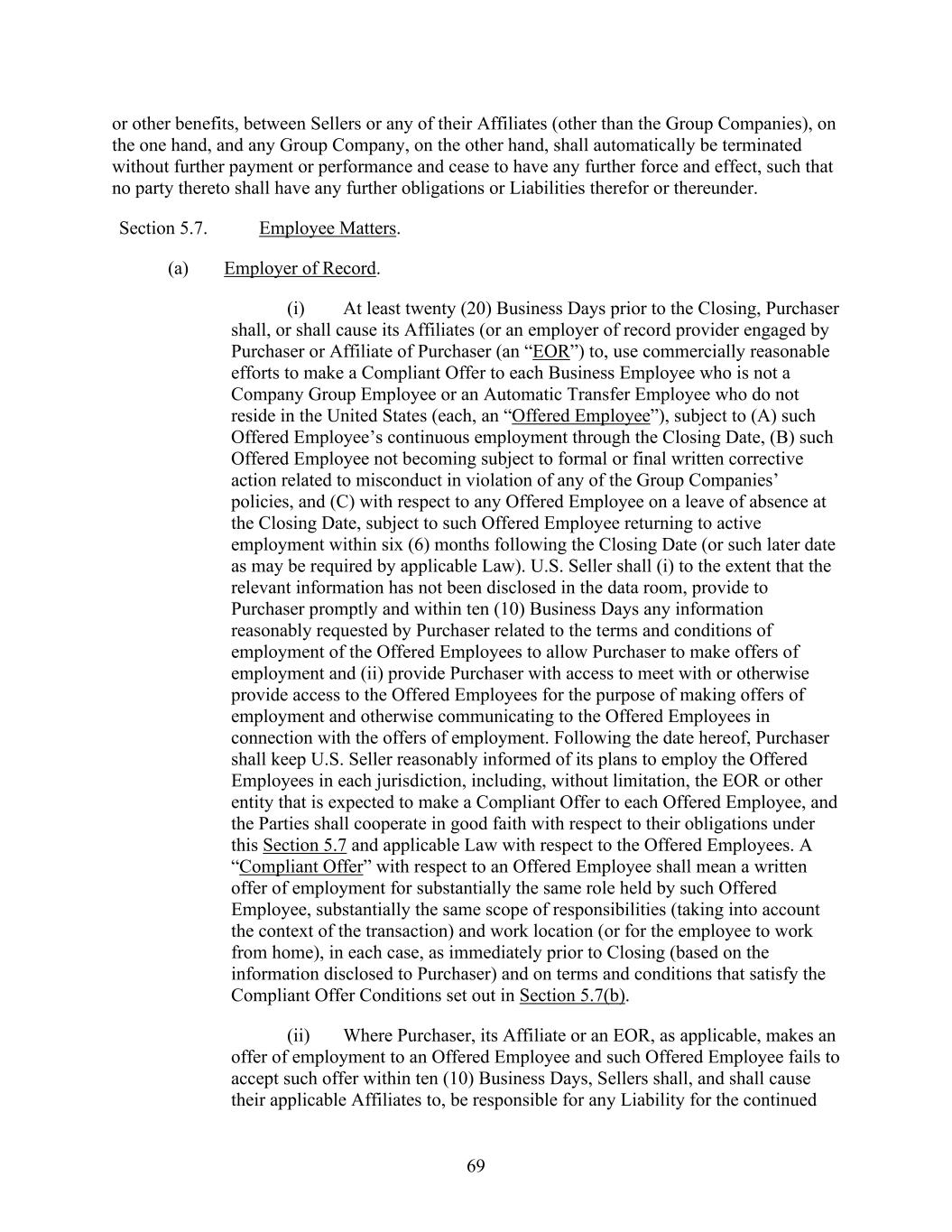 69 or other benefits, between Sellers or any of their Affiliates (other than the Group Companies), on the one hand, and any Group Company, on the other hand, shall automatically be terminated without further payment or performance and cease to have any further force and effect, such that no party thereto shall have any further obligations or Liabilities therefor or thereunder. Section 5.7. Employee Matters. (a) Employer of Record. (i) At least twenty (20) Business Days prior to the Closing, Purchaser shall, or shall cause its Affiliates (or an employer of record provider engaged by Purchaser or Affiliate of Purchaser (an “EOR”) to, use commercially reasonable efforts to make a Compliant Offer to each Business Employee who is not a Company Group Employee or an Automatic Transfer Employee who do not reside in the United States (each, an “Offered Employee”), subject to (A) such Offered Employee’s continuous employment through the Closing Date, (B) such Offered Employee not becoming subject to formal or final written corrective action related to misconduct in violation of any of the Group Companies’ policies, and (C) with respect to any Offered Employee on a leave of absence at the Closing Date, subject to such Offered Employee returning to active employment within six (6) months following the Closing Date (or such later date as may be required by applicable Law). U.S. Seller shall (i) to the extent that the relevant information has not been disclosed in the data room, provide to Purchaser promptly and within ten (10) Business Days any information reasonably requested by Purchaser related to the terms and conditions of employment of the Offered Employees to allow Purchaser to make offers of employment and (ii) provide Purchaser with access to meet with or otherwise provide access to the Offered Employees for the purpose of making offers of employment and otherwise communicating to the Offered Employees in connection with the offers of employment. Following the date hereof, Purchaser shall keep U.S. Seller reasonably informed of its plans to employ the Offered Employees in each jurisdiction, including, without limitation, the EOR or other entity that is expected to make a Compliant Offer to each Offered Employee, and the Parties shall cooperate in good faith with respect to their obligations under this Section 5.7 and applicable Law with respect to the Offered Employees. A “Compliant Offer” with respect to an Offered Employee shall mean a written offer of employment for substantially the same role held by such Offered Employee, substantially the same scope of responsibilities (taking into account the context of the transaction) and work location (or for the employee to work from home), in each case, as immediately prior to Closing (based on the information disclosed to Purchaser) and on terms and conditions that satisfy the Compliant Offer Conditions set out in Section 5.7(b). (ii) Where Purchaser, its Affiliate or an EOR, as applicable, makes an offer of employment to an Offered Employee and such Offered Employee fails to accept such offer within ten (10) Business Days, Sellers shall, and shall cause their applicable Affiliates to, be responsible for any Liability for the continued