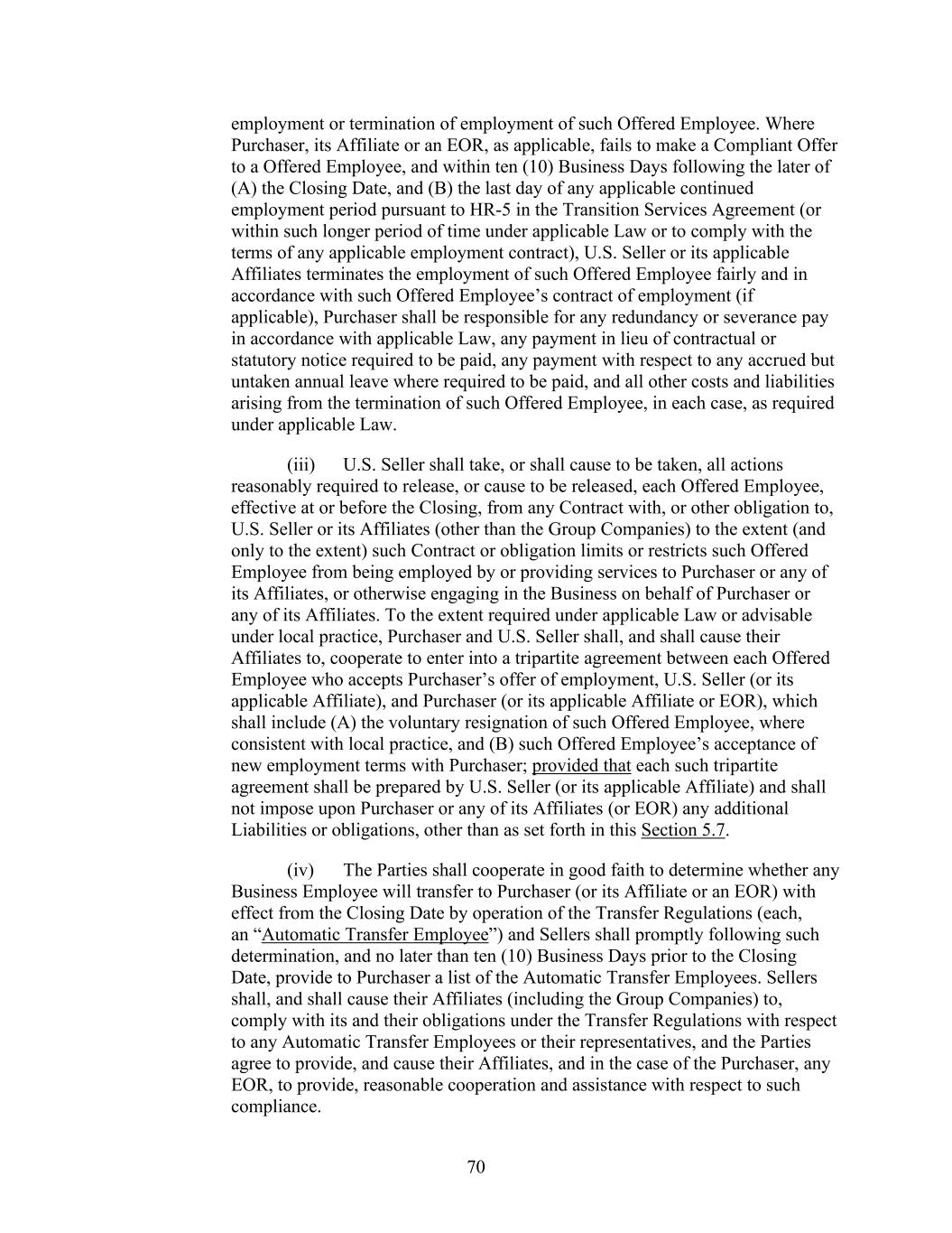 70 employment or termination of employment of such Offered Employee. Where Purchaser, its Affiliate or an EOR, as applicable, fails to make a Compliant Offer to a Offered Employee, and within ten (10) Business Days following the later of (A) the Closing Date, and (B) the last day of any applicable continued employment period pursuant to HR-5 in the Transition Services Agreement (or within such longer period of time under applicable Law or to comply with the terms of any applicable employment contract), U.S. Seller or its applicable Affiliates terminates the employment of such Offered Employee fairly and in accordance with such Offered Employee’s contract of employment (if applicable), Purchaser shall be responsible for any redundancy or severance pay in accordance with applicable Law, any payment in lieu of contractual or statutory notice required to be paid, any payment with respect to any accrued but untaken annual leave where required to be paid, and all other costs and liabilities arising from the termination of such Offered Employee, in each case, as required under applicable Law. (iii) U.S. Seller shall take, or shall cause to be taken, all actions reasonably required to release, or cause to be released, each Offered Employee, effective at or before the Closing, from any Contract with, or other obligation to, U.S. Seller or its Affiliates (other than the Group Companies) to the extent (and only to the extent) such Contract or obligation limits or restricts such Offered Employee from being employed by or providing services to Purchaser or any of its Affiliates, or otherwise engaging in the Business on behalf of Purchaser or any of its Affiliates. To the extent required under applicable Law or advisable under local practice, Purchaser and U.S. Seller shall, and shall cause their Affiliates to, cooperate to enter into a tripartite agreement between each Offered Employee who accepts Purchaser’s offer of employment, U.S. Seller (or its applicable Affiliate), and Purchaser (or its applicable Affiliate or EOR), which shall include (A) the voluntary resignation of such Offered Employee, where consistent with local practice, and (B) such Offered Employee’s acceptance of new employment terms with Purchaser; provided that each such tripartite agreement shall be prepared by U.S. Seller (or its applicable Affiliate) and shall not impose upon Purchaser or any of its Affiliates (or EOR) any additional Liabilities or obligations, other than as set forth in this Section 5.7. (iv) The Parties shall cooperate in good faith to determine whether any Business Employee will transfer to Purchaser (or its Affiliate or an EOR) with effect from the Closing Date by operation of the Transfer Regulations (each, an “Automatic Transfer Employee”) and Sellers shall promptly following such determination, and no later than ten (10) Business Days prior to the Closing Date, provide to Purchaser a list of the Automatic Transfer Employees. Sellers shall, and shall cause their Affiliates (including the Group Companies) to, comply with its and their obligations under the Transfer Regulations with respect to any Automatic Transfer Employees or their representatives, and the Parties agree to provide, and cause their Affiliates, and in the case of the Purchaser, any EOR, to provide, reasonable cooperation and assistance with respect to such compliance.