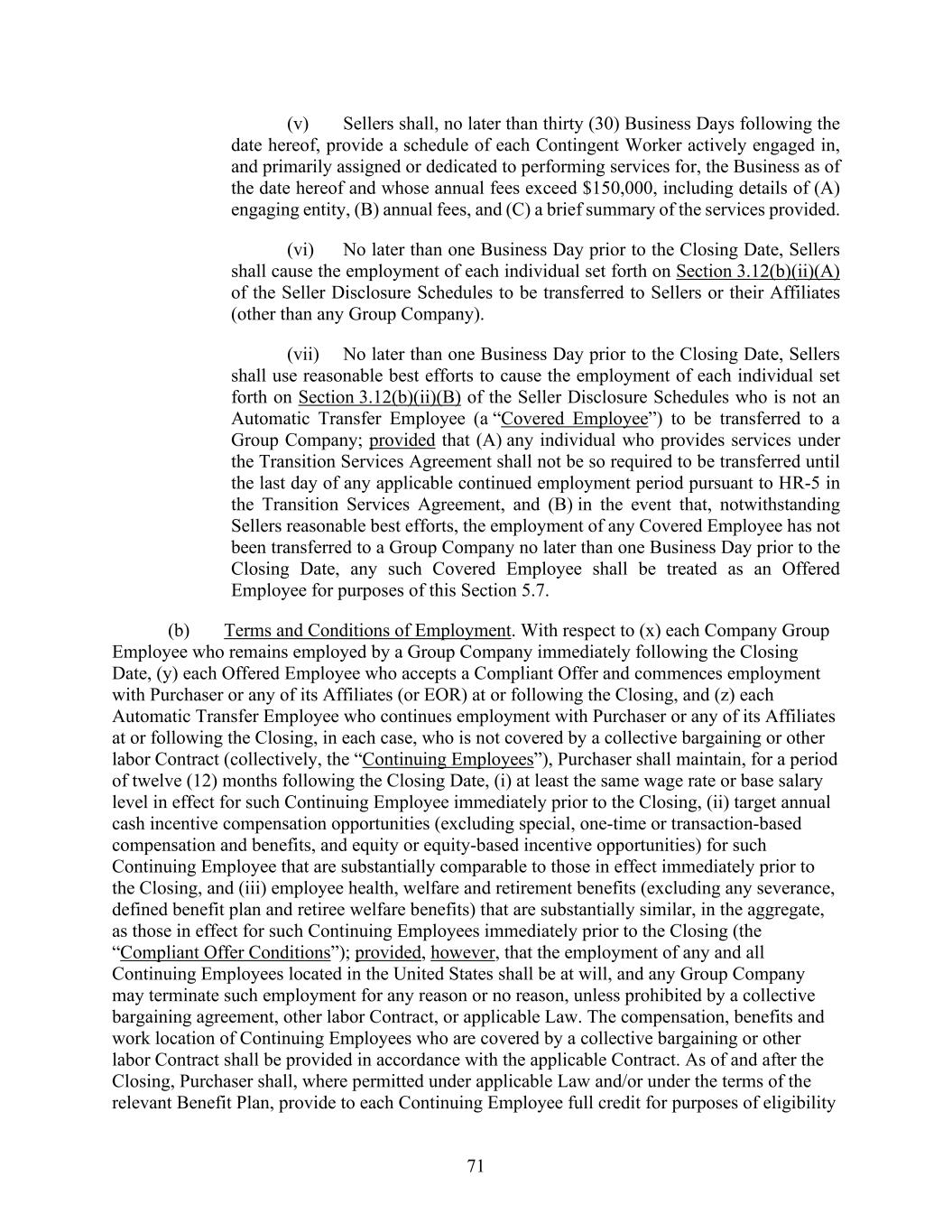 71 (v) Sellers shall, no later than thirty (30) Business Days following the date hereof, provide a schedule of each Contingent Worker actively engaged in, and primarily assigned or dedicated to performing services for, the Business as of the date hereof and whose annual fees exceed $150,000, including details of (A) engaging entity, (B) annual fees, and (C) a brief summary of the services provided. (vi) No later than one Business Day prior to the Closing Date, Sellers shall cause the employment of each individual set forth on Section 3.12(b)(ii)(A) of the Seller Disclosure Schedules to be transferred to Sellers or their Affiliates (other than any Group Company). (vii) No later than one Business Day prior to the Closing Date, Sellers shall use reasonable best efforts to cause the employment of each individual set forth on Section 3.12(b)(ii)(B) of the Seller Disclosure Schedules who is not an Automatic Transfer Employee (a “Covered Employee”) to be transferred to a Group Company; provided that (A) any individual who provides services under the Transition Services Agreement shall not be so required to be transferred until the last day of any applicable continued employment period pursuant to HR-5 in the Transition Services Agreement, and (B) in the event that, notwithstanding Sellers reasonable best efforts, the employment of any Covered Employee has not been transferred to a Group Company no later than one Business Day prior to the Closing Date, any such Covered Employee shall be treated as an Offered Employee for purposes of this Section 5.7. (b) Terms and Conditions of Employment. With respect to (x) each Company Group Employee who remains employed by a Group Company immediately following the Closing Date, (y) each Offered Employee who accepts a Compliant Offer and commences employment with Purchaser or any of its Affiliates (or EOR) at or following the Closing, and (z) each Automatic Transfer Employee who continues employment with Purchaser or any of its Affiliates at or following the Closing, in each case, who is not covered by a collective bargaining or other labor Contract (collectively, the “Continuing Employees”), Purchaser shall maintain, for a period of twelve (12) months following the Closing Date, (i) at least the same wage rate or base salary level in effect for such Continuing Employee immediately prior to the Closing, (ii) target annual cash incentive compensation opportunities (excluding special, one-time or transaction-based compensation and benefits, and equity or equity-based incentive opportunities) for such Continuing Employee that are substantially comparable to those in effect immediately prior to the Closing, and (iii) employee health, welfare and retirement benefits (excluding any severance, defined benefit plan and retiree welfare benefits) that are substantially similar, in the aggregate, as those in effect for such Continuing Employees immediately prior to the Closing (the “Compliant Offer Conditions”); provided, however, that the employment of any and all Continuing Employees located in the United States shall be at will, and any Group Company may terminate such employment for any reason or no reason, unless prohibited by a collective bargaining agreement, other labor Contract, or applicable Law. The compensation, benefits and work location of Continuing Employees who are covered by a collective bargaining or other labor Contract shall be provided in accordance with the applicable Contract. As of and after the Closing, Purchaser shall, where permitted under applicable Law and/or under the terms of the relevant Benefit Plan, provide to each Continuing Employee full credit for purposes of eligibility