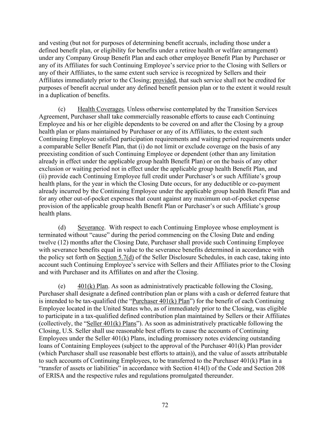 72 and vesting (but not for purposes of determining benefit accruals, including those under a defined benefit plan, or eligibility for benefits under a retiree health or welfare arrangement) under any Company Group Benefit Plan and each other employee Benefit Plan by Purchaser or any of its Affiliates for such Continuing Employee’s service prior to the Closing with Sellers or any of their Affiliates, to the same extent such service is recognized by Sellers and their Affiliates immediately prior to the Closing; provided, that such service shall not be credited for purposes of benefit accrual under any defined benefit pension plan or to the extent it would result in a duplication of benefits. (c) Health Coverages. Unless otherwise contemplated by the Transition Services Agreement, Purchaser shall take commercially reasonable efforts to cause each Continuing Employee and his or her eligible dependents to be covered on and after the Closing by a group health plan or plans maintained by Purchaser or any of its Affiliates, to the extent such Continuing Employee satisfied participation requirements and waiting period requirements under a comparable Seller Benefit Plan, that (i) do not limit or exclude coverage on the basis of any preexisting condition of such Continuing Employee or dependent (other than any limitation already in effect under the applicable group health Benefit Plan) or on the basis of any other exclusion or waiting period not in effect under the applicable group health Benefit Plan, and (ii) provide each Continuing Employee full credit under Purchaser’s or such Affiliate’s group health plans, for the year in which the Closing Date occurs, for any deductible or co-payment already incurred by the Continuing Employee under the applicable group health Benefit Plan and for any other out-of-pocket expenses that count against any maximum out-of-pocket expense provision of the applicable group health Benefit Plan or Purchaser’s or such Affiliate’s group health plans. (d) Severance. With respect to each Continuing Employee whose employment is terminated without “cause” during the period commencing on the Closing Date and ending twelve (12) months after the Closing Date, Purchaser shall provide such Continuing Employee with severance benefits equal in value to the severance benefits determined in accordance with the policy set forth on Section 5.7(d) of the Seller Disclosure Schedules, in each case, taking into account such Continuing Employee’s service with Sellers and their Affiliates prior to the Closing and with Purchaser and its Affiliates on and after the Closing. (e) 401(k) Plan. As soon as administratively practicable following the Closing, Purchaser shall designate a defined contribution plan or plans with a cash or deferred feature that is intended to be tax-qualified (the “Purchaser 401(k) Plan”) for the benefit of each Continuing Employee located in the United States who, as of immediately prior to the Closing, was eligible to participate in a tax-qualified defined contribution plan maintained by Sellers or their Affiliates (collectively, the “Seller 401(k) Plans”). As soon as administratively practicable following the Closing, U.S. Seller shall use reasonable best efforts to cause the accounts of Continuing Employees under the Seller 401(k) Plans, including promissory notes evidencing outstanding loans of Containing Employees (subject to the approval of the Purchaser 401(k) Plan provider (which Purchaser shall use reasonable best efforts to attain)), and the value of assets attributable to such accounts of Continuing Employees, to be transferred to the Purchaser 401(k) Plan in a “transfer of assets or liabilities” in accordance with Section 414(l) of the Code and Section 208 of ERISA and the respective rules and regulations promulgated thereunder.