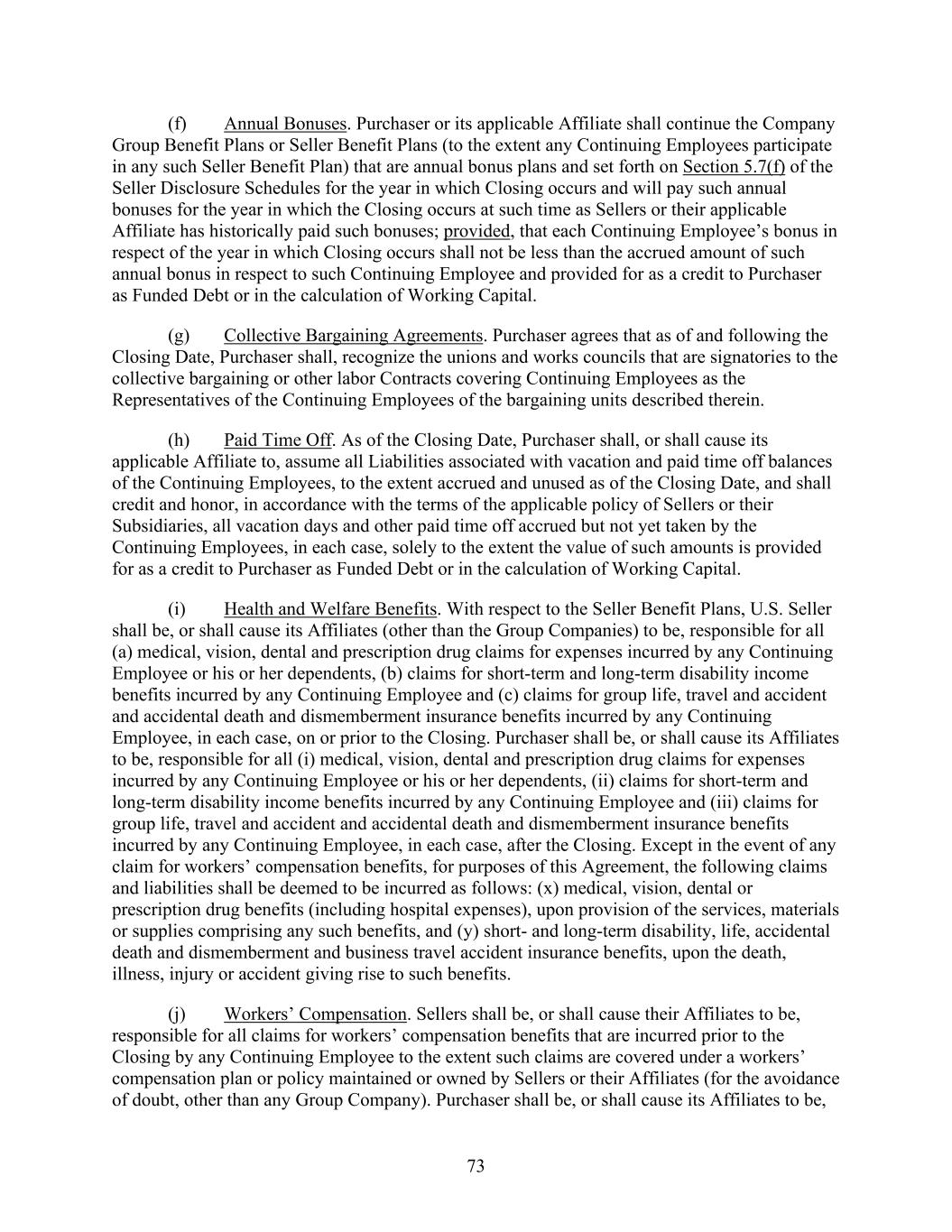 73 (f) Annual Bonuses. Purchaser or its applicable Affiliate shall continue the Company Group Benefit Plans or Seller Benefit Plans (to the extent any Continuing Employees participate in any such Seller Benefit Plan) that are annual bonus plans and set forth on Section 5.7(f) of the Seller Disclosure Schedules for the year in which Closing occurs and will pay such annual bonuses for the year in which the Closing occurs at such time as Sellers or their applicable Affiliate has historically paid such bonuses; provided, that each Continuing Employee’s bonus in respect of the year in which Closing occurs shall not be less than the accrued amount of such annual bonus in respect to such Continuing Employee and provided for as a credit to Purchaser as Funded Debt or in the calculation of Working Capital. (g) Collective Bargaining Agreements. Purchaser agrees that as of and following the Closing Date, Purchaser shall, recognize the unions and works councils that are signatories to the collective bargaining or other labor Contracts covering Continuing Employees as the Representatives of the Continuing Employees of the bargaining units described therein. (h) Paid Time Off. As of the Closing Date, Purchaser shall, or shall cause its applicable Affiliate to, assume all Liabilities associated with vacation and paid time off balances of the Continuing Employees, to the extent accrued and unused as of the Closing Date, and shall credit and honor, in accordance with the terms of the applicable policy of Sellers or their Subsidiaries, all vacation days and other paid time off accrued but not yet taken by the Continuing Employees, in each case, solely to the extent the value of such amounts is provided for as a credit to Purchaser as Funded Debt or in the calculation of Working Capital. (i) Health and Welfare Benefits. With respect to the Seller Benefit Plans, U.S. Seller shall be, or shall cause its Affiliates (other than the Group Companies) to be, responsible for all (a) medical, vision, dental and prescription drug claims for expenses incurred by any Continuing Employee or his or her dependents, (b) claims for short-term and long-term disability income benefits incurred by any Continuing Employee and (c) claims for group life, travel and accident and accidental death and dismemberment insurance benefits incurred by any Continuing Employee, in each case, on or prior to the Closing. Purchaser shall be, or shall cause its Affiliates to be, responsible for all (i) medical, vision, dental and prescription drug claims for expenses incurred by any Continuing Employee or his or her dependents, (ii) claims for short-term and long-term disability income benefits incurred by any Continuing Employee and (iii) claims for group life, travel and accident and accidental death and dismemberment insurance benefits incurred by any Continuing Employee, in each case, after the Closing. Except in the event of any claim for workers’ compensation benefits, for purposes of this Agreement, the following claims and liabilities shall be deemed to be incurred as follows: (x) medical, vision, dental or prescription drug benefits (including hospital expenses), upon provision of the services, materials or supplies comprising any such benefits, and (y) short- and long-term disability, life, accidental death and dismemberment and business travel accident insurance benefits, upon the death, illness, injury or accident giving rise to such benefits. (j) Workers’ Compensation. Sellers shall be, or shall cause their Affiliates to be, responsible for all claims for workers’ compensation benefits that are incurred prior to the Closing by any Continuing Employee to the extent such claims are covered under a workers’ compensation plan or policy maintained or owned by Sellers or their Affiliates (for the avoidance of doubt, other than any Group Company). Purchaser shall be, or shall cause its Affiliates to be,