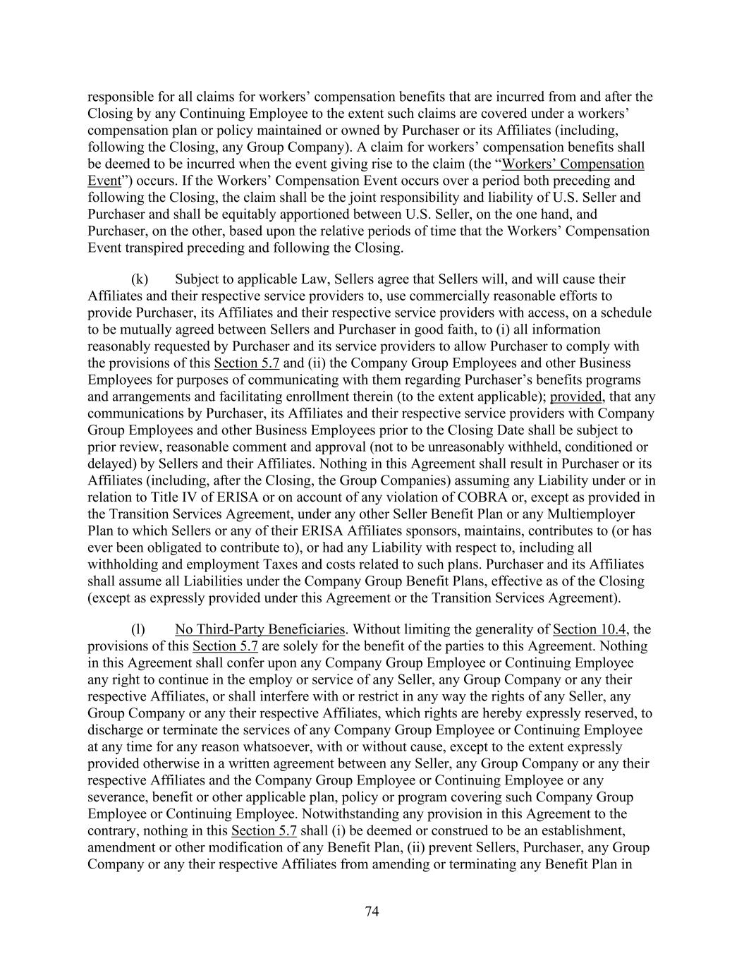 74 responsible for all claims for workers’ compensation benefits that are incurred from and after the Closing by any Continuing Employee to the extent such claims are covered under a workers’ compensation plan or policy maintained or owned by Purchaser or its Affiliates (including, following the Closing, any Group Company). A claim for workers’ compensation benefits shall be deemed to be incurred when the event giving rise to the claim (the “Workers’ Compensation Event”) occurs. If the Workers’ Compensation Event occurs over a period both preceding and following the Closing, the claim shall be the joint responsibility and liability of U.S. Seller and Purchaser and shall be equitably apportioned between U.S. Seller, on the one hand, and Purchaser, on the other, based upon the relative periods of time that the Workers’ Compensation Event transpired preceding and following the Closing. (k) Subject to applicable Law, Sellers agree that Sellers will, and will cause their Affiliates and their respective service providers to, use commercially reasonable efforts to provide Purchaser, its Affiliates and their respective service providers with access, on a schedule to be mutually agreed between Sellers and Purchaser in good faith, to (i) all information reasonably requested by Purchaser and its service providers to allow Purchaser to comply with the provisions of this Section 5.7 and (ii) the Company Group Employees and other Business Employees for purposes of communicating with them regarding Purchaser’s benefits programs and arrangements and facilitating enrollment therein (to the extent applicable); provided, that any communications by Purchaser, its Affiliates and their respective service providers with Company Group Employees and other Business Employees prior to the Closing Date shall be subject to prior review, reasonable comment and approval (not to be unreasonably withheld, conditioned or delayed) by Sellers and their Affiliates. Nothing in this Agreement shall result in Purchaser or its Affiliates (including, after the Closing, the Group Companies) assuming any Liability under or in relation to Title IV of ERISA or on account of any violation of COBRA or, except as provided in the Transition Services Agreement, under any other Seller Benefit Plan or any Multiemployer Plan to which Sellers or any of their ERISA Affiliates sponsors, maintains, contributes to (or has ever been obligated to contribute to), or had any Liability with respect to, including all withholding and employment Taxes and costs related to such plans. Purchaser and its Affiliates shall assume all Liabilities under the Company Group Benefit Plans, effective as of the Closing (except as expressly provided under this Agreement or the Transition Services Agreement). (l) No Third-Party Beneficiaries. Without limiting the generality of Section 10.4, the provisions of this Section 5.7 are solely for the benefit of the parties to this Agreement. Nothing in this Agreement shall confer upon any Company Group Employee or Continuing Employee any right to continue in the employ or service of any Seller, any Group Company or any their respective Affiliates, or shall interfere with or restrict in any way the rights of any Seller, any Group Company or any their respective Affiliates, which rights are hereby expressly reserved, to discharge or terminate the services of any Company Group Employee or Continuing Employee at any time for any reason whatsoever, with or without cause, except to the extent expressly provided otherwise in a written agreement between any Seller, any Group Company or any their respective Affiliates and the Company Group Employee or Continuing Employee or any severance, benefit or other applicable plan, policy or program covering such Company Group Employee or Continuing Employee. Notwithstanding any provision in this Agreement to the contrary, nothing in this Section 5.7 shall (i) be deemed or construed to be an establishment, amendment or other modification of any Benefit Plan, (ii) prevent Sellers, Purchaser, any Group Company or any their respective Affiliates from amending or terminating any Benefit Plan in