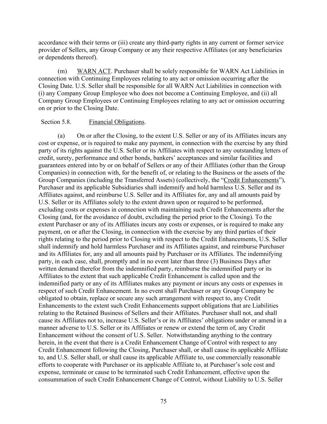 75 accordance with their terms or (iii) create any third-party rights in any current or former service provider of Sellers, any Group Company or any their respective Affiliates (or any beneficiaries or dependents thereof). (m) WARN ACT. Purchaser shall be solely responsible for WARN Act Liabilities in connection with Continuing Employees relating to any act or omission occurring after the Closing Date. U.S. Seller shall be responsible for all WARN Act Liabilities in connection with (i) any Company Group Employee who does not become a Continuing Employee, and (ii) all Company Group Employees or Continuing Employees relating to any act or omission occurring on or prior to the Closing Date. Section 5.8. Financial Obligations. (a) On or after the Closing, to the extent U.S. Seller or any of its Affiliates incurs any cost or expense, or is required to make any payment, in connection with the exercise by any third party of its rights against the U.S. Seller or its Affiliates with respect to any outstanding letters of credit, surety, performance and other bonds, bankers’ acceptances and similar facilities and guarantees entered into by or on behalf of Sellers or any of their Affiliates (other than the Group Companies) in connection with, for the benefit of, or relating to the Business or the assets of the Group Companies (including the Transferred Assets) (collectively, the “Credit Enhancements”), Purchaser and its applicable Subsidiaries shall indemnify and hold harmless U.S. Seller and its Affiliates against, and reimburse U.S. Seller and its Affiliates for, any and all amounts paid by U.S. Seller or its Affiliates solely to the extent drawn upon or required to be performed, excluding costs or expenses in connection with maintaining such Credit Enhancements after the Closing (and, for the avoidance of doubt, excluding the period prior to the Closing). To the extent Purchaser or any of its Affiliates incurs any costs or expenses, or is required to make any payment, on or after the Closing, in connection with the exercise by any third parties of their rights relating to the period prior to Closing with respect to the Credit Enhancements, U.S. Seller shall indemnify and hold harmless Purchaser and its Affiliates against, and reimburse Purchaser and its Affiliates for, any and all amounts paid by Purchaser or its Affiliates. The indemnifying party, in each case, shall, promptly and in no event later than three (3) Business Days after written demand therefor from the indemnified party, reimburse the indemnified party or its Affiliates to the extent that such applicable Credit Enhancement is called upon and the indemnified party or any of its Affiliates makes any payment or incurs any costs or expenses in respect of such Credit Enhancement. In no event shall Purchaser or any Group Company be obligated to obtain, replace or secure any such arrangement with respect to, any Credit Enhancements to the extent such Credit Enhancements support obligations that are Liabilities relating to the Retained Business of Sellers and their Affiliates. Purchaser shall not, and shall cause its Affiliates not to, increase U.S. Seller’s or its Affiliates’ obligations under or amend in a manner adverse to U.S. Seller or its Affiliates or renew or extend the term of, any Credit Enhancement without the consent of U.S. Seller. Notwithstanding anything to the contrary herein, in the event that there is a Credit Enhancement Change of Control with respect to any Credit Enhancement following the Closing, Purchaser shall, or shall cause its applicable Affiliate to, and U.S. Seller shall, or shall cause its applicable Affiliate to, use commercially reasonable efforts to cooperate with Purchaser or its applicable Affiliate to, at Purchaser’s sole cost and expense, terminate or cause to be terminated such Credit Enhancement, effective upon the consummation of such Credit Enhancement Change of Control, without Liability to U.S. Seller
