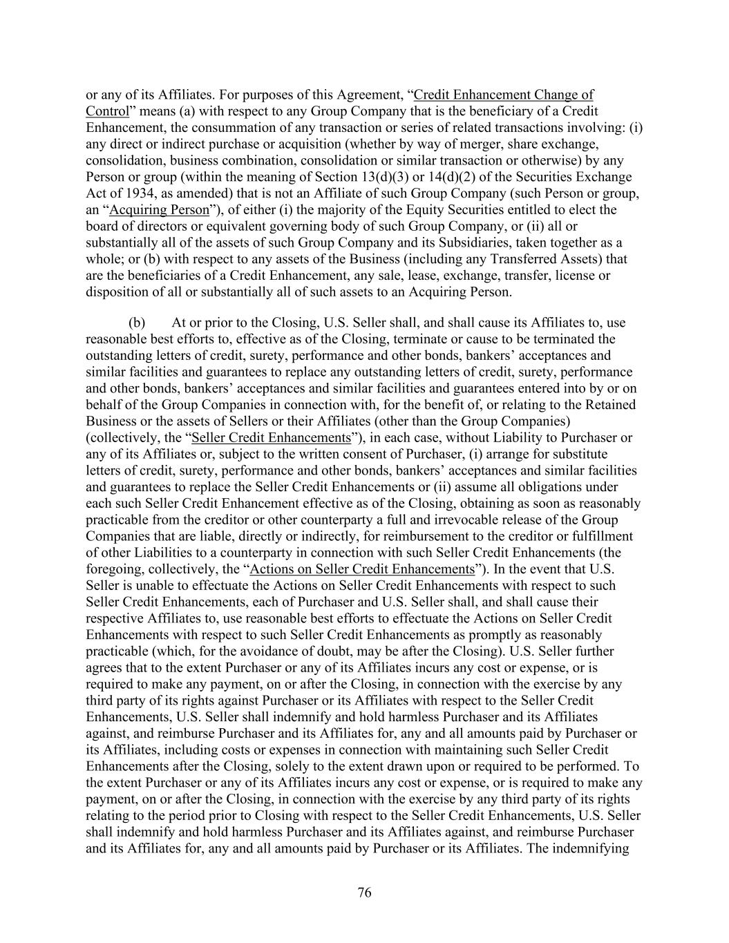 76 or any of its Affiliates. For purposes of this Agreement, “Credit Enhancement Change of Control” means (a) with respect to any Group Company that is the beneficiary of a Credit Enhancement, the consummation of any transaction or series of related transactions involving: (i) any direct or indirect purchase or acquisition (whether by way of merger, share exchange, consolidation, business combination, consolidation or similar transaction or otherwise) by any Person or group (within the meaning of Section 13(d)(3) or 14(d)(2) of the Securities Exchange Act of 1934, as amended) that is not an Affiliate of such Group Company (such Person or group, an “Acquiring Person”), of either (i) the majority of the Equity Securities entitled to elect the board of directors or equivalent governing body of such Group Company, or (ii) all or substantially all of the assets of such Group Company and its Subsidiaries, taken together as a whole; or (b) with respect to any assets of the Business (including any Transferred Assets) that are the beneficiaries of a Credit Enhancement, any sale, lease, exchange, transfer, license or disposition of all or substantially all of such assets to an Acquiring Person. (b) At or prior to the Closing, U.S. Seller shall, and shall cause its Affiliates to, use reasonable best efforts to, effective as of the Closing, terminate or cause to be terminated the outstanding letters of credit, surety, performance and other bonds, bankers’ acceptances and similar facilities and guarantees to replace any outstanding letters of credit, surety, performance and other bonds, bankers’ acceptances and similar facilities and guarantees entered into by or on behalf of the Group Companies in connection with, for the benefit of, or relating to the Retained Business or the assets of Sellers or their Affiliates (other than the Group Companies) (collectively, the “Seller Credit Enhancements”), in each case, without Liability to Purchaser or any of its Affiliates or, subject to the written consent of Purchaser, (i) arrange for substitute letters of credit, surety, performance and other bonds, bankers’ acceptances and similar facilities and guarantees to replace the Seller Credit Enhancements or (ii) assume all obligations under each such Seller Credit Enhancement effective as of the Closing, obtaining as soon as reasonably practicable from the creditor or other counterparty a full and irrevocable release of the Group Companies that are liable, directly or indirectly, for reimbursement to the creditor or fulfillment of other Liabilities to a counterparty in connection with such Seller Credit Enhancements (the foregoing, collectively, the “Actions on Seller Credit Enhancements”). In the event that U.S. Seller is unable to effectuate the Actions on Seller Credit Enhancements with respect to such Seller Credit Enhancements, each of Purchaser and U.S. Seller shall, and shall cause their respective Affiliates to, use reasonable best efforts to effectuate the Actions on Seller Credit Enhancements with respect to such Seller Credit Enhancements as promptly as reasonably practicable (which, for the avoidance of doubt, may be after the Closing). U.S. Seller further agrees that to the extent Purchaser or any of its Affiliates incurs any cost or expense, or is required to make any payment, on or after the Closing, in connection with the exercise by any third party of its rights against Purchaser or its Affiliates with respect to the Seller Credit Enhancements, U.S. Seller shall indemnify and hold harmless Purchaser and its Affiliates against, and reimburse Purchaser and its Affiliates for, any and all amounts paid by Purchaser or its Affiliates, including costs or expenses in connection with maintaining such Seller Credit Enhancements after the Closing, solely to the extent drawn upon or required to be performed. To the extent Purchaser or any of its Affiliates incurs any cost or expense, or is required to make any payment, on or after the Closing, in connection with the exercise by any third party of its rights relating to the period prior to Closing with respect to the Seller Credit Enhancements, U.S. Seller shall indemnify and hold harmless Purchaser and its Affiliates against, and reimburse Purchaser and its Affiliates for, any and all amounts paid by Purchaser or its Affiliates. The indemnifying