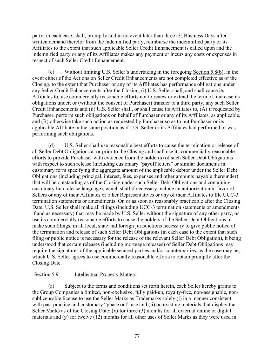 77 party, in each case, shall, promptly and in no event later than three (3) Business Days after written demand therefor from the indemnified party, reimburse the indemnified party or its Affiliates to the extent that such applicable Seller Credit Enhancement is called upon and the indemnified party or any of its Affiliates makes any payment or incurs any costs or expenses in respect of such Seller Credit Enhancement. (c) Without limiting U.S. Seller’s undertaking in the foregoing Section 5.8(b), in the event either of the Actions on Seller Credit Enhancements are not completed effective as of the Closing, to the extent that Purchaser or any of its Affiliates has performance obligations under any Seller Credit Enhancements after the Closing, (i) U.S. Seller shall, and shall cause its Affiliates to, use commercially reasonable efforts not to renew or extend the term of, increase its obligations under, or (without the consent of Purchaser) transfer to a third party, any such Seller Credit Enhancements and (ii) U.S. Seller shall, or shall cause its Affiliates to, (A) if requested by Purchaser, perform such obligations on behalf of Purchaser or any of its Affiliates, as applicable, and (B) otherwise take such action as requested by Purchaser so as to put Purchaser or its applicable Affiliate in the same position as if U.S. Seller or its Affiliates had performed or was performing such obligations. (d) U.S. Seller shall use reasonable best efforts to cause the termination or release of all Seller Debt Obligations at or prior to the Closing and shall use its commercially reasonable efforts to provide Purchaser with evidence from the holder(s) of such Seller Debt Obligations with respect to such release (including customary “payoff letters” or similar documents in customary form specifying the aggregate amount of the applicable debtor under the Seller Debt Obligations (including principal, interest, fees, expenses and other amounts payable thereunder) that will be outstanding as of the Closing under such Seller Debt Obligations and containing customary lien release language), which shall if necessary include an authorization in favor of Sellers or any of their Affiliates or other Representatives or any of their Affiliates to file UCC-3 termination statements or amendments. On or as soon as reasonably practicable after the Closing Date, U.S. Seller shall make all filings (including UCC-3 termination statements or amendments if and as necessary) that may be made by U.S. Seller without the signature of any other party, or use its commercially reasonable efforts to cause the holders of the Seller Debt Obligations to make such filings, in all local, state and foreign jurisdictions necessary to give public notice of the termination and release of such Seller Debt Obligations (in each case to the extent that such filing or public notice is necessary for the release of the relevant Seller Debt Obligation), it being understood that certain releases (including mortgage releases) of Seller Debt Obligations may require the signatures of the applicable secured parties and/or counterparties, as the case may be, which U.S. Seller agrees to use commercially reasonable efforts to obtain promptly after the Closing Date. Section 5.9. Intellectual Property Matters. (a) Subject to the terms and conditions set forth herein, each Seller hereby grants to the Group Companies a limited, non-exclusive, fully paid-up, royalty-free, non-assignable, non- sublicensable license to use the Seller Marks as Trademarks solely (i) in a manner consistent with past practice and customary “phase out” use and (ii) on existing materials that display the Seller Marks as of the Closing Date: (x) for three (3) months for all external online or digital materials and (y) for twelve (12) months for all other uses of Seller Marks as they were used in