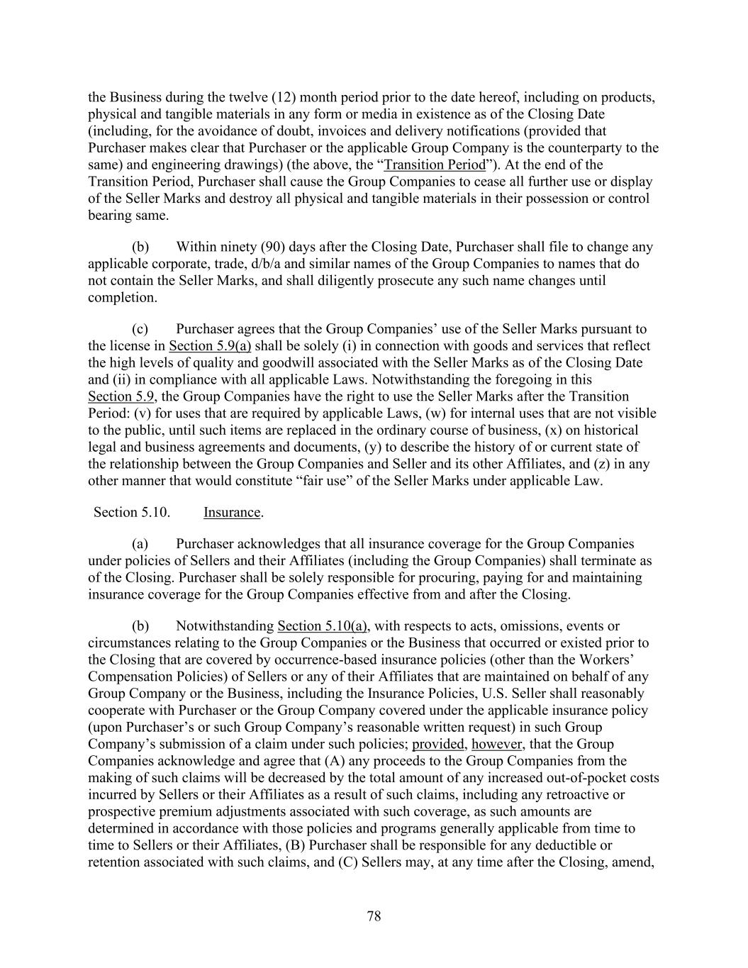 78 the Business during the twelve (12) month period prior to the date hereof, including on products, physical and tangible materials in any form or media in existence as of the Closing Date (including, for the avoidance of doubt, invoices and delivery notifications (provided that Purchaser makes clear that Purchaser or the applicable Group Company is the counterparty to the same) and engineering drawings) (the above, the “Transition Period”). At the end of the Transition Period, Purchaser shall cause the Group Companies to cease all further use or display of the Seller Marks and destroy all physical and tangible materials in their possession or control bearing same. (b) Within ninety (90) days after the Closing Date, Purchaser shall file to change any applicable corporate, trade, d/b/a and similar names of the Group Companies to names that do not contain the Seller Marks, and shall diligently prosecute any such name changes until completion. (c) Purchaser agrees that the Group Companies’ use of the Seller Marks pursuant to the license in Section 5.9(a) shall be solely (i) in connection with goods and services that reflect the high levels of quality and goodwill associated with the Seller Marks as of the Closing Date and (ii) in compliance with all applicable Laws. Notwithstanding the foregoing in this Section 5.9, the Group Companies have the right to use the Seller Marks after the Transition Period: (v) for uses that are required by applicable Laws, (w) for internal uses that are not visible to the public, until such items are replaced in the ordinary course of business, (x) on historical legal and business agreements and documents, (y) to describe the history of or current state of the relationship between the Group Companies and Seller and its other Affiliates, and (z) in any other manner that would constitute “fair use” of the Seller Marks under applicable Law. Section 5.10. Insurance. (a) Purchaser acknowledges that all insurance coverage for the Group Companies under policies of Sellers and their Affiliates (including the Group Companies) shall terminate as of the Closing. Purchaser shall be solely responsible for procuring, paying for and maintaining insurance coverage for the Group Companies effective from and after the Closing. (b) Notwithstanding Section 5.10(a), with respects to acts, omissions, events or circumstances relating to the Group Companies or the Business that occurred or existed prior to the Closing that are covered by occurrence-based insurance policies (other than the Workers’ Compensation Policies) of Sellers or any of their Affiliates that are maintained on behalf of any Group Company or the Business, including the Insurance Policies, U.S. Seller shall reasonably cooperate with Purchaser or the Group Company covered under the applicable insurance policy (upon Purchaser’s or such Group Company’s reasonable written request) in such Group Company’s submission of a claim under such policies; provided, however, that the Group Companies acknowledge and agree that (A) any proceeds to the Group Companies from the making of such claims will be decreased by the total amount of any increased out-of-pocket costs incurred by Sellers or their Affiliates as a result of such claims, including any retroactive or prospective premium adjustments associated with such coverage, as such amounts are determined in accordance with those policies and programs generally applicable from time to time to Sellers or their Affiliates, (B) Purchaser shall be responsible for any deductible or retention associated with such claims, and (C) Sellers may, at any time after the Closing, amend,