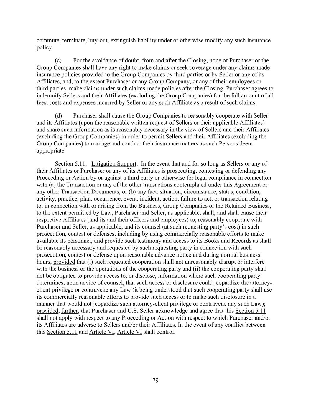79 commute, terminate, buy-out, extinguish liability under or otherwise modify any such insurance policy. (c) For the avoidance of doubt, from and after the Closing, none of Purchaser or the Group Companies shall have any right to make claims or seek coverage under any claims-made insurance policies provided to the Group Companies by third parties or by Seller or any of its Affiliates, and, to the extent Purchaser or any Group Company, or any of their employees or third parties, make claims under such claims-made policies after the Closing, Purchaser agrees to indemnify Sellers and their Affiliates (excluding the Group Companies) for the full amount of all fees, costs and expenses incurred by Seller or any such Affiliate as a result of such claims. (d) Purchaser shall cause the Group Companies to reasonably cooperate with Seller and its Affiliates (upon the reasonable written request of Sellers or their applicable Affiliates) and share such information as is reasonably necessary in the view of Sellers and their Affiliates (excluding the Group Companies) in order to permit Sellers and their Affiliates (excluding the Group Companies) to manage and conduct their insurance matters as such Persons deem appropriate. Section 5.11. Litigation Support. In the event that and for so long as Sellers or any of their Affiliates or Purchaser or any of its Affiliates is prosecuting, contesting or defending any Proceeding or Action by or against a third party or otherwise for legal compliance in connection with (a) the Transaction or any of the other transactions contemplated under this Agreement or any other Transaction Documents, or (b) any fact, situation, circumstance, status, condition, activity, practice, plan, occurrence, event, incident, action, failure to act, or transaction relating to, in connection with or arising from the Business, Group Companies or the Retained Business, to the extent permitted by Law, Purchaser and Seller, as applicable, shall, and shall cause their respective Affiliates (and its and their officers and employees) to, reasonably cooperate with Purchaser and Seller, as applicable, and its counsel (at such requesting party’s cost) in such prosecution, contest or defenses, including by using commercially reasonable efforts to make available its personnel, and provide such testimony and access to its Books and Records as shall be reasonably necessary and requested by such requesting party in connection with such prosecution, contest or defense upon reasonable advance notice and during normal business hours; provided that (i) such requested cooperation shall not unreasonably disrupt or interfere with the business or the operations of the cooperating party and (ii) the cooperating party shall not be obligated to provide access to, or disclose, information where such cooperating party determines, upon advice of counsel, that such access or disclosure could jeopardize the attorney- client privilege or contravene any Law (it being understood that such cooperating party shall use its commercially reasonable efforts to provide such access or to make such disclosure in a manner that would not jeopardize such attorney-client privilege or contravene any such Law); provided, further, that Purchaser and U.S. Seller acknowledge and agree that this Section 5.11 shall not apply with respect to any Proceeding or Action with respect to which Purchaser and/or its Affiliates are adverse to Sellers and/or their Affiliates. In the event of any conflict between this Section 5.11 and Article VI, Article VI shall control.