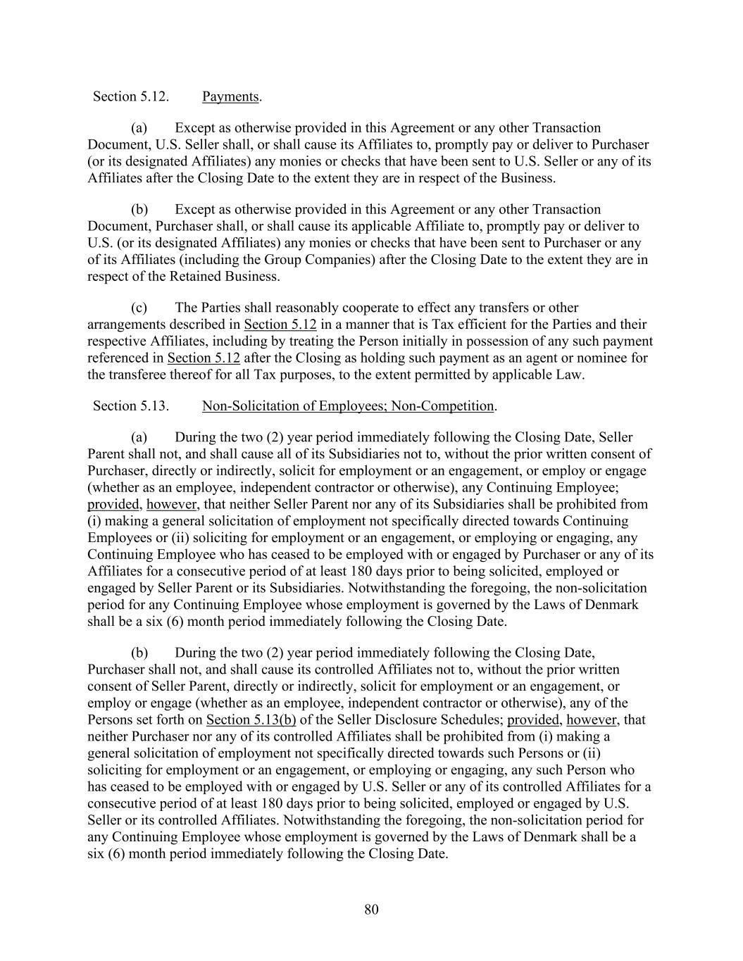 80 Section 5.12. Payments. (a) Except as otherwise provided in this Agreement or any other Transaction Document, U.S. Seller shall, or shall cause its Affiliates to, promptly pay or deliver to Purchaser (or its designated Affiliates) any monies or checks that have been sent to U.S. Seller or any of its Affiliates after the Closing Date to the extent they are in respect of the Business. (b) Except as otherwise provided in this Agreement or any other Transaction Document, Purchaser shall, or shall cause its applicable Affiliate to, promptly pay or deliver to U.S. (or its designated Affiliates) any monies or checks that have been sent to Purchaser or any of its Affiliates (including the Group Companies) after the Closing Date to the extent they are in respect of the Retained Business. (c) The Parties shall reasonably cooperate to effect any transfers or other arrangements described in Section 5.12 in a manner that is Tax efficient for the Parties and their respective Affiliates, including by treating the Person initially in possession of any such payment referenced in Section 5.12 after the Closing as holding such payment as an agent or nominee for the transferee thereof for all Tax purposes, to the extent permitted by applicable Law. Section 5.13. Non-Solicitation of Employees; Non-Competition. (a) During the two (2) year period immediately following the Closing Date, Seller Parent shall not, and shall cause all of its Subsidiaries not to, without the prior written consent of Purchaser, directly or indirectly, solicit for employment or an engagement, or employ or engage (whether as an employee, independent contractor or otherwise), any Continuing Employee; provided, however, that neither Seller Parent nor any of its Subsidiaries shall be prohibited from (i) making a general solicitation of employment not specifically directed towards Continuing Employees or (ii) soliciting for employment or an engagement, or employing or engaging, any Continuing Employee who has ceased to be employed with or engaged by Purchaser or any of its Affiliates for a consecutive period of at least 180 days prior to being solicited, employed or engaged by Seller Parent or its Subsidiaries. Notwithstanding the foregoing, the non-solicitation period for any Continuing Employee whose employment is governed by the Laws of Denmark shall be a six (6) month period immediately following the Closing Date. (b) During the two (2) year period immediately following the Closing Date, Purchaser shall not, and shall cause its controlled Affiliates not to, without the prior written consent of Seller Parent, directly or indirectly, solicit for employment or an engagement, or employ or engage (whether as an employee, independent contractor or otherwise), any of the Persons set forth on Section 5.13(b) of the Seller Disclosure Schedules; provided, however, that neither Purchaser nor any of its controlled Affiliates shall be prohibited from (i) making a general solicitation of employment not specifically directed towards such Persons or (ii) soliciting for employment or an engagement, or employing or engaging, any such Person who has ceased to be employed with or engaged by U.S. Seller or any of its controlled Affiliates for a consecutive period of at least 180 days prior to being solicited, employed or engaged by U.S. Seller or its controlled Affiliates. Notwithstanding the foregoing, the non-solicitation period for any Continuing Employee whose employment is governed by the Laws of Denmark shall be a six (6) month period immediately following the Closing Date.