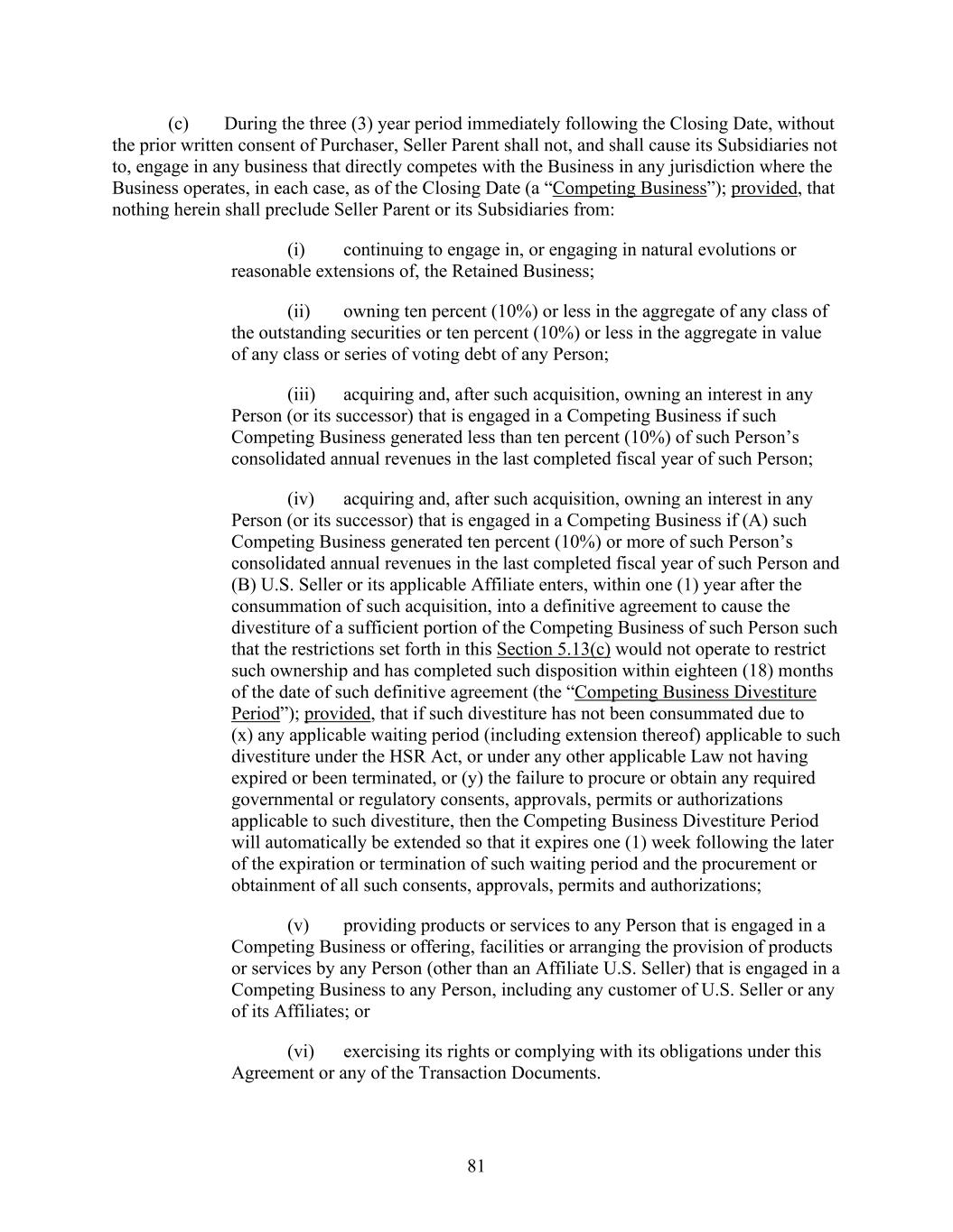 81 (c) During the three (3) year period immediately following the Closing Date, without the prior written consent of Purchaser, Seller Parent shall not, and shall cause its Subsidiaries not to, engage in any business that directly competes with the Business in any jurisdiction where the Business operates, in each case, as of the Closing Date (a “Competing Business”); provided, that nothing herein shall preclude Seller Parent or its Subsidiaries from: (i) continuing to engage in, or engaging in natural evolutions or reasonable extensions of, the Retained Business; (ii) owning ten percent (10%) or less in the aggregate of any class of the outstanding securities or ten percent (10%) or less in the aggregate in value of any class or series of voting debt of any Person; (iii) acquiring and, after such acquisition, owning an interest in any Person (or its successor) that is engaged in a Competing Business if such Competing Business generated less than ten percent (10%) of such Person’s consolidated annual revenues in the last completed fiscal year of such Person; (iv) acquiring and, after such acquisition, owning an interest in any Person (or its successor) that is engaged in a Competing Business if (A) such Competing Business generated ten percent (10%) or more of such Person’s consolidated annual revenues in the last completed fiscal year of such Person and (B) U.S. Seller or its applicable Affiliate enters, within one (1) year after the consummation of such acquisition, into a definitive agreement to cause the divestiture of a sufficient portion of the Competing Business of such Person such that the restrictions set forth in this Section 5.13(c) would not operate to restrict such ownership and has completed such disposition within eighteen (18) months of the date of such definitive agreement (the “Competing Business Divestiture Period”); provided, that if such divestiture has not been consummated due to (x) any applicable waiting period (including extension thereof) applicable to such divestiture under the HSR Act, or under any other applicable Law not having expired or been terminated, or (y) the failure to procure or obtain any required governmental or regulatory consents, approvals, permits or authorizations applicable to such divestiture, then the Competing Business Divestiture Period will automatically be extended so that it expires one (1) week following the later of the expiration or termination of such waiting period and the procurement or obtainment of all such consents, approvals, permits and authorizations; (v) providing products or services to any Person that is engaged in a Competing Business or offering, facilities or arranging the provision of products or services by any Person (other than an Affiliate U.S. Seller) that is engaged in a Competing Business to any Person, including any customer of U.S. Seller or any of its Affiliates; or (vi) exercising its rights or complying with its obligations under this Agreement or any of the Transaction Documents.