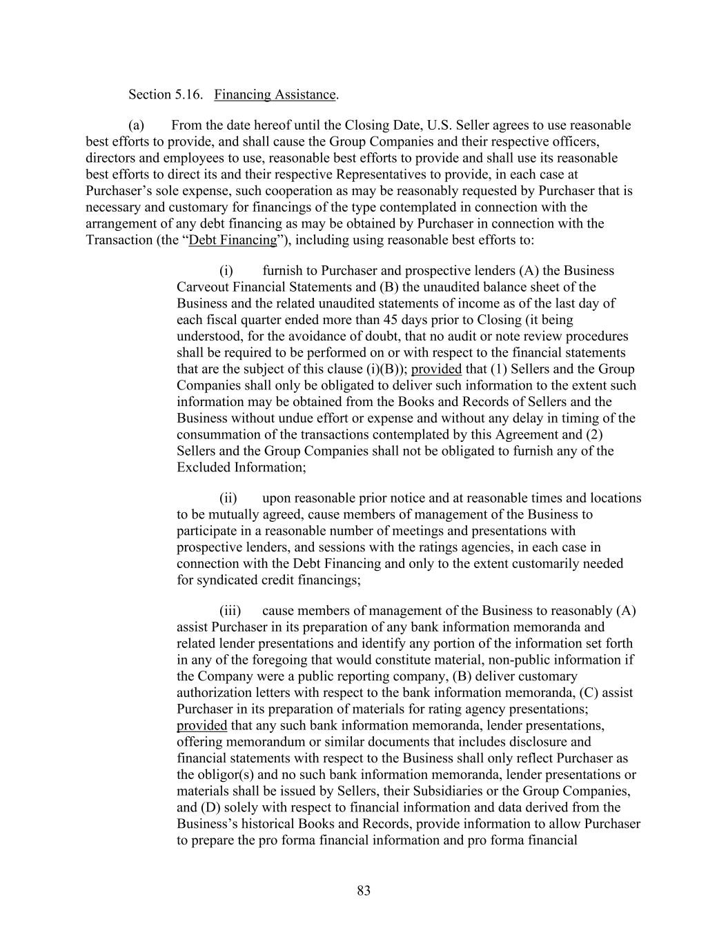 83 Section 5.16. Financing Assistance. (a) From the date hereof until the Closing Date, U.S. Seller agrees to use reasonable best efforts to provide, and shall cause the Group Companies and their respective officers, directors and employees to use, reasonable best efforts to provide and shall use its reasonable best efforts to direct its and their respective Representatives to provide, in each case at Purchaser’s sole expense, such cooperation as may be reasonably requested by Purchaser that is necessary and customary for financings of the type contemplated in connection with the arrangement of any debt financing as may be obtained by Purchaser in connection with the Transaction (the “Debt Financing”), including using reasonable best efforts to: (i) furnish to Purchaser and prospective lenders (A) the Business Carveout Financial Statements and (B) the unaudited balance sheet of the Business and the related unaudited statements of income as of the last day of each fiscal quarter ended more than 45 days prior to Closing (it being understood, for the avoidance of doubt, that no audit or note review procedures shall be required to be performed on or with respect to the financial statements that are the subject of this clause (i)(B)); provided that (1) Sellers and the Group Companies shall only be obligated to deliver such information to the extent such information may be obtained from the Books and Records of Sellers and the Business without undue effort or expense and without any delay in timing of the consummation of the transactions contemplated by this Agreement and (2) Sellers and the Group Companies shall not be obligated to furnish any of the Excluded Information; (ii) upon reasonable prior notice and at reasonable times and locations to be mutually agreed, cause members of management of the Business to participate in a reasonable number of meetings and presentations with prospective lenders, and sessions with the ratings agencies, in each case in connection with the Debt Financing and only to the extent customarily needed for syndicated credit financings; (iii) cause members of management of the Business to reasonably (A) assist Purchaser in its preparation of any bank information memoranda and related lender presentations and identify any portion of the information set forth in any of the foregoing that would constitute material, non-public information if the Company were a public reporting company, (B) deliver customary authorization letters with respect to the bank information memoranda, (C) assist Purchaser in its preparation of materials for rating agency presentations; provided that any such bank information memoranda, lender presentations, offering memorandum or similar documents that includes disclosure and financial statements with respect to the Business shall only reflect Purchaser as the obligor(s) and no such bank information memoranda, lender presentations or materials shall be issued by Sellers, their Subsidiaries or the Group Companies, and (D) solely with respect to financial information and data derived from the Business’s historical Books and Records, provide information to allow Purchaser to prepare the pro forma financial information and pro forma financial