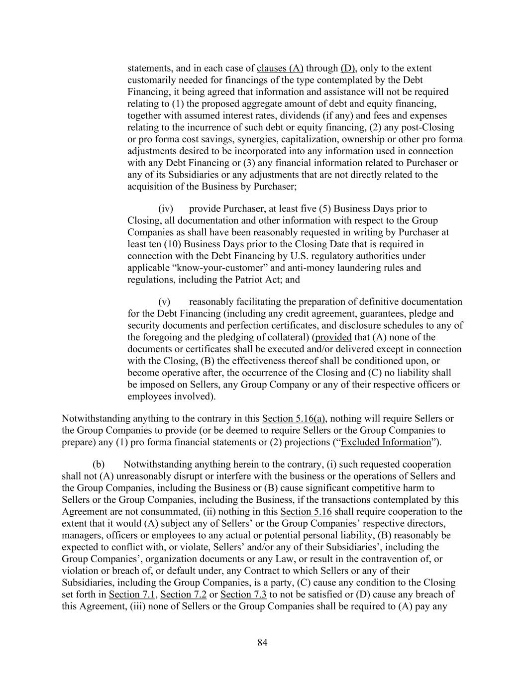 84 statements, and in each case of clauses (A) through (D), only to the extent customarily needed for financings of the type contemplated by the Debt Financing, it being agreed that information and assistance will not be required relating to (1) the proposed aggregate amount of debt and equity financing, together with assumed interest rates, dividends (if any) and fees and expenses relating to the incurrence of such debt or equity financing, (2) any post-Closing or pro forma cost savings, synergies, capitalization, ownership or other pro forma adjustments desired to be incorporated into any information used in connection with any Debt Financing or (3) any financial information related to Purchaser or any of its Subsidiaries or any adjustments that are not directly related to the acquisition of the Business by Purchaser; (iv) provide Purchaser, at least five (5) Business Days prior to Closing, all documentation and other information with respect to the Group Companies as shall have been reasonably requested in writing by Purchaser at least ten (10) Business Days prior to the Closing Date that is required in connection with the Debt Financing by U.S. regulatory authorities under applicable “know-your-customer” and anti-money laundering rules and regulations, including the Patriot Act; and (v) reasonably facilitating the preparation of definitive documentation for the Debt Financing (including any credit agreement, guarantees, pledge and security documents and perfection certificates, and disclosure schedules to any of the foregoing and the pledging of collateral) (provided that (A) none of the documents or certificates shall be executed and/or delivered except in connection with the Closing, (B) the effectiveness thereof shall be conditioned upon, or become operative after, the occurrence of the Closing and (C) no liability shall be imposed on Sellers, any Group Company or any of their respective officers or employees involved). Notwithstanding anything to the contrary in this Section 5.16(a), nothing will require Sellers or the Group Companies to provide (or be deemed to require Sellers or the Group Companies to prepare) any (1) pro forma financial statements or (2) projections (“Excluded Information”). (b) Notwithstanding anything herein to the contrary, (i) such requested cooperation shall not (A) unreasonably disrupt or interfere with the business or the operations of Sellers and the Group Companies, including the Business or (B) cause significant competitive harm to Sellers or the Group Companies, including the Business, if the transactions contemplated by this Agreement are not consummated, (ii) nothing in this Section 5.16 shall require cooperation to the extent that it would (A) subject any of Sellers’ or the Group Companies’ respective directors, managers, officers or employees to any actual or potential personal liability, (B) reasonably be expected to conflict with, or violate, Sellers’ and/or any of their Subsidiaries’, including the Group Companies’, organization documents or any Law, or result in the contravention of, or violation or breach of, or default under, any Contract to which Sellers or any of their Subsidiaries, including the Group Companies, is a party, (C) cause any condition to the Closing set forth in Section 7.1, Section 7.2 or Section 7.3 to not be satisfied or (D) cause any breach of this Agreement, (iii) none of Sellers or the Group Companies shall be required to (A) pay any