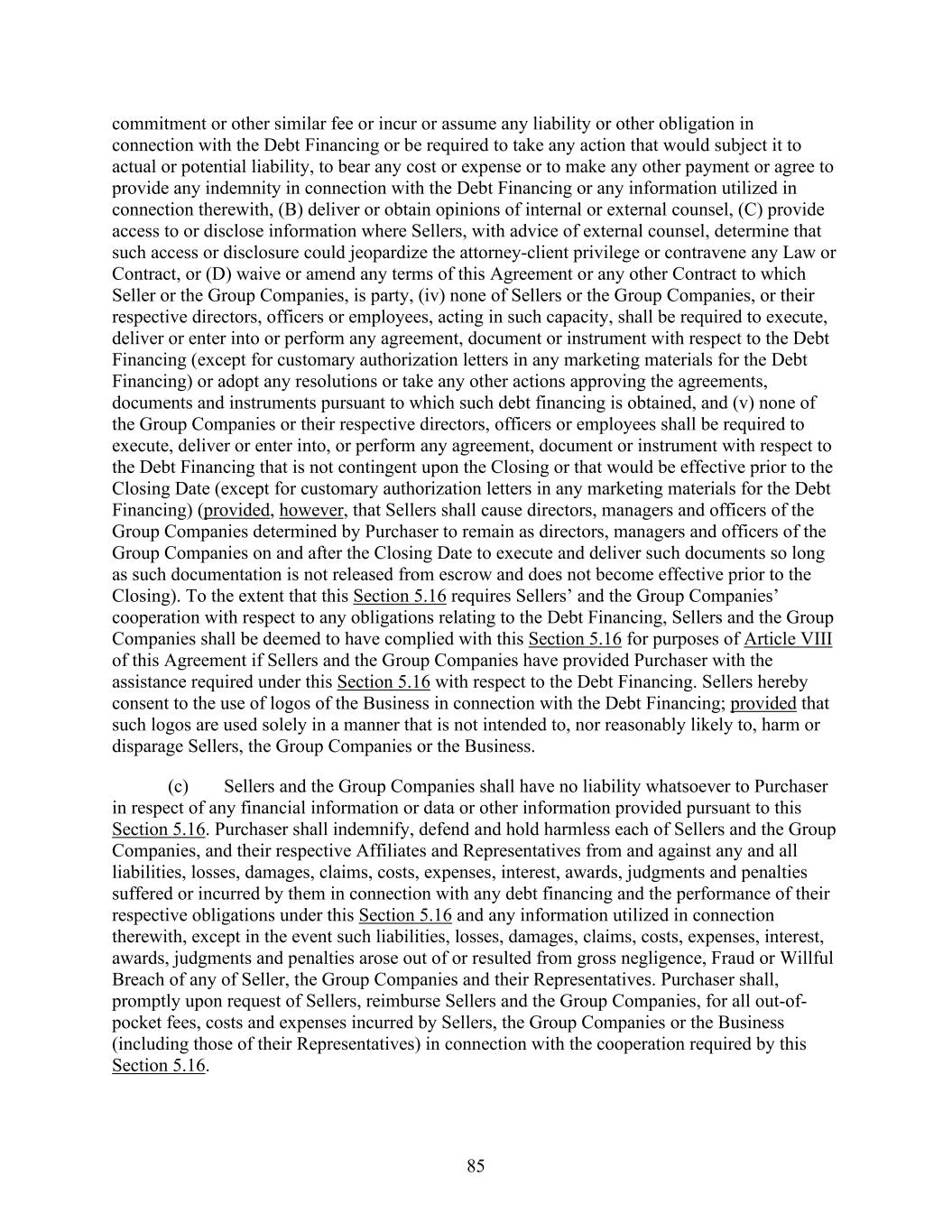 85 commitment or other similar fee or incur or assume any liability or other obligation in connection with the Debt Financing or be required to take any action that would subject it to actual or potential liability, to bear any cost or expense or to make any other payment or agree to provide any indemnity in connection with the Debt Financing or any information utilized in connection therewith, (B) deliver or obtain opinions of internal or external counsel, (C) provide access to or disclose information where Sellers, with advice of external counsel, determine that such access or disclosure could jeopardize the attorney-client privilege or contravene any Law or Contract, or (D) waive or amend any terms of this Agreement or any other Contract to which Seller or the Group Companies, is party, (iv) none of Sellers or the Group Companies, or their respective directors, officers or employees, acting in such capacity, shall be required to execute, deliver or enter into or perform any agreement, document or instrument with respect to the Debt Financing (except for customary authorization letters in any marketing materials for the Debt Financing) or adopt any resolutions or take any other actions approving the agreements, documents and instruments pursuant to which such debt financing is obtained, and (v) none of the Group Companies or their respective directors, officers or employees shall be required to execute, deliver or enter into, or perform any agreement, document or instrument with respect to the Debt Financing that is not contingent upon the Closing or that would be effective prior to the Closing Date (except for customary authorization letters in any marketing materials for the Debt Financing) (provided, however, that Sellers shall cause directors, managers and officers of the Group Companies determined by Purchaser to remain as directors, managers and officers of the Group Companies on and after the Closing Date to execute and deliver such documents so long as such documentation is not released from escrow and does not become effective prior to the Closing). To the extent that this Section 5.16 requires Sellers’ and the Group Companies’ cooperation with respect to any obligations relating to the Debt Financing, Sellers and the Group Companies shall be deemed to have complied with this Section 5.16 for purposes of Article VIII of this Agreement if Sellers and the Group Companies have provided Purchaser with the assistance required under this Section 5.16 with respect to the Debt Financing. Sellers hereby consent to the use of logos of the Business in connection with the Debt Financing; provided that such logos are used solely in a manner that is not intended to, nor reasonably likely to, harm or disparage Sellers, the Group Companies or the Business. (c) Sellers and the Group Companies shall have no liability whatsoever to Purchaser in respect of any financial information or data or other information provided pursuant to this Section 5.16. Purchaser shall indemnify, defend and hold harmless each of Sellers and the Group Companies, and their respective Affiliates and Representatives from and against any and all liabilities, losses, damages, claims, costs, expenses, interest, awards, judgments and penalties suffered or incurred by them in connection with any debt financing and the performance of their respective obligations under this Section 5.16 and any information utilized in connection therewith, except in the event such liabilities, losses, damages, claims, costs, expenses, interest, awards, judgments and penalties arose out of or resulted from gross negligence, Fraud or Willful Breach of any of Seller, the Group Companies and their Representatives. Purchaser shall, promptly upon request of Sellers, reimburse Sellers and the Group Companies, for all out-of- pocket fees, costs and expenses incurred by Sellers, the Group Companies or the Business (including those of their Representatives) in connection with the cooperation required by this Section 5.16.