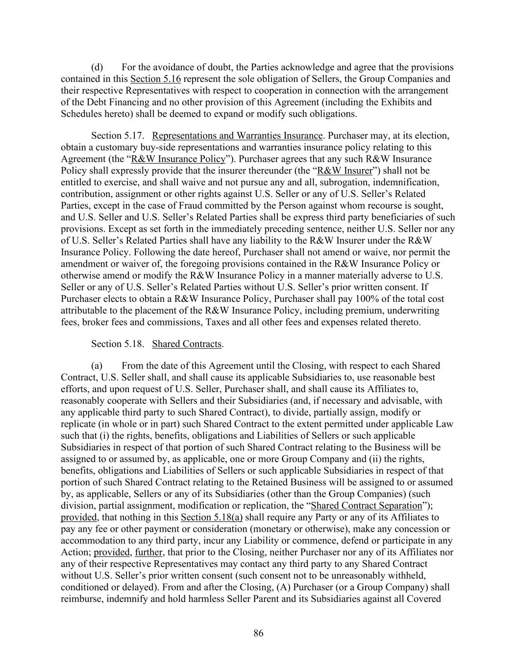 86 (d) For the avoidance of doubt, the Parties acknowledge and agree that the provisions contained in this Section 5.16 represent the sole obligation of Sellers, the Group Companies and their respective Representatives with respect to cooperation in connection with the arrangement of the Debt Financing and no other provision of this Agreement (including the Exhibits and Schedules hereto) shall be deemed to expand or modify such obligations. Section 5.17. Representations and Warranties Insurance. Purchaser may, at its election, obtain a customary buy-side representations and warranties insurance policy relating to this Agreement (the “R&W Insurance Policy”). Purchaser agrees that any such R&W Insurance Policy shall expressly provide that the insurer thereunder (the “R&W Insurer”) shall not be entitled to exercise, and shall waive and not pursue any and all, subrogation, indemnification, contribution, assignment or other rights against U.S. Seller or any of U.S. Seller’s Related Parties, except in the case of Fraud committed by the Person against whom recourse is sought, and U.S. Seller and U.S. Seller’s Related Parties shall be express third party beneficiaries of such provisions. Except as set forth in the immediately preceding sentence, neither U.S. Seller nor any of U.S. Seller’s Related Parties shall have any liability to the R&W Insurer under the R&W Insurance Policy. Following the date hereof, Purchaser shall not amend or waive, nor permit the amendment or waiver of, the foregoing provisions contained in the R&W Insurance Policy or otherwise amend or modify the R&W Insurance Policy in a manner materially adverse to U.S. Seller or any of U.S. Seller’s Related Parties without U.S. Seller’s prior written consent. If Purchaser elects to obtain a R&W Insurance Policy, Purchaser shall pay 100% of the total cost attributable to the placement of the R&W Insurance Policy, including premium, underwriting fees, broker fees and commissions, Taxes and all other fees and expenses related thereto. Section 5.18. Shared Contracts. (a) From the date of this Agreement until the Closing, with respect to each Shared Contract, U.S. Seller shall, and shall cause its applicable Subsidiaries to, use reasonable best efforts, and upon request of U.S. Seller, Purchaser shall, and shall cause its Affiliates to, reasonably cooperate with Sellers and their Subsidiaries (and, if necessary and advisable, with any applicable third party to such Shared Contract), to divide, partially assign, modify or replicate (in whole or in part) such Shared Contract to the extent permitted under applicable Law such that (i) the rights, benefits, obligations and Liabilities of Sellers or such applicable Subsidiaries in respect of that portion of such Shared Contract relating to the Business will be assigned to or assumed by, as applicable, one or more Group Company and (ii) the rights, benefits, obligations and Liabilities of Sellers or such applicable Subsidiaries in respect of that portion of such Shared Contract relating to the Retained Business will be assigned to or assumed by, as applicable, Sellers or any of its Subsidiaries (other than the Group Companies) (such division, partial assignment, modification or replication, the “Shared Contract Separation”); provided, that nothing in this Section 5.18(a) shall require any Party or any of its Affiliates to pay any fee or other payment or consideration (monetary or otherwise), make any concession or accommodation to any third party, incur any Liability or commence, defend or participate in any Action; provided, further, that prior to the Closing, neither Purchaser nor any of its Affiliates nor any of their respective Representatives may contact any third party to any Shared Contract without U.S. Seller’s prior written consent (such consent not to be unreasonably withheld, conditioned or delayed). From and after the Closing, (A) Purchaser (or a Group Company) shall reimburse, indemnify and hold harmless Seller Parent and its Subsidiaries against all Covered