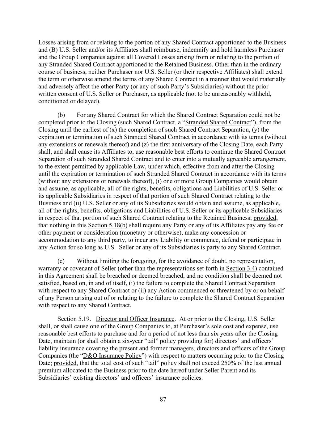 87 Losses arising from or relating to the portion of any Shared Contract apportioned to the Business and (B) U.S. Seller and/or its Affiliates shall reimburse, indemnify and hold harmless Purchaser and the Group Companies against all Covered Losses arising from or relating to the portion of any Stranded Shared Contract apportioned to the Retained Business. Other than in the ordinary course of business, neither Purchaser nor U.S. Seller (or their respective Affiliates) shall extend the term or otherwise amend the terms of any Shared Contract in a manner that would materially and adversely affect the other Party (or any of such Party’s Subsidiaries) without the prior written consent of U.S. Seller or Purchaser, as applicable (not to be unreasonably withheld, conditioned or delayed). (b) For any Shared Contract for which the Shared Contract Separation could not be completed prior to the Closing (such Shared Contract, a “Stranded Shared Contract”), from the Closing until the earliest of (x) the completion of such Shared Contract Separation, (y) the expiration or termination of such Stranded Shared Contract in accordance with its terms (without any extensions or renewals thereof) and (z) the first anniversary of the Closing Date, each Party shall, and shall cause its Affiliates to, use reasonable best efforts to continue the Shared Contract Separation of such Stranded Shared Contract and to enter into a mutually agreeable arrangement, to the extent permitted by applicable Law, under which, effective from and after the Closing until the expiration or termination of such Stranded Shared Contract in accordance with its terms (without any extensions or renewals thereof), (i) one or more Group Companies would obtain and assume, as applicable, all of the rights, benefits, obligations and Liabilities of U.S. Seller or its applicable Subsidiaries in respect of that portion of such Shared Contract relating to the Business and (ii) U.S. Seller or any of its Subsidiaries would obtain and assume, as applicable, all of the rights, benefits, obligations and Liabilities of U.S. Seller or its applicable Subsidiaries in respect of that portion of such Shared Contract relating to the Retained Business; provided, that nothing in this Section 5.18(b) shall require any Party or any of its Affiliates pay any fee or other payment or consideration (monetary or otherwise), make any concession or accommodation to any third party, to incur any Liability or commence, defend or participate in any Action for so long as U.S. Seller or any of its Subsidiaries is party to any Shared Contract. (c) Without limiting the foregoing, for the avoidance of doubt, no representation, warranty or covenant of Seller (other than the representations set forth in Section 3.4) contained in this Agreement shall be breached or deemed breached, and no condition shall be deemed not satisfied, based on, in and of itself, (i) the failure to complete the Shared Contract Separation with respect to any Shared Contract or (ii) any Action commenced or threatened by or on behalf of any Person arising out of or relating to the failure to complete the Shared Contract Separation with respect to any Shared Contract. Section 5.19. Director and Officer Insurance. At or prior to the Closing, U.S. Seller shall, or shall cause one of the Group Companies to, at Purchaser’s sole cost and expense, use reasonable best efforts to purchase and for a period of not less than six years after the Closing Date, maintain (or shall obtain a six-year “tail” policy providing for) directors’ and officers’ liability insurance covering the present and former managers, directors and officers of the Group Companies (the “D&O Insurance Policy”) with respect to matters occurring prior to the Closing Date; provided, that the total cost of such “tail” policy shall not exceed 250% of the last annual premium allocated to the Business prior to the date hereof under Seller Parent and its Subsidiaries’ existing directors’ and officers’ insurance policies.