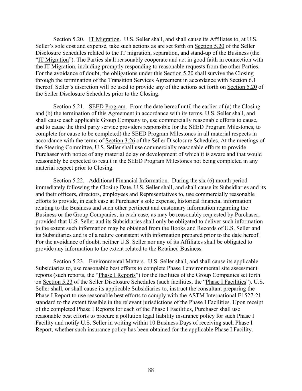 88 Section 5.20. IT Migration. U.S. Seller shall, and shall cause its Affiliates to, at U.S. Seller’s sole cost and expense, take such actions as are set forth on Section 5.20 of the Seller Disclosure Schedules related to the IT migration, separation, and stand-up of the Business (the “IT Migration”). The Parties shall reasonably cooperate and act in good faith in connection with the IT Migration, including promptly responding to reasonable requests from the other Parties. For the avoidance of doubt, the obligations under this Section 5.20 shall survive the Closing through the termination of the Transition Services Agreement in accordance with Section 6.1 thereof. Seller’s discretion will be used to provide any of the actions set forth on Section 5.20 of the Seller Disclosure Schedules prior to the Closing. Section 5.21. SEED Program. From the date hereof until the earlier of (a) the Closing and (b) the termination of this Agreement in accordance with its terms, U.S. Seller shall, and shall cause each applicable Group Company to, use commercially reasonable efforts to cause, and to cause the third party service providers responsible for the SEED Program Milestones, to complete (or cause to be completed) the SEED Program Milestones in all material respects in accordance with the terms of Section 3.26 of the Seller Disclosure Schedules. At the meetings of the Steering Committee, U.S. Seller shall use commercially reasonable efforts to provide Purchaser with notice of any material delay or development of which it is aware and that would reasonably be expected to result in the SEED Program Milestones not being completed in any material respect prior to Closing. Section 5.22. Additional Financial Information. During the six (6) month period immediately following the Closing Date, U.S. Seller shall, and shall cause its Subsidiaries and its and their officers, directors, employees and Representatives to, use commercially reasonable efforts to provide, in each case at Purchaser’s sole expense, historical financial information relating to the Business and such other pertinent and customary information regarding the Business or the Group Companies, in each case, as may be reasonably requested by Purchaser; provided that U.S. Seller and its Subsidiaries shall only be obligated to deliver such information to the extent such information may be obtained from the Books and Records of U.S. Seller and its Subsidiaries and is of a nature consistent with information prepared prior to the date hereof. For the avoidance of doubt, neither U.S. Seller nor any of its Affiliates shall be obligated to provide any information to the extent related to the Retained Business. Section 5.23. Environmental Matters. U.S. Seller shall, and shall cause its applicable Subsidiaries to, use reasonable best efforts to complete Phase I environmental site assessment reports (such reports, the “Phase I Reports”) for the facilities of the Group Companies set forth on Section 5.23 of the Seller Disclosure Schedules (such facilities, the “Phase I Facilities”). U.S. Seller shall, or shall cause its applicable Subsidiaries to, instruct the consultant preparing the Phase I Report to use reasonable best efforts to comply with the ASTM International E1527-21 standard to the extent feasible in the relevant jurisdictions of the Phase I Facilities. Upon receipt of the completed Phase I Reports for each of the Phase I Facilities, Purchaser shall use reasonable best efforts to procure a pollution legal liability insurance policy for such Phase I Facility and notify U.S. Seller in writing within 10 Business Days of receiving such Phase I Report, whether such insurance policy has been obtained for the applicable Phase I Facility.