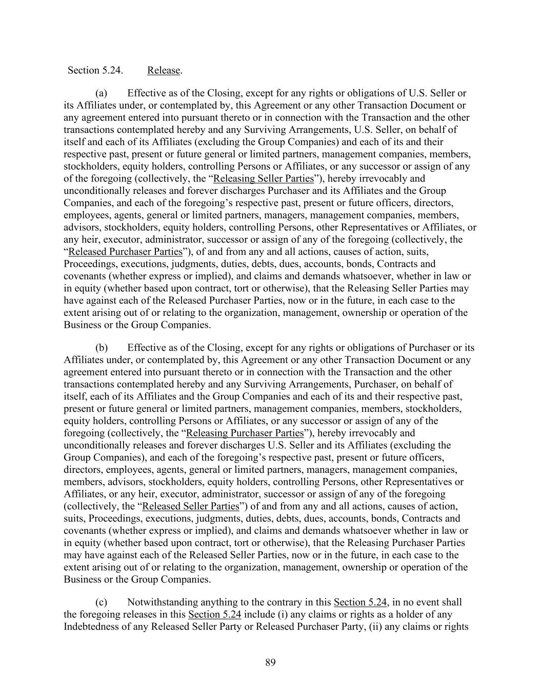89 Section 5.24. Release. (a) Effective as of the Closing, except for any rights or obligations of U.S. Seller or its Affiliates under, or contemplated by, this Agreement or any other Transaction Document or any agreement entered into pursuant thereto or in connection with the Transaction and the other transactions contemplated hereby and any Surviving Arrangements, U.S. Seller, on behalf of itself and each of its Affiliates (excluding the Group Companies) and each of its and their respective past, present or future general or limited partners, management companies, members, stockholders, equity holders, controlling Persons or Affiliates, or any successor or assign of any of the foregoing (collectively, the “Releasing Seller Parties”), hereby irrevocably and unconditionally releases and forever discharges Purchaser and its Affiliates and the Group Companies, and each of the foregoing’s respective past, present or future officers, directors, employees, agents, general or limited partners, managers, management companies, members, advisors, stockholders, equity holders, controlling Persons, other Representatives or Affiliates, or any heir, executor, administrator, successor or assign of any of the foregoing (collectively, the “Released Purchaser Parties”), of and from any and all actions, causes of action, suits, Proceedings, executions, judgments, duties, debts, dues, accounts, bonds, Contracts and covenants (whether express or implied), and claims and demands whatsoever, whether in law or in equity (whether based upon contract, tort or otherwise), that the Releasing Seller Parties may have against each of the Released Purchaser Parties, now or in the future, in each case to the extent arising out of or relating to the organization, management, ownership or operation of the Business or the Group Companies. (b) Effective as of the Closing, except for any rights or obligations of Purchaser or its Affiliates under, or contemplated by, this Agreement or any other Transaction Document or any agreement entered into pursuant thereto or in connection with the Transaction and the other transactions contemplated hereby and any Surviving Arrangements, Purchaser, on behalf of itself, each of its Affiliates and the Group Companies and each of its and their respective past, present or future general or limited partners, management companies, members, stockholders, equity holders, controlling Persons or Affiliates, or any successor or assign of any of the foregoing (collectively, the “Releasing Purchaser Parties”), hereby irrevocably and unconditionally releases and forever discharges U.S. Seller and its Affiliates (excluding the Group Companies), and each of the foregoing’s respective past, present or future officers, directors, employees, agents, general or limited partners, managers, management companies, members, advisors, stockholders, equity holders, controlling Persons, other Representatives or Affiliates, or any heir, executor, administrator, successor or assign of any of the foregoing (collectively, the “Released Seller Parties”) of and from any and all actions, causes of action, suits, Proceedings, executions, judgments, duties, debts, dues, accounts, bonds, Contracts and covenants (whether express or implied), and claims and demands whatsoever whether in law or in equity (whether based upon contract, tort or otherwise), that the Releasing Purchaser Parties may have against each of the Released Seller Parties, now or in the future, in each case to the extent arising out of or relating to the organization, management, ownership or operation of the Business or the Group Companies. (c) Notwithstanding anything to the contrary in this Section 5.24, in no event shall the foregoing releases in this Section 5.24 include (i) any claims or rights as a holder of any Indebtedness of any Released Seller Party or Released Purchaser Party, (ii) any claims or rights