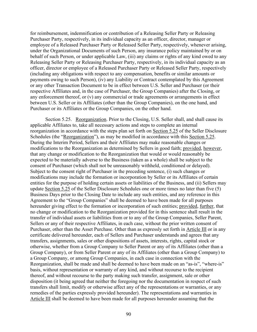 90 for reimbursement, indemnification or contribution of a Releasing Seller Party or Releasing Purchaser Party, respectively, in its individual capacity as an officer, director, manager or employee of a Released Purchaser Party or Released Seller Party, respectively, whenever arising, under the Organizational Documents of such Person, any insurance policy maintained by or on behalf of such Person, or under applicable Law, (iii) any claims or rights of any kind owed to any Releasing Seller Party or Releasing Purchaser Party, respectively, in its individual capacity as an officer, director or employee of a Released Purchaser Party or Released Seller Party, respectively (including any obligations with respect to any compensation, benefits or similar amounts or payments owing to such Person), (iv) any Liability or Contract contemplated by this Agreement or any other Transaction Document to be in effect between U.S. Seller and Purchaser (or their respective Affiliates and, in the case of Purchaser, the Group Companies) after the Closing, or any enforcement thereof, or (v) any commercial or trade agreements or arrangements in effect between U.S. Seller or its Affiliates (other than the Group Companies), on the one hand, and Purchaser or its Affiliates or the Group Companies, on the other hand. Section 5.25. Reorganization. Prior to the Closing, U.S. Seller shall, and shall cause its applicable Affiliates to, take all necessary actions and steps to complete an internal reorganization in accordance with the steps plan set forth on Section 5.25 of the Seller Disclosure Schedules (the “Reorganization”), as may be modified in accordance with this Section 5.25. During the Interim Period, Sellers and their Affiliates may make reasonable changes or modifications to the Reorganization as determined by Sellers in good faith; provided, however, that any change or modification to the Reorganization that would or would reasonably be expected to be materially adverse to the Business (taken as a whole) shall be subject to the consent of Purchaser (which shall not be unreasonably withheld, conditioned or delayed). Subject to the consent right of Purchaser in the preceding sentence, (i) such changes or modifications may include the formation or incorporation by Seller or its Affiliates of certain entities for the purpose of holding certain assets or liabilities of the Business, and (ii) Sellers may update Section 5.25 of the Seller Disclosure Schedules one or more times no later than five (5) Business Days prior to the Closing Date to include any such entities, and any reference in this Agreement to the “Group Companies” shall be deemed to have been made for all purposes hereunder giving effect to the formation or incorporation of such entities; provided, further, that no change or modification to the Reorganization provided for in this sentence shall result in the transfer of individual assets or liabilities from or to any of the Group Companies, Seller Parent, Sellers or any of their respective Affiliates, in each case, without the prior written consent of Purchaser, other than the Asset Purchase. Other than as expressly set forth in Article III or in any certificate delivered hereunder, each of Sellers and Purchaser understands and agrees that any transfers, assignments, sales or other dispositions of assets, interests, rights, capital stock or otherwise, whether from a Group Company to Seller Parent or any of its Affiliates (other than a Group Company), or from Seller Parent or any of its Affiliates (other than a Group Company) to a Group Company, or among Group Companies, in each case in connection with the Reorganization, shall be made and shall be deemed to have been made on an “as-is”, “where-is” basis, without representation or warranty of any kind, and without recourse to the recipient thereof, and without recourse to the party making such transfer, assignment, sale or other disposition (it being agreed that neither the foregoing nor the documentation in respect of such transfers shall limit, modify or otherwise affect any of the representations or warranties, or any remedies of the parties expressly provided hereunder). The representations and warranties in Article III shall be deemed to have been made for all purposes hereunder assuming that the
