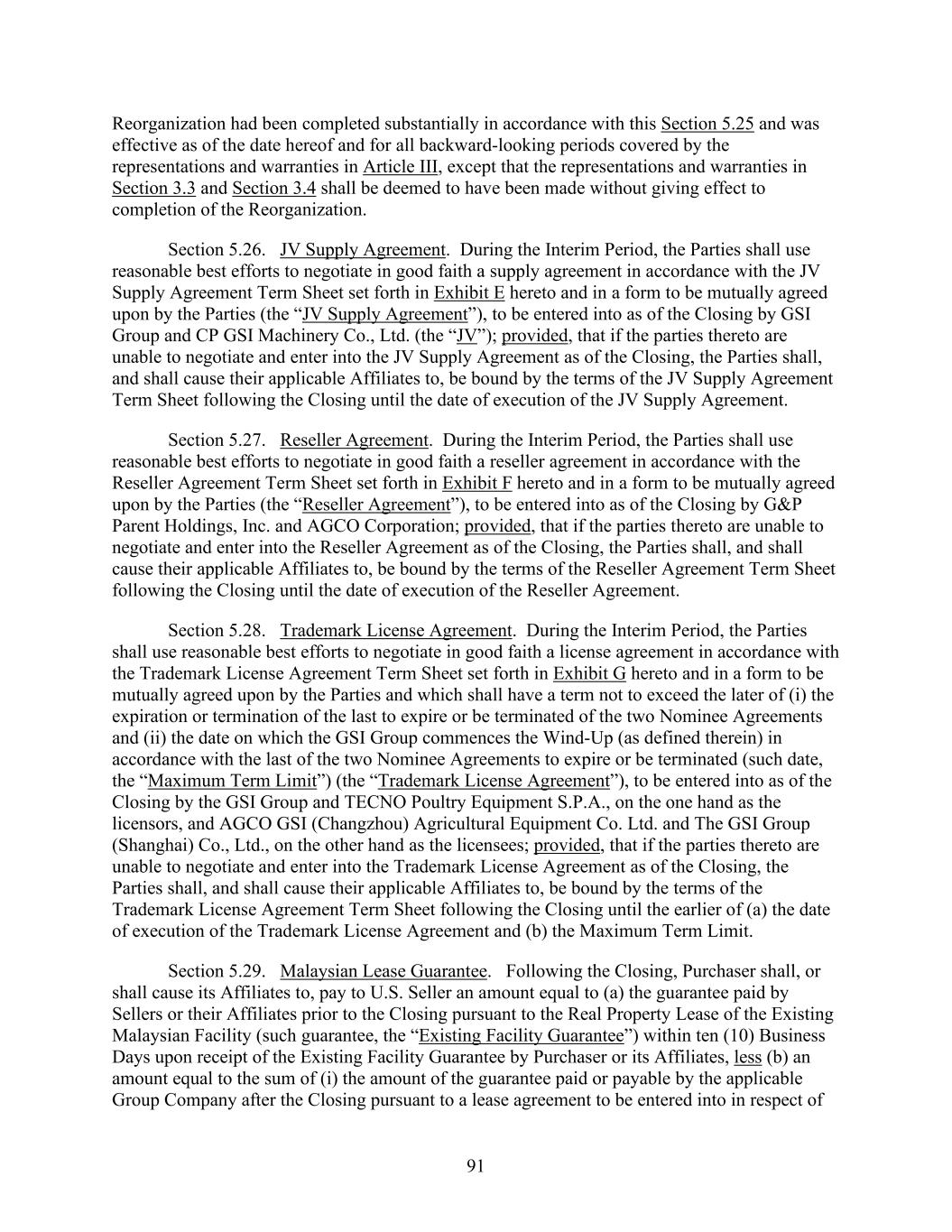 91 Reorganization had been completed substantially in accordance with this Section 5.25 and was effective as of the date hereof and for all backward-looking periods covered by the representations and warranties in Article III, except that the representations and warranties in Section 3.3 and Section 3.4 shall be deemed to have been made without giving effect to completion of the Reorganization. Section 5.26. JV Supply Agreement. During the Interim Period, the Parties shall use reasonable best efforts to negotiate in good faith a supply agreement in accordance with the JV Supply Agreement Term Sheet set forth in Exhibit E hereto and in a form to be mutually agreed upon by the Parties (the “JV Supply Agreement”), to be entered into as of the Closing by GSI Group and CP GSI Machinery Co., Ltd. (the “JV”); provided, that if the parties thereto are unable to negotiate and enter into the JV Supply Agreement as of the Closing, the Parties shall, and shall cause their applicable Affiliates to, be bound by the terms of the JV Supply Agreement Term Sheet following the Closing until the date of execution of the JV Supply Agreement. Section 5.27. Reseller Agreement. During the Interim Period, the Parties shall use reasonable best efforts to negotiate in good faith a reseller agreement in accordance with the Reseller Agreement Term Sheet set forth in Exhibit F hereto and in a form to be mutually agreed upon by the Parties (the “Reseller Agreement”), to be entered into as of the Closing by G&P Parent Holdings, Inc. and AGCO Corporation; provided, that if the parties thereto are unable to negotiate and enter into the Reseller Agreement as of the Closing, the Parties shall, and shall cause their applicable Affiliates to, be bound by the terms of the Reseller Agreement Term Sheet following the Closing until the date of execution of the Reseller Agreement. Section 5.28. Trademark License Agreement. During the Interim Period, the Parties shall use reasonable best efforts to negotiate in good faith a license agreement in accordance with the Trademark License Agreement Term Sheet set forth in Exhibit G hereto and in a form to be mutually agreed upon by the Parties and which shall have a term not to exceed the later of (i) the expiration or termination of the last to expire or be terminated of the two Nominee Agreements and (ii) the date on which the GSI Group commences the Wind-Up (as defined therein) in accordance with the last of the two Nominee Agreements to expire or be terminated (such date, the “Maximum Term Limit”) (the “Trademark License Agreement”), to be entered into as of the Closing by the GSI Group and TECNO Poultry Equipment S.P.A., on the one hand as the licensors, and AGCO GSI (Changzhou) Agricultural Equipment Co. Ltd. and The GSI Group (Shanghai) Co., Ltd., on the other hand as the licensees; provided, that if the parties thereto are unable to negotiate and enter into the Trademark License Agreement as of the Closing, the Parties shall, and shall cause their applicable Affiliates to, be bound by the terms of the Trademark License Agreement Term Sheet following the Closing until the earlier of (a) the date of execution of the Trademark License Agreement and (b) the Maximum Term Limit. Section 5.29. Malaysian Lease Guarantee. Following the Closing, Purchaser shall, or shall cause its Affiliates to, pay to U.S. Seller an amount equal to (a) the guarantee paid by Sellers or their Affiliates prior to the Closing pursuant to the Real Property Lease of the Existing Malaysian Facility (such guarantee, the “Existing Facility Guarantee”) within ten (10) Business Days upon receipt of the Existing Facility Guarantee by Purchaser or its Affiliates, less (b) an amount equal to the sum of (i) the amount of the guarantee paid or payable by the applicable Group Company after the Closing pursuant to a lease agreement to be entered into in respect of