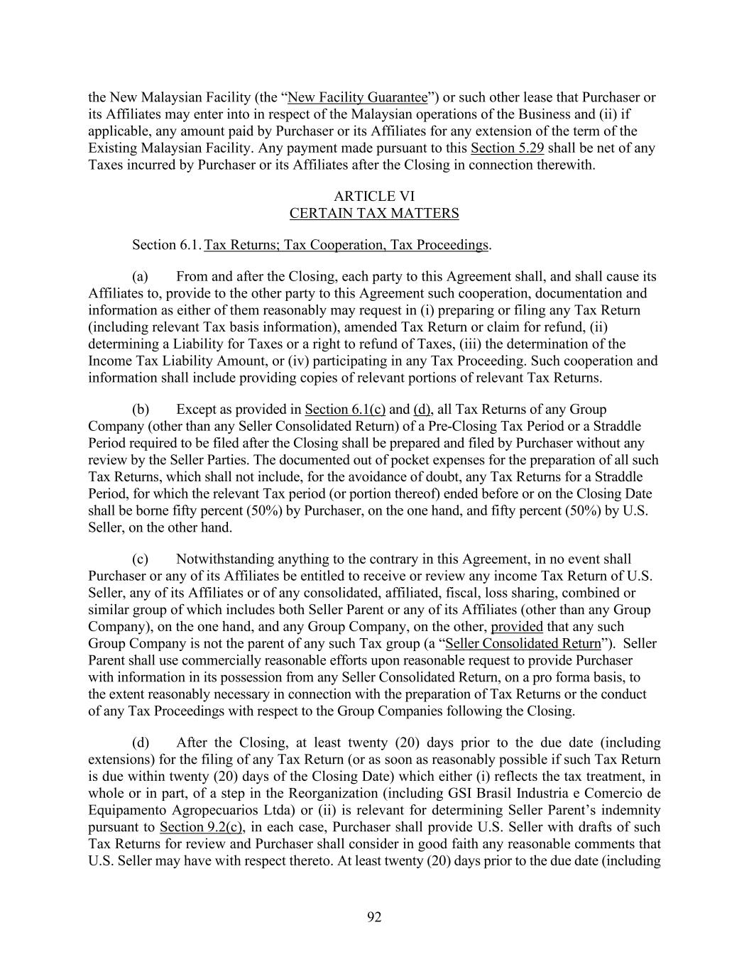 92 the New Malaysian Facility (the “New Facility Guarantee”) or such other lease that Purchaser or its Affiliates may enter into in respect of the Malaysian operations of the Business and (ii) if applicable, any amount paid by Purchaser or its Affiliates for any extension of the term of the Existing Malaysian Facility. Any payment made pursuant to this Section 5.29 shall be net of any Taxes incurred by Purchaser or its Affiliates after the Closing in connection therewith. ARTICLE VI CERTAIN TAX MATTERS Section 6.1. Tax Returns; Tax Cooperation, Tax Proceedings. (a) From and after the Closing, each party to this Agreement shall, and shall cause its Affiliates to, provide to the other party to this Agreement such cooperation, documentation and information as either of them reasonably may request in (i) preparing or filing any Tax Return (including relevant Tax basis information), amended Tax Return or claim for refund, (ii) determining a Liability for Taxes or a right to refund of Taxes, (iii) the determination of the Income Tax Liability Amount, or (iv) participating in any Tax Proceeding. Such cooperation and information shall include providing copies of relevant portions of relevant Tax Returns. (b) Except as provided in Section 6.1(c) and (d), all Tax Returns of any Group Company (other than any Seller Consolidated Return) of a Pre-Closing Tax Period or a Straddle Period required to be filed after the Closing shall be prepared and filed by Purchaser without any review by the Seller Parties. The documented out of pocket expenses for the preparation of all such Tax Returns, which shall not include, for the avoidance of doubt, any Tax Returns for a Straddle Period, for which the relevant Tax period (or portion thereof) ended before or on the Closing Date shall be borne fifty percent (50%) by Purchaser, on the one hand, and fifty percent (50%) by U.S. Seller, on the other hand. (c) Notwithstanding anything to the contrary in this Agreement, in no event shall Purchaser or any of its Affiliates be entitled to receive or review any income Tax Return of U.S. Seller, any of its Affiliates or of any consolidated, affiliated, fiscal, loss sharing, combined or similar group of which includes both Seller Parent or any of its Affiliates (other than any Group Company), on the one hand, and any Group Company, on the other, provided that any such Group Company is not the parent of any such Tax group (a “Seller Consolidated Return”). Seller Parent shall use commercially reasonable efforts upon reasonable request to provide Purchaser with information in its possession from any Seller Consolidated Return, on a pro forma basis, to the extent reasonably necessary in connection with the preparation of Tax Returns or the conduct of any Tax Proceedings with respect to the Group Companies following the Closing. (d) After the Closing, at least twenty (20) days prior to the due date (including extensions) for the filing of any Tax Return (or as soon as reasonably possible if such Tax Return is due within twenty (20) days of the Closing Date) which either (i) reflects the tax treatment, in whole or in part, of a step in the Reorganization (including GSI Brasil Industria e Comercio de Equipamento Agropecuarios Ltda) or (ii) is relevant for determining Seller Parent’s indemnity pursuant to Section 9.2(c), in each case, Purchaser shall provide U.S. Seller with drafts of such Tax Returns for review and Purchaser shall consider in good faith any reasonable comments that U.S. Seller may have with respect thereto. At least twenty (20) days prior to the due date (including