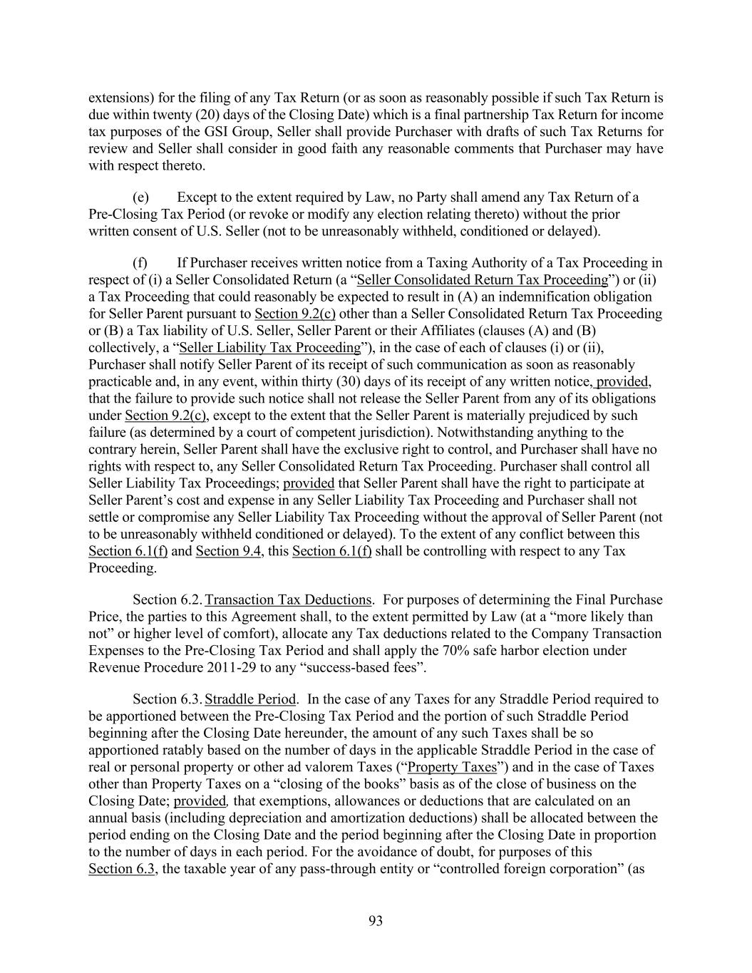 93 extensions) for the filing of any Tax Return (or as soon as reasonably possible if such Tax Return is due within twenty (20) days of the Closing Date) which is a final partnership Tax Return for income tax purposes of the GSI Group, Seller shall provide Purchaser with drafts of such Tax Returns for review and Seller shall consider in good faith any reasonable comments that Purchaser may have with respect thereto. (e) Except to the extent required by Law, no Party shall amend any Tax Return of a Pre-Closing Tax Period (or revoke or modify any election relating thereto) without the prior written consent of U.S. Seller (not to be unreasonably withheld, conditioned or delayed). (f) If Purchaser receives written notice from a Taxing Authority of a Tax Proceeding in respect of (i) a Seller Consolidated Return (a “Seller Consolidated Return Tax Proceeding”) or (ii) a Tax Proceeding that could reasonably be expected to result in (A) an indemnification obligation for Seller Parent pursuant to Section 9.2(c) other than a Seller Consolidated Return Tax Proceeding or (B) a Tax liability of U.S. Seller, Seller Parent or their Affiliates (clauses (A) and (B) collectively, a “Seller Liability Tax Proceeding”), in the case of each of clauses (i) or (ii), Purchaser shall notify Seller Parent of its receipt of such communication as soon as reasonably practicable and, in any event, within thirty (30) days of its receipt of any written notice, provided, that the failure to provide such notice shall not release the Seller Parent from any of its obligations under Section 9.2(c), except to the extent that the Seller Parent is materially prejudiced by such failure (as determined by a court of competent jurisdiction). Notwithstanding anything to the contrary herein, Seller Parent shall have the exclusive right to control, and Purchaser shall have no rights with respect to, any Seller Consolidated Return Tax Proceeding. Purchaser shall control all Seller Liability Tax Proceedings; provided that Seller Parent shall have the right to participate at Seller Parent’s cost and expense in any Seller Liability Tax Proceeding and Purchaser shall not settle or compromise any Seller Liability Tax Proceeding without the approval of Seller Parent (not to be unreasonably withheld conditioned or delayed). To the extent of any conflict between this Section 6.1(f) and Section 9.4, this Section 6.1(f) shall be controlling with respect to any Tax Proceeding. Section 6.2. Transaction Tax Deductions. For purposes of determining the Final Purchase Price, the parties to this Agreement shall, to the extent permitted by Law (at a “more likely than not” or higher level of comfort), allocate any Tax deductions related to the Company Transaction Expenses to the Pre-Closing Tax Period and shall apply the 70% safe harbor election under Revenue Procedure 2011-29 to any “success-based fees”. Section 6.3. Straddle Period. In the case of any Taxes for any Straddle Period required to be apportioned between the Pre-Closing Tax Period and the portion of such Straddle Period beginning after the Closing Date hereunder, the amount of any such Taxes shall be so apportioned ratably based on the number of days in the applicable Straddle Period in the case of real or personal property or other ad valorem Taxes (“Property Taxes”) and in the case of Taxes other than Property Taxes on a “closing of the books” basis as of the close of business on the Closing Date; provided, that exemptions, allowances or deductions that are calculated on an annual basis (including depreciation and amortization deductions) shall be allocated between the period ending on the Closing Date and the period beginning after the Closing Date in proportion to the number of days in each period. For the avoidance of doubt, for purposes of this Section 6.3, the taxable year of any pass-through entity or “controlled foreign corporation” (as