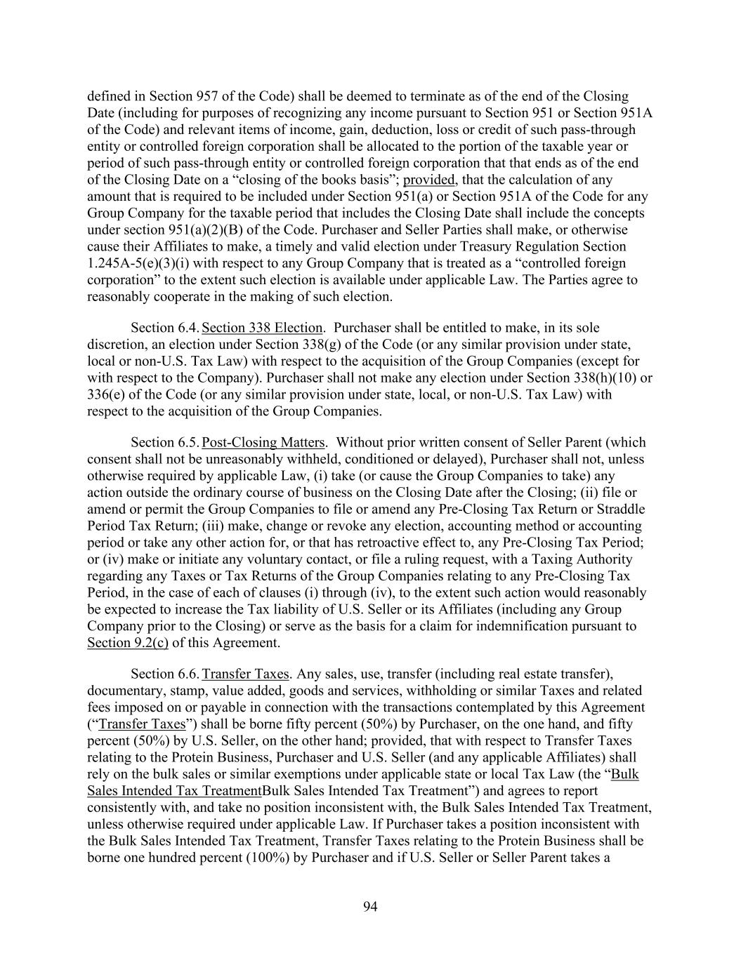 94 defined in Section 957 of the Code) shall be deemed to terminate as of the end of the Closing Date (including for purposes of recognizing any income pursuant to Section 951 or Section 951A of the Code) and relevant items of income, gain, deduction, loss or credit of such pass-through entity or controlled foreign corporation shall be allocated to the portion of the taxable year or period of such pass-through entity or controlled foreign corporation that that ends as of the end of the Closing Date on a “closing of the books basis”; provided, that the calculation of any amount that is required to be included under Section 951(a) or Section 951A of the Code for any Group Company for the taxable period that includes the Closing Date shall include the concepts under section 951(a)(2)(B) of the Code. Purchaser and Seller Parties shall make, or otherwise cause their Affiliates to make, a timely and valid election under Treasury Regulation Section 1.245A-5(e)(3)(i) with respect to any Group Company that is treated as a “controlled foreign corporation” to the extent such election is available under applicable Law. The Parties agree to reasonably cooperate in the making of such election. Section 6.4. Section 338 Election. Purchaser shall be entitled to make, in its sole discretion, an election under Section 338(g) of the Code (or any similar provision under state, local or non-U.S. Tax Law) with respect to the acquisition of the Group Companies (except for with respect to the Company). Purchaser shall not make any election under Section 338(h)(10) or 336(e) of the Code (or any similar provision under state, local, or non-U.S. Tax Law) with respect to the acquisition of the Group Companies. Section 6.5. Post-Closing Matters. Without prior written consent of Seller Parent (which consent shall not be unreasonably withheld, conditioned or delayed), Purchaser shall not, unless otherwise required by applicable Law, (i) take (or cause the Group Companies to take) any action outside the ordinary course of business on the Closing Date after the Closing; (ii) file or amend or permit the Group Companies to file or amend any Pre-Closing Tax Return or Straddle Period Tax Return; (iii) make, change or revoke any election, accounting method or accounting period or take any other action for, or that has retroactive effect to, any Pre-Closing Tax Period; or (iv) make or initiate any voluntary contact, or file a ruling request, with a Taxing Authority regarding any Taxes or Tax Returns of the Group Companies relating to any Pre-Closing Tax Period, in the case of each of clauses (i) through (iv), to the extent such action would reasonably be expected to increase the Tax liability of U.S. Seller or its Affiliates (including any Group Company prior to the Closing) or serve as the basis for a claim for indemnification pursuant to Section 9.2(c) of this Agreement. Section 6.6. Transfer Taxes. Any sales, use, transfer (including real estate transfer), documentary, stamp, value added, goods and services, withholding or similar Taxes and related fees imposed on or payable in connection with the transactions contemplated by this Agreement (“Transfer Taxes”) shall be borne fifty percent (50%) by Purchaser, on the one hand, and fifty percent (50%) by U.S. Seller, on the other hand; provided, that with respect to Transfer Taxes relating to the Protein Business, Purchaser and U.S. Seller (and any applicable Affiliates) shall rely on the bulk sales or similar exemptions under applicable state or local Tax Law (the “Bulk Sales Intended Tax TreatmentBulk Sales Intended Tax Treatment”) and agrees to report consistently with, and take no position inconsistent with, the Bulk Sales Intended Tax Treatment, unless otherwise required under applicable Law. If Purchaser takes a position inconsistent with the Bulk Sales Intended Tax Treatment, Transfer Taxes relating to the Protein Business shall be borne one hundred percent (100%) by Purchaser and if U.S. Seller or Seller Parent takes a