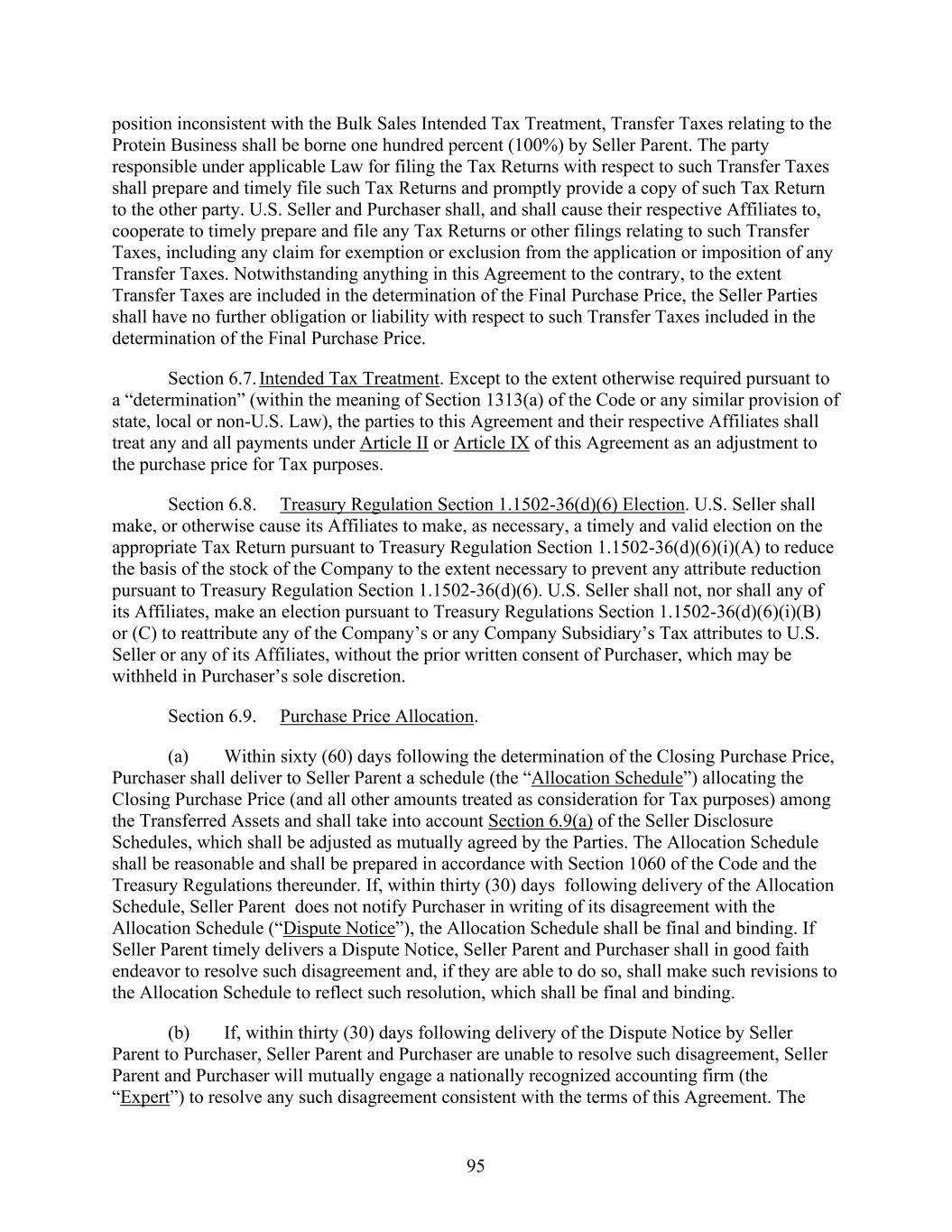95 position inconsistent with the Bulk Sales Intended Tax Treatment, Transfer Taxes relating to the Protein Business shall be borne one hundred percent (100%) by Seller Parent. The party responsible under applicable Law for filing the Tax Returns with respect to such Transfer Taxes shall prepare and timely file such Tax Returns and promptly provide a copy of such Tax Return to the other party. U.S. Seller and Purchaser shall, and shall cause their respective Affiliates to, cooperate to timely prepare and file any Tax Returns or other filings relating to such Transfer Taxes, including any claim for exemption or exclusion from the application or imposition of any Transfer Taxes. Notwithstanding anything in this Agreement to the contrary, to the extent Transfer Taxes are included in the determination of the Final Purchase Price, the Seller Parties shall have no further obligation or liability with respect to such Transfer Taxes included in the determination of the Final Purchase Price. Section 6.7. Intended Tax Treatment. Except to the extent otherwise required pursuant to a “determination” (within the meaning of Section 1313(a) of the Code or any similar provision of state, local or non-U.S. Law), the parties to this Agreement and their respective Affiliates shall treat any and all payments under Article II or Article IX of this Agreement as an adjustment to the purchase price for Tax purposes. Section 6.8. Treasury Regulation Section 1.1502-36(d)(6) Election. U.S. Seller shall make, or otherwise cause its Affiliates to make, as necessary, a timely and valid election on the appropriate Tax Return pursuant to Treasury Regulation Section 1.1502-36(d)(6)(i)(A) to reduce the basis of the stock of the Company to the extent necessary to prevent any attribute reduction pursuant to Treasury Regulation Section 1.1502-36(d)(6). U.S. Seller shall not, nor shall any of its Affiliates, make an election pursuant to Treasury Regulations Section 1.1502-36(d)(6)(i)(B) or (C) to reattribute any of the Company’s or any Company Subsidiary’s Tax attributes to U.S. Seller or any of its Affiliates, without the prior written consent of Purchaser, which may be withheld in Purchaser’s sole discretion. Section 6.9. Purchase Price Allocation. (a) Within sixty (60) days following the determination of the Closing Purchase Price, Purchaser shall deliver to Seller Parent a schedule (the “Allocation Schedule”) allocating the Closing Purchase Price (and all other amounts treated as consideration for Tax purposes) among the Transferred Assets and shall take into account Section 6.9(a) of the Seller Disclosure Schedules, which shall be adjusted as mutually agreed by the Parties. The Allocation Schedule shall be reasonable and shall be prepared in accordance with Section 1060 of the Code and the Treasury Regulations thereunder. If, within thirty (30) days following delivery of the Allocation Schedule, Seller Parent does not notify Purchaser in writing of its disagreement with the Allocation Schedule (“Dispute Notice”), the Allocation Schedule shall be final and binding. If Seller Parent timely delivers a Dispute Notice, Seller Parent and Purchaser shall in good faith endeavor to resolve such disagreement and, if they are able to do so, shall make such revisions to the Allocation Schedule to reflect such resolution, which shall be final and binding. (b) If, within thirty (30) days following delivery of the Dispute Notice by Seller Parent to Purchaser, Seller Parent and Purchaser are unable to resolve such disagreement, Seller Parent and Purchaser will mutually engage a nationally recognized accounting firm (the “Expert”) to resolve any such disagreement consistent with the terms of this Agreement. The