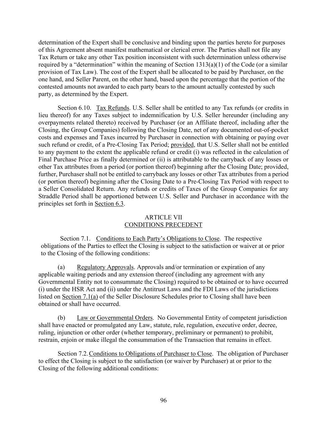96 determination of the Expert shall be conclusive and binding upon the parties hereto for purposes of this Agreement absent manifest mathematical or clerical error. The Parties shall not file any Tax Return or take any other Tax position inconsistent with such determination unless otherwise required by a “determination” within the meaning of Section 1313(a)(1) of the Code (or a similar provision of Tax Law). The cost of the Expert shall be allocated to be paid by Purchaser, on the one hand, and Seller Parent, on the other hand, based upon the percentage that the portion of the contested amounts not awarded to each party bears to the amount actually contested by such party, as determined by the Expert. Section 6.10. Tax Refunds. U.S. Seller shall be entitled to any Tax refunds (or credits in lieu thereof) for any Taxes subject to indemnification by U.S. Seller hereunder (including any overpayments related thereto) received by Purchaser (or an Affiliate thereof, including after the Closing, the Group Companies) following the Closing Date, net of any documented out-of-pocket costs and expenses and Taxes incurred by Purchaser in connection with obtaining or paying over such refund or credit, of a Pre-Closing Tax Period; provided, that U.S. Seller shall not be entitled to any payment to the extent the applicable refund or credit (i) was reflected in the calculation of Final Purchase Price as finally determined or (ii) is attributable to the carryback of any losses or other Tax attributes from a period (or portion thereof) beginning after the Closing Date; provided, further, Purchaser shall not be entitled to carryback any losses or other Tax attributes from a period (or portion thereof) beginning after the Closing Date to a Pre-Closing Tax Period with respect to a Seller Consolidated Return. Any refunds or credits of Taxes of the Group Companies for any Straddle Period shall be apportioned between U.S. Seller and Purchaser in accordance with the principles set forth in Section 6.3. ARTICLE VII CONDITIONS PRECEDENT Section 7.1. Conditions to Each Party’s Obligations to Close. The respective obligations of the Parties to effect the Closing is subject to the satisfaction or waiver at or prior to the Closing of the following conditions: (a) Regulatory Approvals. Approvals and/or termination or expiration of any applicable waiting periods and any extension thereof (including any agreement with any Governmental Entity not to consummate the Closing) required to be obtained or to have occurred (i) under the HSR Act and (ii) under the Antitrust Laws and the FDI Laws of the jurisdictions listed on Section 7.1(a) of the Seller Disclosure Schedules prior to Closing shall have been obtained or shall have occurred. (b) Law or Governmental Orders. No Governmental Entity of competent jurisdiction shall have enacted or promulgated any Law, statute, rule, regulation, executive order, decree, ruling, injunction or other order (whether temporary, preliminary or permanent) to prohibit, restrain, enjoin or make illegal the consummation of the Transaction that remains in effect. Section 7.2. Conditions to Obligations of Purchaser to Close. The obligation of Purchaser to effect the Closing is subject to the satisfaction (or waiver by Purchaser) at or prior to the Closing of the following additional conditions: