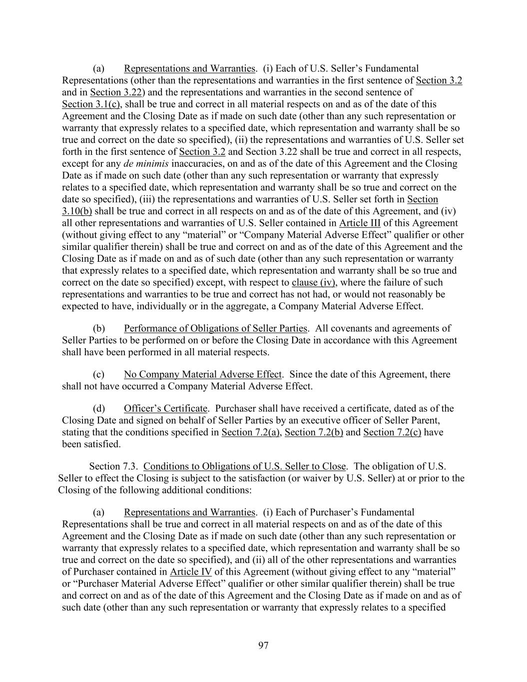 97 (a) Representations and Warranties. (i) Each of U.S. Seller’s Fundamental Representations (other than the representations and warranties in the first sentence of Section 3.2 and in Section 3.22) and the representations and warranties in the second sentence of Section 3.1(c), shall be true and correct in all material respects on and as of the date of this Agreement and the Closing Date as if made on such date (other than any such representation or warranty that expressly relates to a specified date, which representation and warranty shall be so true and correct on the date so specified), (ii) the representations and warranties of U.S. Seller set forth in the first sentence of Section 3.2 and Section 3.22 shall be true and correct in all respects, except for any de minimis inaccuracies, on and as of the date of this Agreement and the Closing Date as if made on such date (other than any such representation or warranty that expressly relates to a specified date, which representation and warranty shall be so true and correct on the date so specified), (iii) the representations and warranties of U.S. Seller set forth in Section 3.10(b) shall be true and correct in all respects on and as of the date of this Agreement, and (iv) all other representations and warranties of U.S. Seller contained in Article III of this Agreement (without giving effect to any “material” or “Company Material Adverse Effect” qualifier or other similar qualifier therein) shall be true and correct on and as of the date of this Agreement and the Closing Date as if made on and as of such date (other than any such representation or warranty that expressly relates to a specified date, which representation and warranty shall be so true and correct on the date so specified) except, with respect to clause (iv), where the failure of such representations and warranties to be true and correct has not had, or would not reasonably be expected to have, individually or in the aggregate, a Company Material Adverse Effect. (b) Performance of Obligations of Seller Parties. All covenants and agreements of Seller Parties to be performed on or before the Closing Date in accordance with this Agreement shall have been performed in all material respects. (c) No Company Material Adverse Effect. Since the date of this Agreement, there shall not have occurred a Company Material Adverse Effect. (d) Officer’s Certificate. Purchaser shall have received a certificate, dated as of the Closing Date and signed on behalf of Seller Parties by an executive officer of Seller Parent, stating that the conditions specified in Section 7.2(a), Section 7.2(b) and Section 7.2(c) have been satisfied. Section 7.3. Conditions to Obligations of U.S. Seller to Close. The obligation of U.S. Seller to effect the Closing is subject to the satisfaction (or waiver by U.S. Seller) at or prior to the Closing of the following additional conditions: (a) Representations and Warranties. (i) Each of Purchaser’s Fundamental Representations shall be true and correct in all material respects on and as of the date of this Agreement and the Closing Date as if made on such date (other than any such representation or warranty that expressly relates to a specified date, which representation and warranty shall be so true and correct on the date so specified), and (ii) all of the other representations and warranties of Purchaser contained in Article IV of this Agreement (without giving effect to any “material” or “Purchaser Material Adverse Effect” qualifier or other similar qualifier therein) shall be true and correct on and as of the date of this Agreement and the Closing Date as if made on and as of such date (other than any such representation or warranty that expressly relates to a specified