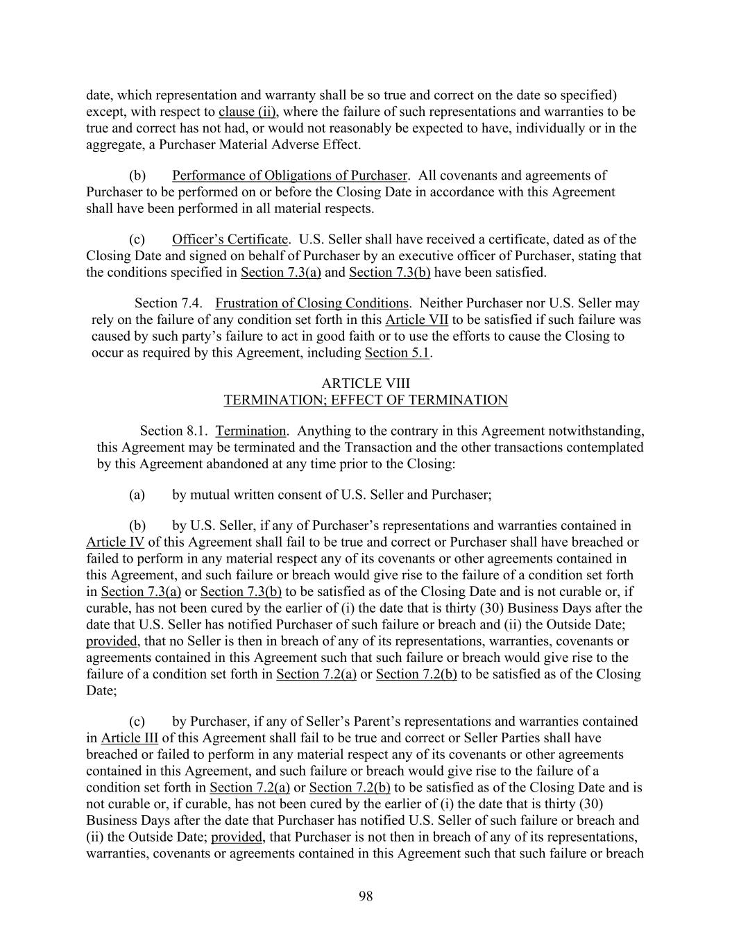 98 date, which representation and warranty shall be so true and correct on the date so specified) except, with respect to clause (ii), where the failure of such representations and warranties to be true and correct has not had, or would not reasonably be expected to have, individually or in the aggregate, a Purchaser Material Adverse Effect. (b) Performance of Obligations of Purchaser. All covenants and agreements of Purchaser to be performed on or before the Closing Date in accordance with this Agreement shall have been performed in all material respects. (c) Officer’s Certificate. U.S. Seller shall have received a certificate, dated as of the Closing Date and signed on behalf of Purchaser by an executive officer of Purchaser, stating that the conditions specified in Section 7.3(a) and Section 7.3(b) have been satisfied. Section 7.4. Frustration of Closing Conditions. Neither Purchaser nor U.S. Seller may rely on the failure of any condition set forth in this Article VII to be satisfied if such failure was caused by such party’s failure to act in good faith or to use the efforts to cause the Closing to occur as required by this Agreement, including Section 5.1. ARTICLE VIII TERMINATION; EFFECT OF TERMINATION Section 8.1. Termination. Anything to the contrary in this Agreement notwithstanding, this Agreement may be terminated and the Transaction and the other transactions contemplated by this Agreement abandoned at any time prior to the Closing: (a) by mutual written consent of U.S. Seller and Purchaser; (b) by U.S. Seller, if any of Purchaser’s representations and warranties contained in Article IV of this Agreement shall fail to be true and correct or Purchaser shall have breached or failed to perform in any material respect any of its covenants or other agreements contained in this Agreement, and such failure or breach would give rise to the failure of a condition set forth in Section 7.3(a) or Section 7.3(b) to be satisfied as of the Closing Date and is not curable or, if curable, has not been cured by the earlier of (i) the date that is thirty (30) Business Days after the date that U.S. Seller has notified Purchaser of such failure or breach and (ii) the Outside Date; provided, that no Seller is then in breach of any of its representations, warranties, covenants or agreements contained in this Agreement such that such failure or breach would give rise to the failure of a condition set forth in Section 7.2(a) or Section 7.2(b) to be satisfied as of the Closing Date; (c) by Purchaser, if any of Seller’s Parent’s representations and warranties contained in Article III of this Agreement shall fail to be true and correct or Seller Parties shall have breached or failed to perform in any material respect any of its covenants or other agreements contained in this Agreement, and such failure or breach would give rise to the failure of a condition set forth in Section 7.2(a) or Section 7.2(b) to be satisfied as of the Closing Date and is not curable or, if curable, has not been cured by the earlier of (i) the date that is thirty (30) Business Days after the date that Purchaser has notified U.S. Seller of such failure or breach and (ii) the Outside Date; provided, that Purchaser is not then in breach of any of its representations, warranties, covenants or agreements contained in this Agreement such that such failure or breach