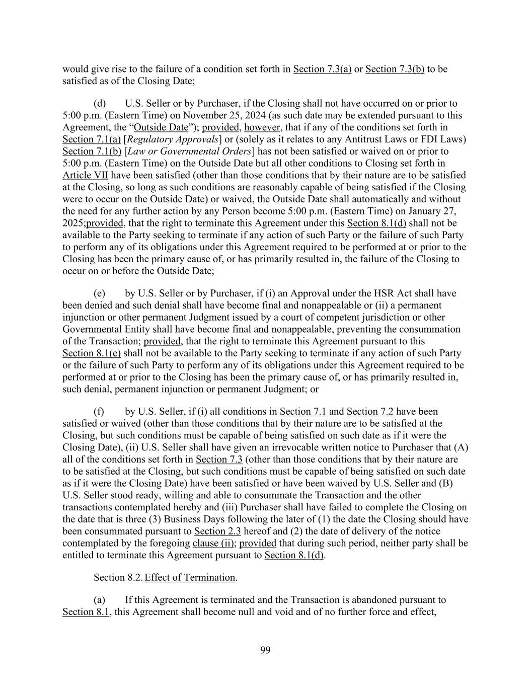 99 would give rise to the failure of a condition set forth in Section 7.3(a) or Section 7.3(b) to be satisfied as of the Closing Date; (d) U.S. Seller or by Purchaser, if the Closing shall not have occurred on or prior to 5:00 p.m. (Eastern Time) on November 25, 2024 (as such date may be extended pursuant to this Agreement, the “Outside Date”); provided, however, that if any of the conditions set forth in Section 7.1(a) [Regulatory Approvals] or (solely as it relates to any Antitrust Laws or FDI Laws) Section 7.1(b) [Law or Governmental Orders] has not been satisfied or waived on or prior to 5:00 p.m. (Eastern Time) on the Outside Date but all other conditions to Closing set forth in Article VII have been satisfied (other than those conditions that by their nature are to be satisfied at the Closing, so long as such conditions are reasonably capable of being satisfied if the Closing were to occur on the Outside Date) or waived, the Outside Date shall automatically and without the need for any further action by any Person become 5:00 p.m. (Eastern Time) on January 27, 2025;provided, that the right to terminate this Agreement under this Section 8.1(d) shall not be available to the Party seeking to terminate if any action of such Party or the failure of such Party to perform any of its obligations under this Agreement required to be performed at or prior to the Closing has been the primary cause of, or has primarily resulted in, the failure of the Closing to occur on or before the Outside Date; (e) by U.S. Seller or by Purchaser, if (i) an Approval under the HSR Act shall have been denied and such denial shall have become final and nonappealable or (ii) a permanent injunction or other permanent Judgment issued by a court of competent jurisdiction or other Governmental Entity shall have become final and nonappealable, preventing the consummation of the Transaction; provided, that the right to terminate this Agreement pursuant to this Section 8.1(e) shall not be available to the Party seeking to terminate if any action of such Party or the failure of such Party to perform any of its obligations under this Agreement required to be performed at or prior to the Closing has been the primary cause of, or has primarily resulted in, such denial, permanent injunction or permanent Judgment; or (f) by U.S. Seller, if (i) all conditions in Section 7.1 and Section 7.2 have been satisfied or waived (other than those conditions that by their nature are to be satisfied at the Closing, but such conditions must be capable of being satisfied on such date as if it were the Closing Date), (ii) U.S. Seller shall have given an irrevocable written notice to Purchaser that (A) all of the conditions set forth in Section 7.3 (other than those conditions that by their nature are to be satisfied at the Closing, but such conditions must be capable of being satisfied on such date as if it were the Closing Date) have been satisfied or have been waived by U.S. Seller and (B) U.S. Seller stood ready, willing and able to consummate the Transaction and the other transactions contemplated hereby and (iii) Purchaser shall have failed to complete the Closing on the date that is three (3) Business Days following the later of (1) the date the Closing should have been consummated pursuant to Section 2.3 hereof and (2) the date of delivery of the notice contemplated by the foregoing clause (ii); provided that during such period, neither party shall be entitled to terminate this Agreement pursuant to Section 8.1(d). Section 8.2. Effect of Termination. (a) If this Agreement is terminated and the Transaction is abandoned pursuant to Section 8.1, this Agreement shall become null and void and of no further force and effect,