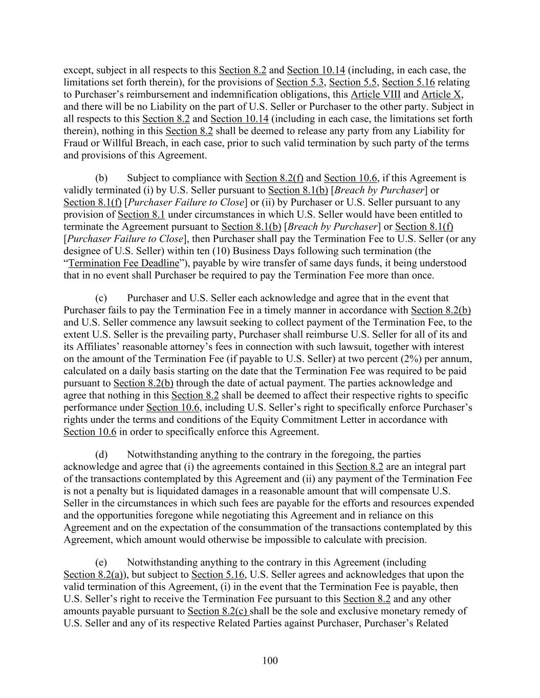 100 except, subject in all respects to this Section 8.2 and Section 10.14 (including, in each case, the limitations set forth therein), for the provisions of Section 5.3, Section 5.5, Section 5.16 relating to Purchaser’s reimbursement and indemnification obligations, this Article VIII and Article X, and there will be no Liability on the part of U.S. Seller or Purchaser to the other party. Subject in all respects to this Section 8.2 and Section 10.14 (including in each case, the limitations set forth therein), nothing in this Section 8.2 shall be deemed to release any party from any Liability for Fraud or Willful Breach, in each case, prior to such valid termination by such party of the terms and provisions of this Agreement. (b) Subject to compliance with Section 8.2(f) and Section 10.6, if this Agreement is validly terminated (i) by U.S. Seller pursuant to Section 8.1(b) [Breach by Purchaser] or Section 8.1(f) [Purchaser Failure to Close] or (ii) by Purchaser or U.S. Seller pursuant to any provision of Section 8.1 under circumstances in which U.S. Seller would have been entitled to terminate the Agreement pursuant to Section 8.1(b) [Breach by Purchaser] or Section 8.1(f) [Purchaser Failure to Close], then Purchaser shall pay the Termination Fee to U.S. Seller (or any designee of U.S. Seller) within ten (10) Business Days following such termination (the “Termination Fee Deadline”), payable by wire transfer of same days funds, it being understood that in no event shall Purchaser be required to pay the Termination Fee more than once. (c) Purchaser and U.S. Seller each acknowledge and agree that in the event that Purchaser fails to pay the Termination Fee in a timely manner in accordance with Section 8.2(b) and U.S. Seller commence any lawsuit seeking to collect payment of the Termination Fee, to the extent U.S. Seller is the prevailing party, Purchaser shall reimburse U.S. Seller for all of its and its Affiliates’ reasonable attorney’s fees in connection with such lawsuit, together with interest on the amount of the Termination Fee (if payable to U.S. Seller) at two percent (2%) per annum, calculated on a daily basis starting on the date that the Termination Fee was required to be paid pursuant to Section 8.2(b) through the date of actual payment. The parties acknowledge and agree that nothing in this Section 8.2 shall be deemed to affect their respective rights to specific performance under Section 10.6, including U.S. Seller’s right to specifically enforce Purchaser’s rights under the terms and conditions of the Equity Commitment Letter in accordance with Section 10.6 in order to specifically enforce this Agreement. (d) Notwithstanding anything to the contrary in the foregoing, the parties acknowledge and agree that (i) the agreements contained in this Section 8.2 are an integral part of the transactions contemplated by this Agreement and (ii) any payment of the Termination Fee is not a penalty but is liquidated damages in a reasonable amount that will compensate U.S. Seller in the circumstances in which such fees are payable for the efforts and resources expended and the opportunities foregone while negotiating this Agreement and in reliance on this Agreement and on the expectation of the consummation of the transactions contemplated by this Agreement, which amount would otherwise be impossible to calculate with precision. (e) Notwithstanding anything to the contrary in this Agreement (including Section 8.2(a)), but subject to Section 5.16, U.S. Seller agrees and acknowledges that upon the valid termination of this Agreement, (i) in the event that the Termination Fee is payable, then U.S. Seller’s right to receive the Termination Fee pursuant to this Section 8.2 and any other amounts payable pursuant to Section 8.2(c) shall be the sole and exclusive monetary remedy of U.S. Seller and any of its respective Related Parties against Purchaser, Purchaser’s Related