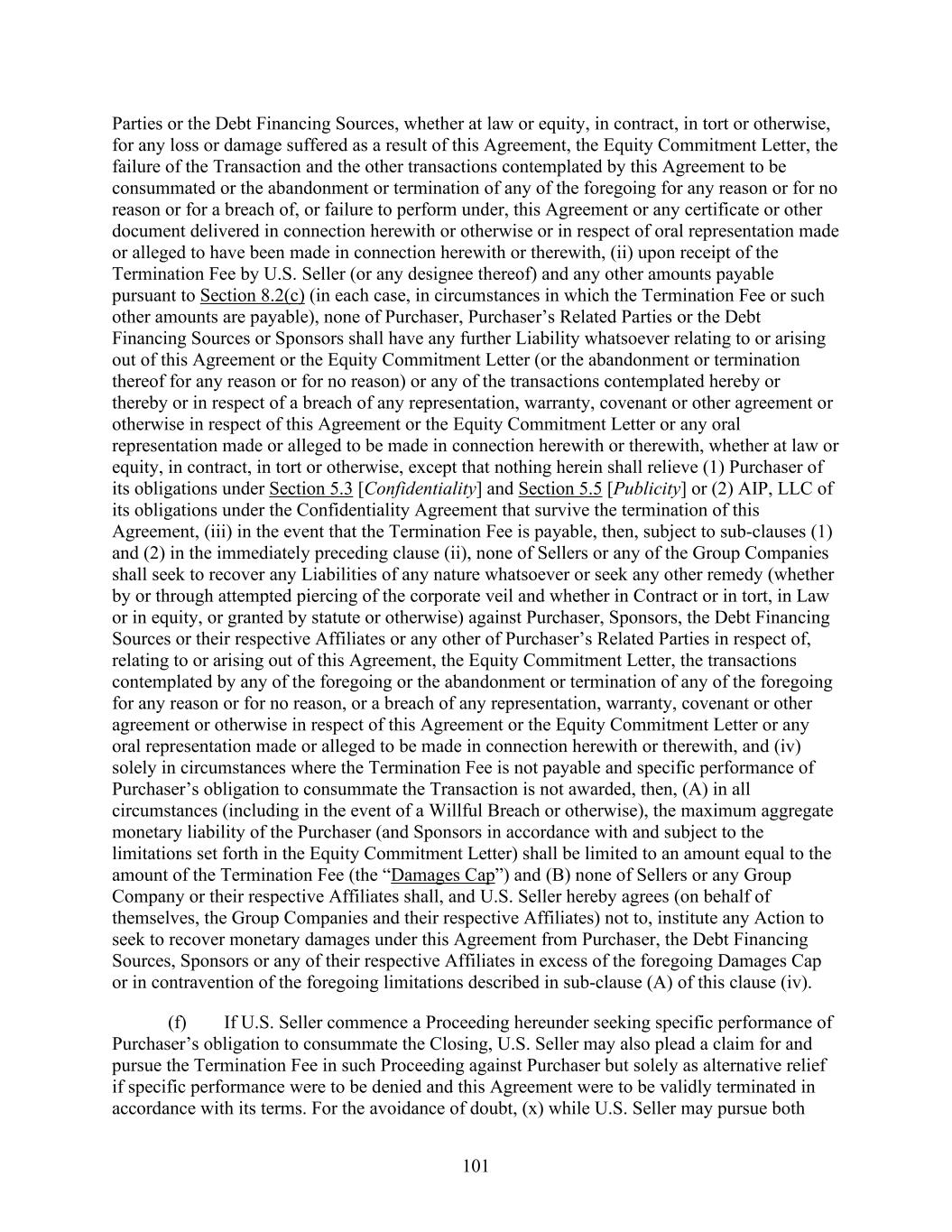 101 Parties or the Debt Financing Sources, whether at law or equity, in contract, in tort or otherwise, for any loss or damage suffered as a result of this Agreement, the Equity Commitment Letter, the failure of the Transaction and the other transactions contemplated by this Agreement to be consummated or the abandonment or termination of any of the foregoing for any reason or for no reason or for a breach of, or failure to perform under, this Agreement or any certificate or other document delivered in connection herewith or otherwise or in respect of oral representation made or alleged to have been made in connection herewith or therewith, (ii) upon receipt of the Termination Fee by U.S. Seller (or any designee thereof) and any other amounts payable pursuant to Section 8.2(c) (in each case, in circumstances in which the Termination Fee or such other amounts are payable), none of Purchaser, Purchaser’s Related Parties or the Debt Financing Sources or Sponsors shall have any further Liability whatsoever relating to or arising out of this Agreement or the Equity Commitment Letter (or the abandonment or termination thereof for any reason or for no reason) or any of the transactions contemplated hereby or thereby or in respect of a breach of any representation, warranty, covenant or other agreement or otherwise in respect of this Agreement or the Equity Commitment Letter or any oral representation made or alleged to be made in connection herewith or therewith, whether at law or equity, in contract, in tort or otherwise, except that nothing herein shall relieve (1) Purchaser of its obligations under Section 5.3 [Confidentiality] and Section 5.5 [Publicity] or (2) AIP, LLC of its obligations under the Confidentiality Agreement that survive the termination of this Agreement, (iii) in the event that the Termination Fee is payable, then, subject to sub-clauses (1) and (2) in the immediately preceding clause (ii), none of Sellers or any of the Group Companies shall seek to recover any Liabilities of any nature whatsoever or seek any other remedy (whether by or through attempted piercing of the corporate veil and whether in Contract or in tort, in Law or in equity, or granted by statute or otherwise) against Purchaser, Sponsors, the Debt Financing Sources or their respective Affiliates or any other of Purchaser’s Related Parties in respect of, relating to or arising out of this Agreement, the Equity Commitment Letter, the transactions contemplated by any of the foregoing or the abandonment or termination of any of the foregoing for any reason or for no reason, or a breach of any representation, warranty, covenant or other agreement or otherwise in respect of this Agreement or the Equity Commitment Letter or any oral representation made or alleged to be made in connection herewith or therewith, and (iv) solely in circumstances where the Termination Fee is not payable and specific performance of Purchaser’s obligation to consummate the Transaction is not awarded, then, (A) in all circumstances (including in the event of a Willful Breach or otherwise), the maximum aggregate monetary liability of the Purchaser (and Sponsors in accordance with and subject to the limitations set forth in the Equity Commitment Letter) shall be limited to an amount equal to the amount of the Termination Fee (the “Damages Cap”) and (B) none of Sellers or any Group Company or their respective Affiliates shall, and U.S. Seller hereby agrees (on behalf of themselves, the Group Companies and their respective Affiliates) not to, institute any Action to seek to recover monetary damages under this Agreement from Purchaser, the Debt Financing Sources, Sponsors or any of their respective Affiliates in excess of the foregoing Damages Cap or in contravention of the foregoing limitations described in sub-clause (A) of this clause (iv). (f) If U.S. Seller commence a Proceeding hereunder seeking specific performance of Purchaser’s obligation to consummate the Closing, U.S. Seller may also plead a claim for and pursue the Termination Fee in such Proceeding against Purchaser but solely as alternative relief if specific performance were to be denied and this Agreement were to be validly terminated in accordance with its terms. For the avoidance of doubt, (x) while U.S. Seller may pursue both