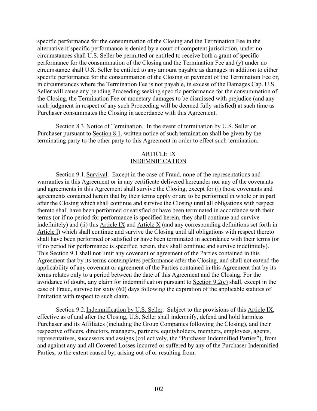 102 specific performance for the consummation of the Closing and the Termination Fee in the alternative if specific performance is denied by a court of competent jurisdiction, under no circumstances shall U.S. Seller be permitted or entitled to receive both a grant of specific performance for the consummation of the Closing and the Termination Fee and (y) under no circumstance shall U.S. Seller be entitled to any amount payable as damages in addition to either specific performance for the consummation of the Closing or payment of the Termination Fee or, in circumstances where the Termination Fee is not payable, in excess of the Damages Cap. U.S. Seller will cause any pending Proceeding seeking specific performance for the consummation of the Closing, the Termination Fee or monetary damages to be dismissed with prejudice (and any such judgment in respect of any such Proceeding will be deemed fully satisfied) at such time as Purchaser consummates the Closing in accordance with this Agreement. Section 8.3. Notice of Termination. In the event of termination by U.S. Seller or Purchaser pursuant to Section 8.1, written notice of such termination shall be given by the terminating party to the other party to this Agreement in order to effect such termination. ARTICLE IX INDEMNIFICATION Section 9.1. Survival. Except in the case of Fraud, none of the representations and warranties in this Agreement or in any certificate delivered hereunder nor any of the covenants and agreements in this Agreement shall survive the Closing, except for (i) those covenants and agreements contained herein that by their terms apply or are to be performed in whole or in part after the Closing which shall continue and survive the Closing until all obligations with respect thereto shall have been performed or satisfied or have been terminated in accordance with their terms (or if no period for performance is specified herein, they shall continue and survive indefinitely) and (ii) this Article IX and Article X (and any corresponding definitions set forth in Article I) which shall continue and survive the Closing until all obligations with respect thereto shall have been performed or satisfied or have been terminated in accordance with their terms (or if no period for performance is specified herein, they shall continue and survive indefinitely). This Section 9.1 shall not limit any covenant or agreement of the Parties contained in this Agreement that by its terms contemplates performance after the Closing, and shall not extend the applicability of any covenant or agreement of the Parties contained in this Agreement that by its terms relates only to a period between the date of this Agreement and the Closing. For the avoidance of doubt, any claim for indemnification pursuant to Section 9.2(c) shall, except in the case of Fraud, survive for sixty (60) days following the expiration of the applicable statutes of limitation with respect to such claim. Section 9.2. Indemnification by U.S. Seller. Subject to the provisions of this Article IX, effective as of and after the Closing, U.S. Seller shall indemnify, defend and hold harmless Purchaser and its Affiliates (including the Group Companies following the Closing), and their respective officers, directors, managers, partners, equityholders, members, employees, agents, representatives, successors and assigns (collectively, the “Purchaser Indemnified Parties”), from and against any and all Covered Losses incurred or suffered by any of the Purchaser Indemnified Parties, to the extent caused by, arising out of or resulting from: