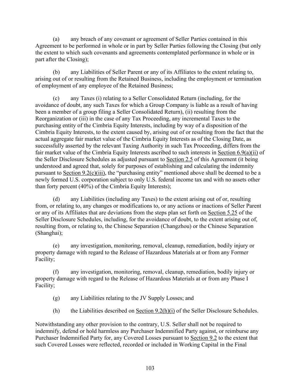 103 (a) any breach of any covenant or agreement of Seller Parties contained in this Agreement to be performed in whole or in part by Seller Parties following the Closing (but only the extent to which such covenants and agreements contemplated performance in whole or in part after the Closing); (b) any Liabilities of Seller Parent or any of its Affiliates to the extent relating to, arising out of or resulting from the Retained Business, including the employment or termination of employment of any employee of the Retained Business; (c) any Taxes (i) relating to a Seller Consolidated Return (including, for the avoidance of doubt, any such Taxes for which a Group Company is liable as a result of having been a member of a group filing a Seller Consolidated Return), (ii) resulting from the Reorganization or (iii) in the case of any Tax Proceeding, any incremental Taxes to the purchasing entity of the Cimbria Equity Interests, including by way of a disposition of the Cimbria Equity Interests, to the extent caused by, arising out of or resulting from the fact that the actual aggregate fair market value of the Cimbria Equity Interests as of the Closing Date, as successfully asserted by the relevant Taxing Authority in such Tax Proceeding, differs from the fair market value of the Cimbria Equity Interests ascribed to such interests in Section 6.9(a)(ii) of the Seller Disclosure Schedules as adjusted pursuant to Section 2.5 of this Agreement (it being understood and agreed that, solely for purposes of establishing and calculating the indemnity pursuant to Section 9.2(c)(iii), the “purchasing entity” mentioned above shall be deemed to be a newly formed U.S. corporation subject to only U.S. federal income tax and with no assets other than forty percent (40%) of the Cimbria Equity Interests); (d) any Liabilities (including any Taxes) to the extent arising out of or, resulting from, or relating to, any changes or modifications to, or any actions or inactions of Seller Parent or any of its Affiliates that are deviations from the steps plan set forth on Section 5.25 of the Seller Disclosure Schedules, including, for the avoidance of doubt, to the extent arising out of, resulting from, or relating to, the Chinese Separation (Changzhou) or the Chinese Separation (Shanghai); (e) any investigation, monitoring, removal, cleanup, remediation, bodily injury or property damage with regard to the Release of Hazardous Materials at or from any Former Facility; (f) any investigation, monitoring, removal, cleanup, remediation, bodily injury or property damage with regard to the Release of Hazardous Materials at or from any Phase I Facility; (g) any Liabilities relating to the JV Supply Losses; and (h) the Liabilities described on Section 9.2(h)(i) of the Seller Disclosure Schedules. Notwithstanding any other provision to the contrary, U.S. Seller shall not be required to indemnify, defend or hold harmless any Purchaser Indemnified Party against, or reimburse any Purchaser Indemnified Party for, any Covered Losses pursuant to Section 9.2 to the extent that such Covered Losses were reflected, recorded or included in Working Capital in the Final