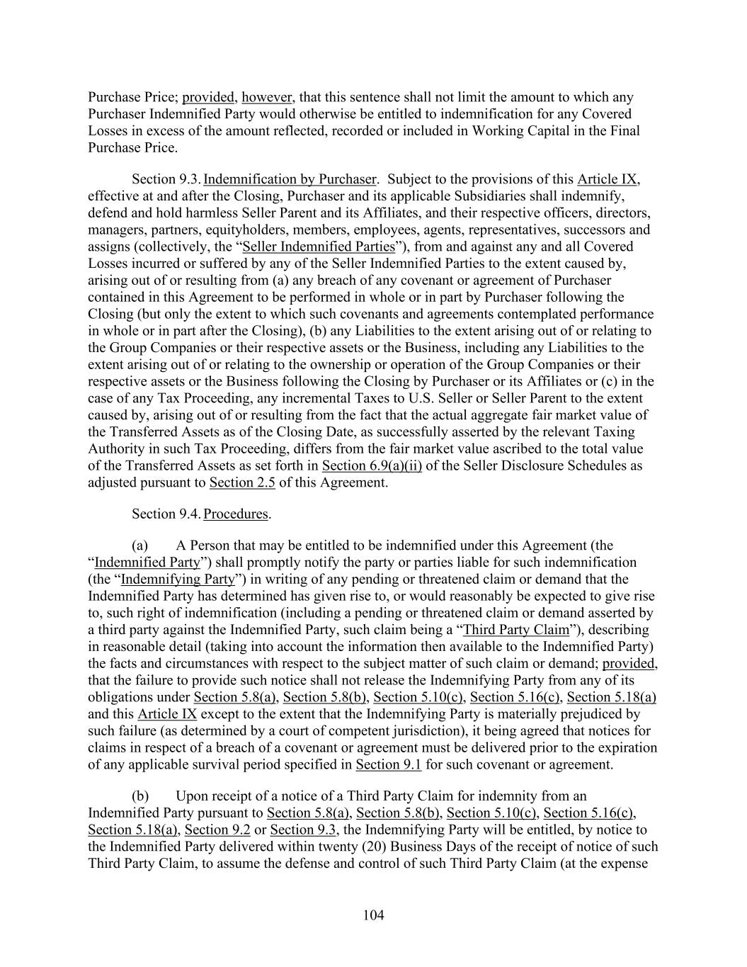 104 Purchase Price; provided, however, that this sentence shall not limit the amount to which any Purchaser Indemnified Party would otherwise be entitled to indemnification for any Covered Losses in excess of the amount reflected, recorded or included in Working Capital in the Final Purchase Price. Section 9.3. Indemnification by Purchaser. Subject to the provisions of this Article IX, effective at and after the Closing, Purchaser and its applicable Subsidiaries shall indemnify, defend and hold harmless Seller Parent and its Affiliates, and their respective officers, directors, managers, partners, equityholders, members, employees, agents, representatives, successors and assigns (collectively, the “Seller Indemnified Parties”), from and against any and all Covered Losses incurred or suffered by any of the Seller Indemnified Parties to the extent caused by, arising out of or resulting from (a) any breach of any covenant or agreement of Purchaser contained in this Agreement to be performed in whole or in part by Purchaser following the Closing (but only the extent to which such covenants and agreements contemplated performance in whole or in part after the Closing), (b) any Liabilities to the extent arising out of or relating to the Group Companies or their respective assets or the Business, including any Liabilities to the extent arising out of or relating to the ownership or operation of the Group Companies or their respective assets or the Business following the Closing by Purchaser or its Affiliates or (c) in the case of any Tax Proceeding, any incremental Taxes to U.S. Seller or Seller Parent to the extent caused by, arising out of or resulting from the fact that the actual aggregate fair market value of the Transferred Assets as of the Closing Date, as successfully asserted by the relevant Taxing Authority in such Tax Proceeding, differs from the fair market value ascribed to the total value of the Transferred Assets as set forth in Section 6.9(a)(ii) of the Seller Disclosure Schedules as adjusted pursuant to Section 2.5 of this Agreement. Section 9.4. Procedures. (a) A Person that may be entitled to be indemnified under this Agreement (the “Indemnified Party”) shall promptly notify the party or parties liable for such indemnification (the “Indemnifying Party”) in writing of any pending or threatened claim or demand that the Indemnified Party has determined has given rise to, or would reasonably be expected to give rise to, such right of indemnification (including a pending or threatened claim or demand asserted by a third party against the Indemnified Party, such claim being a “Third Party Claim”), describing in reasonable detail (taking into account the information then available to the Indemnified Party) the facts and circumstances with respect to the subject matter of such claim or demand; provided, that the failure to provide such notice shall not release the Indemnifying Party from any of its obligations under Section 5.8(a), Section 5.8(b), Section 5.10(c), Section 5.16(c), Section 5.18(a) and this Article IX except to the extent that the Indemnifying Party is materially prejudiced by such failure (as determined by a court of competent jurisdiction), it being agreed that notices for claims in respect of a breach of a covenant or agreement must be delivered prior to the expiration of any applicable survival period specified in Section 9.1 for such covenant or agreement. (b) Upon receipt of a notice of a Third Party Claim for indemnity from an Indemnified Party pursuant to Section 5.8(a), Section 5.8(b), Section 5.10(c), Section 5.16(c), Section 5.18(a), Section 9.2 or Section 9.3, the Indemnifying Party will be entitled, by notice to the Indemnified Party delivered within twenty (20) Business Days of the receipt of notice of such Third Party Claim, to assume the defense and control of such Third Party Claim (at the expense