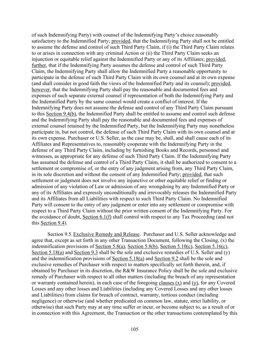 105 of such Indemnifying Party) with counsel of the Indemnifying Party’s choice reasonably satisfactory to the Indemnified Party; provided, that the Indemnifying Party shall not be entitled to assume the defense and control of such Third Party Claim, if (i) the Third Party Claim relates to or arises in connection with any criminal Action or (ii) the Third Party Claim seeks an injunction or equitable relief against the Indemnified Party or any of its Affiliates; provided, further, that if the Indemnifying Party assumes the defense and control of such Third Party Claim, the Indemnifying Party shall allow the Indemnified Party a reasonable opportunity to participate in the defense of such Third Party Claim with its own counsel and at its own expense (and shall consider in good faith the views of the Indemnified Party and its counsel); provided, however, that the Indemnifying Party shall pay the reasonable and documented fees and expenses of such separate external counsel if representation of both the Indemnifying Party and the Indemnified Party by the same counsel would create a conflict of interest. If the Indemnifying Party does not assume the defense and control of any Third Party Claim pursuant to this Section 9.4(b), the Indemnified Party shall be entitled to assume and control such defense and the Indemnifying Party shall pay the reasonable and documented fees and expenses of external counsel retained by the Indemnified Party, but the Indemnifying Party may nonetheless participate in, but not control, the defense of such Third Party Claim with its own counsel and at its own expense. Purchaser or U.S. Seller, as the case may be, shall, and shall cause each of its Affiliates and Representatives to, reasonably cooperate with the Indemnifying Party in the defense of any Third Party Claim, including by furnishing Books and Records, personnel and witnesses, as appropriate for any defense of such Third Party Claim. If the Indemnifying Party has assumed the defense and control of a Third Party Claim, it shall be authorized to consent to a settlement or compromise of, or the entry of any judgment arising from, any Third Party Claim, in its sole discretion and without the consent of any Indemnified Party; provided, that such settlement or judgment does not involve any injunctive or other equitable relief or finding or admission of any violation of Law or admission of any wrongdoing by any Indemnified Party or any of its Affiliates and expressly unconditionally and irrevocably releases the Indemnified Party and its Affiliates from all Liabilities with respect to such Third Party Claim. No Indemnified Party will consent to the entry of any judgment or enter into any settlement or compromise with respect to a Third Party Claim without the prior written consent of the Indemnifying Party. For the avoidance of doubt, Section 6.1(f) shall control with respect to any Tax Proceeding (and not this Section 9.4). Section 9.5. Exclusive Remedy and Release. Purchaser and U.S. Seller acknowledge and agree that, except as set forth in any other Transaction Document, following the Closing, (x) the indemnification provisions of Section 5.8(a), Section 5.8(b), Section 5.10(c), Section 5.16(c), Section 5.18(a) and Section 9.3 shall be the sole and exclusive remedies of U.S. Seller and (y) and the indemnification provisions of Section 5.18(a) and Section 9.2 shall be the sole and exclusive remedies of Purchaser with respect to matters specifically set forth therein, and, if obtained by Purchaser in its discretion, the R&W Insurance Policy shall be the sole and exclusive remedy of Purchaser with respect to all other matters (including the breach of any representation or warranty contained herein), in each case of the foregoing clauses (x) and (y), for any Covered Losses and any other losses and Liabilities (including any Covered Losses and any other losses and Liabilities) from claims for breach of contract, warranty, tortious conduct (including negligence) or otherwise (and whether predicated on common law, statute, strict liability, or otherwise) that such Party may at any time suffer or incur, or become subject to, as a result of or in connection with this Agreement, the Transaction or the other transactions contemplated by this