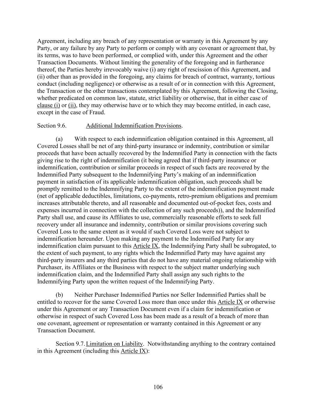106 Agreement, including any breach of any representation or warranty in this Agreement by any Party, or any failure by any Party to perform or comply with any covenant or agreement that, by its terms, was to have been performed, or complied with, under this Agreement and the other Transaction Documents. Without limiting the generality of the foregoing and in furtherance thereof, the Parties hereby irrevocably waive (i) any right of rescission of this Agreement, and (ii) other than as provided in the foregoing, any claims for breach of contract, warranty, tortious conduct (including negligence) or otherwise as a result of or in connection with this Agreement, the Transaction or the other transactions contemplated by this Agreement, following the Closing, whether predicated on common law, statute, strict liability or otherwise, that in either case of clause (i) or (ii), they may otherwise have or to which they may become entitled, in each case, except in the case of Fraud. Section 9.6. Additional Indemnification Provisions. (a) With respect to each indemnification obligation contained in this Agreement, all Covered Losses shall be net of any third-party insurance or indemnity, contribution or similar proceeds that have been actually recovered by the Indemnified Party in connection with the facts giving rise to the right of indemnification (it being agreed that if third-party insurance or indemnification, contribution or similar proceeds in respect of such facts are recovered by the Indemnified Party subsequent to the Indemnifying Party’s making of an indemnification payment in satisfaction of its applicable indemnification obligation, such proceeds shall be promptly remitted to the Indemnifying Party to the extent of the indemnification payment made (net of applicable deductibles, limitations, co-payments, retro-premium obligations and premium increases attributable thereto, and all reasonable and documented out-of-pocket fees, costs and expenses incurred in connection with the collection of any such proceeds)), and the Indemnified Party shall use, and cause its Affiliates to use, commercially reasonable efforts to seek full recovery under all insurance and indemnity, contribution or similar provisions covering such Covered Loss to the same extent as it would if such Covered Loss were not subject to indemnification hereunder. Upon making any payment to the Indemnified Party for any indemnification claim pursuant to this Article IX, the Indemnifying Party shall be subrogated, to the extent of such payment, to any rights which the Indemnified Party may have against any third-party insurers and any third parties that do not have any material ongoing relationship with Purchaser, its Affiliates or the Business with respect to the subject matter underlying such indemnification claim, and the Indemnified Party shall assign any such rights to the Indemnifying Party upon the written request of the Indemnifying Party. (b) Neither Purchaser Indemnified Parties nor Seller Indemnified Parties shall be entitled to recover for the same Covered Loss more than once under this Article IX or otherwise under this Agreement or any Transaction Document even if a claim for indemnification or otherwise in respect of such Covered Loss has been made as a result of a breach of more than one covenant, agreement or representation or warranty contained in this Agreement or any Transaction Document. Section 9.7. Limitation on Liability. Notwithstanding anything to the contrary contained in this Agreement (including this Article IX):