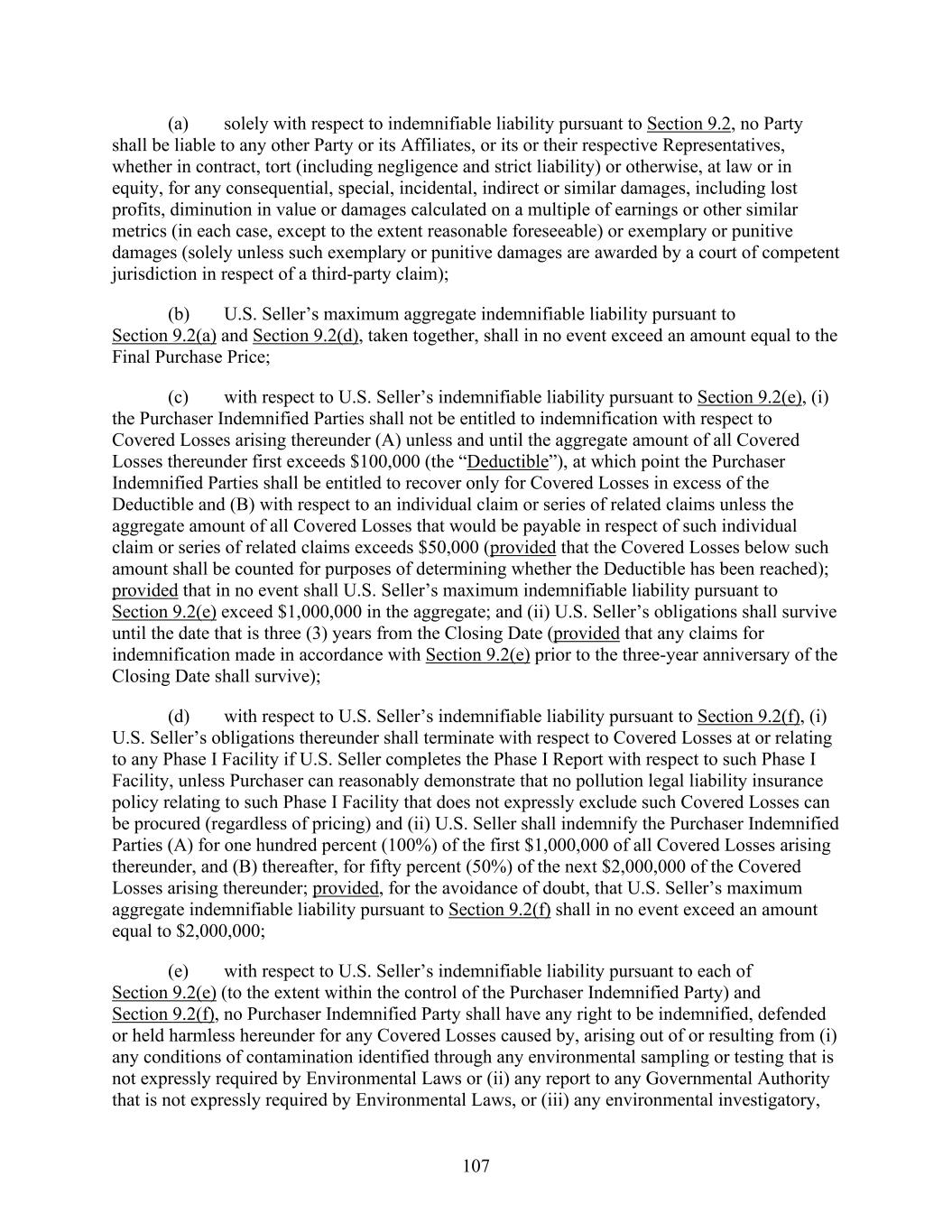 107 (a) solely with respect to indemnifiable liability pursuant to Section 9.2, no Party shall be liable to any other Party or its Affiliates, or its or their respective Representatives, whether in contract, tort (including negligence and strict liability) or otherwise, at law or in equity, for any consequential, special, incidental, indirect or similar damages, including lost profits, diminution in value or damages calculated on a multiple of earnings or other similar metrics (in each case, except to the extent reasonable foreseeable) or exemplary or punitive damages (solely unless such exemplary or punitive damages are awarded by a court of competent jurisdiction in respect of a third-party claim); (b) U.S. Seller’s maximum aggregate indemnifiable liability pursuant to Section 9.2(a) and Section 9.2(d), taken together, shall in no event exceed an amount equal to the Final Purchase Price; (c) with respect to U.S. Seller’s indemnifiable liability pursuant to Section 9.2(e), (i) the Purchaser Indemnified Parties shall not be entitled to indemnification with respect to Covered Losses arising thereunder (A) unless and until the aggregate amount of all Covered Losses thereunder first exceeds $100,000 (the “Deductible”), at which point the Purchaser Indemnified Parties shall be entitled to recover only for Covered Losses in excess of the Deductible and (B) with respect to an individual claim or series of related claims unless the aggregate amount of all Covered Losses that would be payable in respect of such individual claim or series of related claims exceeds $50,000 (provided that the Covered Losses below such amount shall be counted for purposes of determining whether the Deductible has been reached); provided that in no event shall U.S. Seller’s maximum indemnifiable liability pursuant to Section 9.2(e) exceed $1,000,000 in the aggregate; and (ii) U.S. Seller’s obligations shall survive until the date that is three (3) years from the Closing Date (provided that any claims for indemnification made in accordance with Section 9.2(e) prior to the three-year anniversary of the Closing Date shall survive); (d) with respect to U.S. Seller’s indemnifiable liability pursuant to Section 9.2(f), (i) U.S. Seller’s obligations thereunder shall terminate with respect to Covered Losses at or relating to any Phase I Facility if U.S. Seller completes the Phase I Report with respect to such Phase I Facility, unless Purchaser can reasonably demonstrate that no pollution legal liability insurance policy relating to such Phase I Facility that does not expressly exclude such Covered Losses can be procured (regardless of pricing) and (ii) U.S. Seller shall indemnify the Purchaser Indemnified Parties (A) for one hundred percent (100%) of the first $1,000,000 of all Covered Losses arising thereunder, and (B) thereafter, for fifty percent (50%) of the next $2,000,000 of the Covered Losses arising thereunder; provided, for the avoidance of doubt, that U.S. Seller’s maximum aggregate indemnifiable liability pursuant to Section 9.2(f) shall in no event exceed an amount equal to $2,000,000; (e) with respect to U.S. Seller’s indemnifiable liability pursuant to each of Section 9.2(e) (to the extent within the control of the Purchaser Indemnified Party) and Section 9.2(f), no Purchaser Indemnified Party shall have any right to be indemnified, defended or held harmless hereunder for any Covered Losses caused by, arising out of or resulting from (i) any conditions of contamination identified through any environmental sampling or testing that is not expressly required by Environmental Laws or (ii) any report to any Governmental Authority that is not expressly required by Environmental Laws, or (iii) any environmental investigatory,