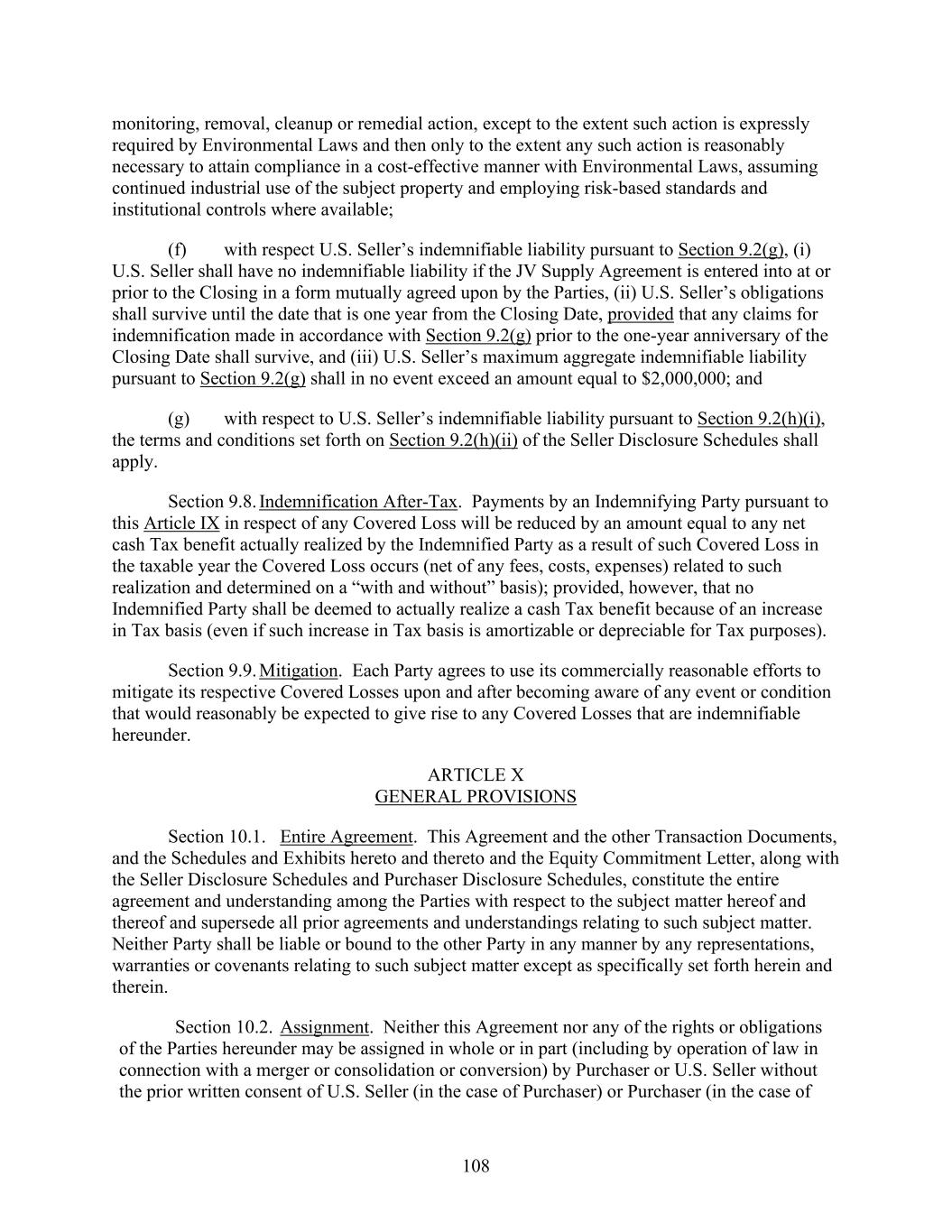 108 monitoring, removal, cleanup or remedial action, except to the extent such action is expressly required by Environmental Laws and then only to the extent any such action is reasonably necessary to attain compliance in a cost-effective manner with Environmental Laws, assuming continued industrial use of the subject property and employing risk-based standards and institutional controls where available; (f) with respect U.S. Seller’s indemnifiable liability pursuant to Section 9.2(g), (i) U.S. Seller shall have no indemnifiable liability if the JV Supply Agreement is entered into at or prior to the Closing in a form mutually agreed upon by the Parties, (ii) U.S. Seller’s obligations shall survive until the date that is one year from the Closing Date, provided that any claims for indemnification made in accordance with Section 9.2(g) prior to the one-year anniversary of the Closing Date shall survive, and (iii) U.S. Seller’s maximum aggregate indemnifiable liability pursuant to Section 9.2(g) shall in no event exceed an amount equal to $2,000,000; and (g) with respect to U.S. Seller’s indemnifiable liability pursuant to Section 9.2(h)(i), the terms and conditions set forth on Section 9.2(h)(ii) of the Seller Disclosure Schedules shall apply. Section 9.8. Indemnification After-Tax. Payments by an Indemnifying Party pursuant to this Article IX in respect of any Covered Loss will be reduced by an amount equal to any net cash Tax benefit actually realized by the Indemnified Party as a result of such Covered Loss in the taxable year the Covered Loss occurs (net of any fees, costs, expenses) related to such realization and determined on a “with and without” basis); provided, however, that no Indemnified Party shall be deemed to actually realize a cash Tax benefit because of an increase in Tax basis (even if such increase in Tax basis is amortizable or depreciable for Tax purposes). Section 9.9. Mitigation. Each Party agrees to use its commercially reasonable efforts to mitigate its respective Covered Losses upon and after becoming aware of any event or condition that would reasonably be expected to give rise to any Covered Losses that are indemnifiable hereunder. ARTICLE X GENERAL PROVISIONS Section 10.1. Entire Agreement. This Agreement and the other Transaction Documents, and the Schedules and Exhibits hereto and thereto and the Equity Commitment Letter, along with the Seller Disclosure Schedules and Purchaser Disclosure Schedules, constitute the entire agreement and understanding among the Parties with respect to the subject matter hereof and thereof and supersede all prior agreements and understandings relating to such subject matter. Neither Party shall be liable or bound to the other Party in any manner by any representations, warranties or covenants relating to such subject matter except as specifically set forth herein and therein. Section 10.2. Assignment. Neither this Agreement nor any of the rights or obligations of the Parties hereunder may be assigned in whole or in part (including by operation of law in connection with a merger or consolidation or conversion) by Purchaser or U.S. Seller without the prior written consent of U.S. Seller (in the case of Purchaser) or Purchaser (in the case of