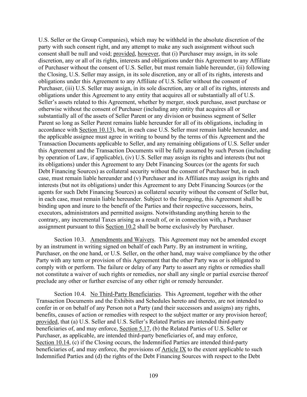 109 U.S. Seller or the Group Companies), which may be withheld in the absolute discretion of the party with such consent right, and any attempt to make any such assignment without such consent shall be null and void; provided, however, that (i) Purchaser may assign, in its sole discretion, any or all of its rights, interests and obligations under this Agreement to any Affiliate of Purchaser without the consent of U.S. Seller, but must remain liable hereunder, (ii) following the Closing, U.S. Seller may assign, in its sole discretion, any or all of its rights, interests and obligations under this Agreement to any Affiliate of U.S. Seller without the consent of Purchaser, (iii) U.S. Seller may assign, in its sole discretion, any or all of its rights, interests and obligations under this Agreement to any entity that acquires all or substantially all of U.S. Seller’s assets related to this Agreement, whether by merger, stock purchase, asset purchase or otherwise without the consent of Purchaser (including any entity that acquires all or substantially all of the assets of Seller Parent or any division or business segment of Seller Parent so long as Seller Parent remains liable hereunder for all of its obligations, including in accordance with Section 10.13), but, in each case U.S. Seller must remain liable hereunder, and the applicable assignee must agree in writing to bound by the terms of this Agreement and the Transaction Documents applicable to Seller, and any remaining obligations of U.S. Seller under this Agreement and the Transaction Documents will be fully assumed by such Person (including by operation of Law, if applicable), (iv) U.S. Seller may assign its rights and interests (but not its obligations) under this Agreement to any Debt Financing Sources (or the agents for such Debt Financing Sources) as collateral security without the consent of Purchaser but, in each case, must remain liable hereunder and (v) Purchaser and its Affiliates may assign its rights and interests (but not its obligations) under this Agreement to any Debt Financing Sources (or the agents for such Debt Financing Sources) as collateral security without the consent of Seller but, in each case, must remain liable hereunder. Subject to the foregoing, this Agreement shall be binding upon and inure to the benefit of the Parties and their respective successors, heirs, executors, administrators and permitted assigns. Notwithstanding anything herein to the contrary, any incremental Taxes arising as a result of, or in connection with, a Purchaser assignment pursuant to this Section 10.2 shall be borne exclusively by Purchaser. Section 10.3. Amendments and Waivers. This Agreement may not be amended except by an instrument in writing signed on behalf of each Party. By an instrument in writing, Purchaser, on the one hand, or U.S. Seller, on the other hand, may waive compliance by the other Party with any term or provision of this Agreement that the other Party was or is obligated to comply with or perform. The failure or delay of any Party to assert any rights or remedies shall not constitute a waiver of such rights or remedies, nor shall any single or partial exercise thereof preclude any other or further exercise of any other right or remedy hereunder. Section 10.4. No Third-Party Beneficiaries. This Agreement, together with the other Transaction Documents and the Exhibits and Schedules hereto and thereto, are not intended to confer in or on behalf of any Person not a Party (and their successors and assigns) any rights, benefits, causes of action or remedies with respect to the subject matter or any provision hereof; provided, that (a) U.S. Seller and U.S. Seller’s Related Parties are intended third-party beneficiaries of, and may enforce, Section 5.17, (b) the Related Parties of U.S. Seller or Purchaser, as applicable, are intended third-party beneficiaries of, and may enforce, Section 10.14, (c) if the Closing occurs, the Indemnified Parties are intended third-party beneficiaries of, and may enforce, the provisions of Article IX to the extent applicable to such Indemnified Parties and (d) the rights of the Debt Financing Sources with respect to the Debt