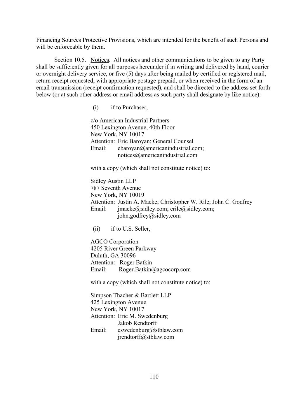 110 Financing Sources Protective Provisions, which are intended for the benefit of such Persons and will be enforceable by them. Section 10.5. Notices. All notices and other communications to be given to any Party shall be sufficiently given for all purposes hereunder if in writing and delivered by hand, courier or overnight delivery service, or five (5) days after being mailed by certified or registered mail, return receipt requested, with appropriate postage prepaid, or when received in the form of an email transmission (receipt confirmation requested), and shall be directed to the address set forth below (or at such other address or email address as such party shall designate by like notice): (i) if to Purchaser, c/o American Industrial Partners 450 Lexington Avenue, 40th Floor New York, NY 10017 Attention: Eric Baroyan; General Counsel Email: ebaroyan@americanindustrial.com; notices@americanindustrial.com with a copy (which shall not constitute notice) to: Sidley Austin LLP 787 Seventh Avenue New York, NY 10019 Attention: Justin A. Macke; Christopher W. Rile; John C. Godfrey Email: jmacke@sidley.com; crile@sidley.com; john.godfrey@sidley.com (ii) if to U.S. Seller, AGCO Corporation 4205 River Green Parkway Duluth, GA 30096 Attention: Roger Batkin Email: Roger.Batkin@agcocorp.com with a copy (which shall not constitute notice) to: Simpson Thacher & Bartlett LLP 425 Lexington Avenue New York, NY 10017 Attention: Eric M. Swedenburg Jakob Rendtorff Email: eswedenburg@stblaw.com jrendtorff@stblaw.com
