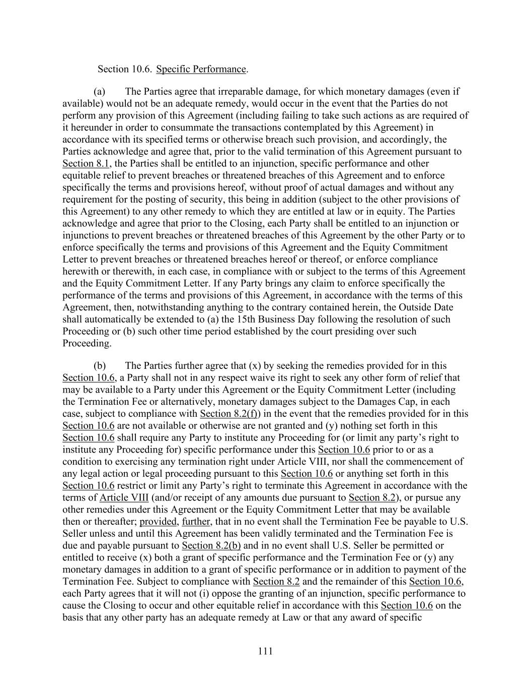111 Section 10.6. Specific Performance. (a) The Parties agree that irreparable damage, for which monetary damages (even if available) would not be an adequate remedy, would occur in the event that the Parties do not perform any provision of this Agreement (including failing to take such actions as are required of it hereunder in order to consummate the transactions contemplated by this Agreement) in accordance with its specified terms or otherwise breach such provision, and accordingly, the Parties acknowledge and agree that, prior to the valid termination of this Agreement pursuant to Section 8.1, the Parties shall be entitled to an injunction, specific performance and other equitable relief to prevent breaches or threatened breaches of this Agreement and to enforce specifically the terms and provisions hereof, without proof of actual damages and without any requirement for the posting of security, this being in addition (subject to the other provisions of this Agreement) to any other remedy to which they are entitled at law or in equity. The Parties acknowledge and agree that prior to the Closing, each Party shall be entitled to an injunction or injunctions to prevent breaches or threatened breaches of this Agreement by the other Party or to enforce specifically the terms and provisions of this Agreement and the Equity Commitment Letter to prevent breaches or threatened breaches hereof or thereof, or enforce compliance herewith or therewith, in each case, in compliance with or subject to the terms of this Agreement and the Equity Commitment Letter. If any Party brings any claim to enforce specifically the performance of the terms and provisions of this Agreement, in accordance with the terms of this Agreement, then, notwithstanding anything to the contrary contained herein, the Outside Date shall automatically be extended to (a) the 15th Business Day following the resolution of such Proceeding or (b) such other time period established by the court presiding over such Proceeding. (b) The Parties further agree that (x) by seeking the remedies provided for in this Section 10.6, a Party shall not in any respect waive its right to seek any other form of relief that may be available to a Party under this Agreement or the Equity Commitment Letter (including the Termination Fee or alternatively, monetary damages subject to the Damages Cap, in each case, subject to compliance with Section 8.2(f)) in the event that the remedies provided for in this Section 10.6 are not available or otherwise are not granted and (y) nothing set forth in this Section 10.6 shall require any Party to institute any Proceeding for (or limit any party’s right to institute any Proceeding for) specific performance under this Section 10.6 prior to or as a condition to exercising any termination right under Article VIII, nor shall the commencement of any legal action or legal proceeding pursuant to this Section 10.6 or anything set forth in this Section 10.6 restrict or limit any Party’s right to terminate this Agreement in accordance with the terms of Article VIII (and/or receipt of any amounts due pursuant to Section 8.2), or pursue any other remedies under this Agreement or the Equity Commitment Letter that may be available then or thereafter; provided, further, that in no event shall the Termination Fee be payable to U.S. Seller unless and until this Agreement has been validly terminated and the Termination Fee is due and payable pursuant to Section 8.2(b) and in no event shall U.S. Seller be permitted or entitled to receive (x) both a grant of specific performance and the Termination Fee or (y) any monetary damages in addition to a grant of specific performance or in addition to payment of the Termination Fee. Subject to compliance with Section 8.2 and the remainder of this Section 10.6, each Party agrees that it will not (i) oppose the granting of an injunction, specific performance to cause the Closing to occur and other equitable relief in accordance with this Section 10.6 on the basis that any other party has an adequate remedy at Law or that any award of specific