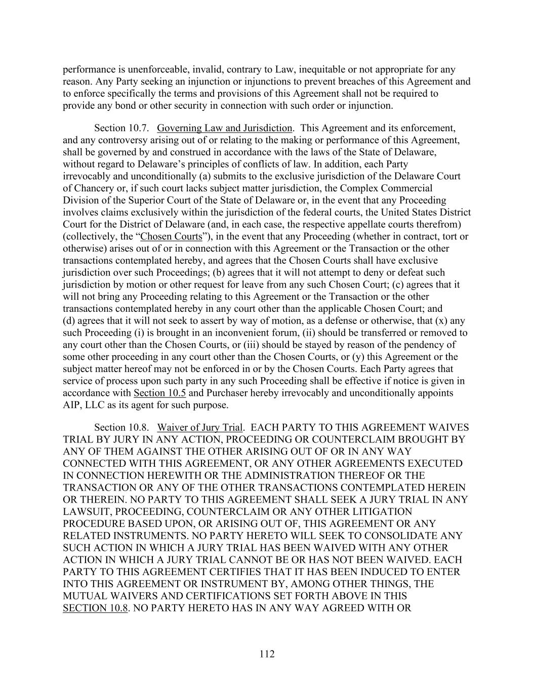 112 performance is unenforceable, invalid, contrary to Law, inequitable or not appropriate for any reason. Any Party seeking an injunction or injunctions to prevent breaches of this Agreement and to enforce specifically the terms and provisions of this Agreement shall not be required to provide any bond or other security in connection with such order or injunction. Section 10.7. Governing Law and Jurisdiction. This Agreement and its enforcement, and any controversy arising out of or relating to the making or performance of this Agreement, shall be governed by and construed in accordance with the laws of the State of Delaware, without regard to Delaware’s principles of conflicts of law. In addition, each Party irrevocably and unconditionally (a) submits to the exclusive jurisdiction of the Delaware Court of Chancery or, if such court lacks subject matter jurisdiction, the Complex Commercial Division of the Superior Court of the State of Delaware or, in the event that any Proceeding involves claims exclusively within the jurisdiction of the federal courts, the United States District Court for the District of Delaware (and, in each case, the respective appellate courts therefrom) (collectively, the “Chosen Courts”), in the event that any Proceeding (whether in contract, tort or otherwise) arises out of or in connection with this Agreement or the Transaction or the other transactions contemplated hereby, and agrees that the Chosen Courts shall have exclusive jurisdiction over such Proceedings; (b) agrees that it will not attempt to deny or defeat such jurisdiction by motion or other request for leave from any such Chosen Court; (c) agrees that it will not bring any Proceeding relating to this Agreement or the Transaction or the other transactions contemplated hereby in any court other than the applicable Chosen Court; and (d) agrees that it will not seek to assert by way of motion, as a defense or otherwise, that (x) any such Proceeding (i) is brought in an inconvenient forum, (ii) should be transferred or removed to any court other than the Chosen Courts, or (iii) should be stayed by reason of the pendency of some other proceeding in any court other than the Chosen Courts, or (y) this Agreement or the subject matter hereof may not be enforced in or by the Chosen Courts. Each Party agrees that service of process upon such party in any such Proceeding shall be effective if notice is given in accordance with Section 10.5 and Purchaser hereby irrevocably and unconditionally appoints AIP, LLC as its agent for such purpose. Section 10.8. Waiver of Jury Trial. EACH PARTY TO THIS AGREEMENT WAIVES TRIAL BY JURY IN ANY ACTION, PROCEEDING OR COUNTERCLAIM BROUGHT BY ANY OF THEM AGAINST THE OTHER ARISING OUT OF OR IN ANY WAY CONNECTED WITH THIS AGREEMENT, OR ANY OTHER AGREEMENTS EXECUTED IN CONNECTION HEREWITH OR THE ADMINISTRATION THEREOF OR THE TRANSACTION OR ANY OF THE OTHER TRANSACTIONS CONTEMPLATED HEREIN OR THEREIN. NO PARTY TO THIS AGREEMENT SHALL SEEK A JURY TRIAL IN ANY LAWSUIT, PROCEEDING, COUNTERCLAIM OR ANY OTHER LITIGATION PROCEDURE BASED UPON, OR ARISING OUT OF, THIS AGREEMENT OR ANY RELATED INSTRUMENTS. NO PARTY HERETO WILL SEEK TO CONSOLIDATE ANY SUCH ACTION IN WHICH A JURY TRIAL HAS BEEN WAIVED WITH ANY OTHER ACTION IN WHICH A JURY TRIAL CANNOT BE OR HAS NOT BEEN WAIVED. EACH PARTY TO THIS AGREEMENT CERTIFIES THAT IT HAS BEEN INDUCED TO ENTER INTO THIS AGREEMENT OR INSTRUMENT BY, AMONG OTHER THINGS, THE MUTUAL WAIVERS AND CERTIFICATIONS SET FORTH ABOVE IN THIS SECTION 10.8. NO PARTY HERETO HAS IN ANY WAY AGREED WITH OR