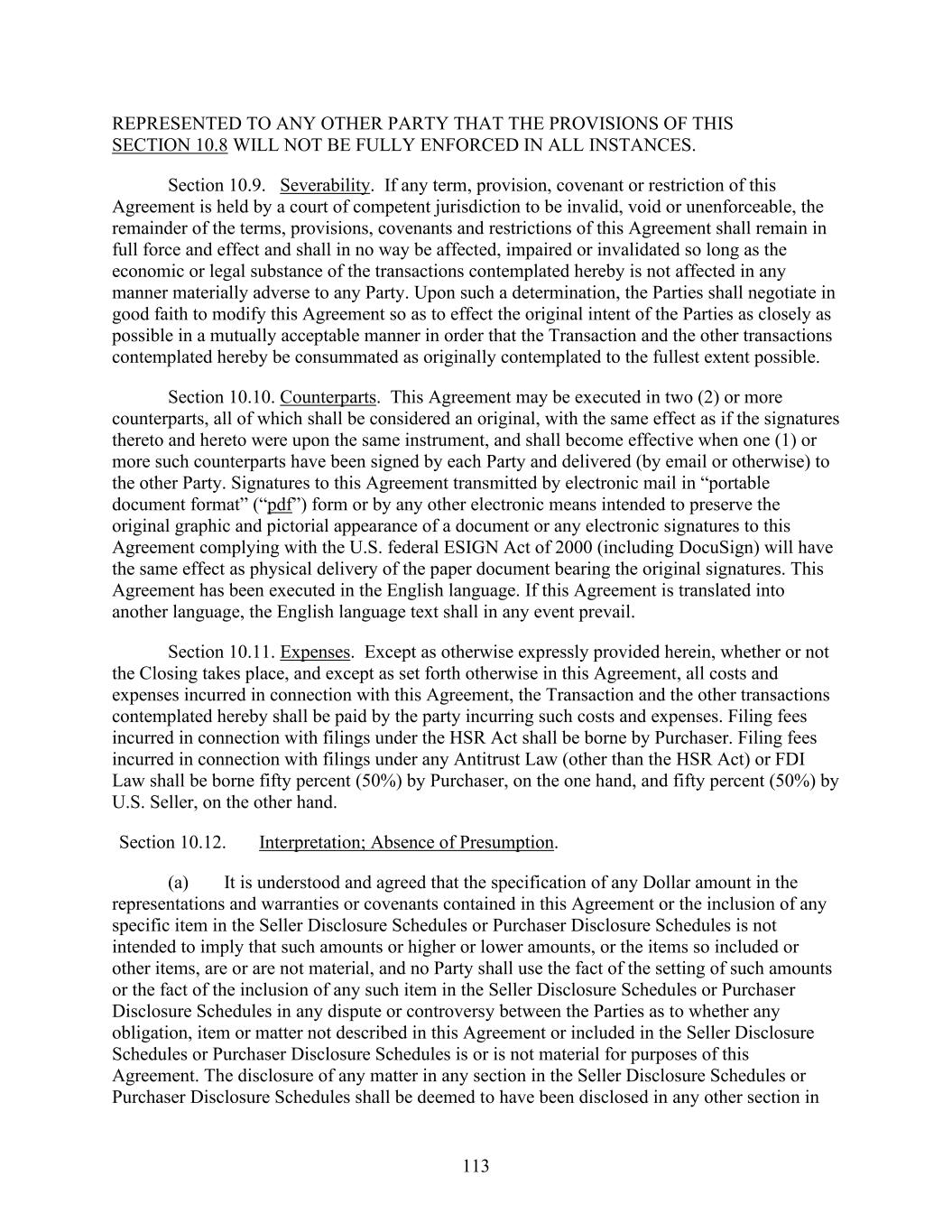 113 REPRESENTED TO ANY OTHER PARTY THAT THE PROVISIONS OF THIS SECTION 10.8 WILL NOT BE FULLY ENFORCED IN ALL INSTANCES. Section 10.9. Severability. If any term, provision, covenant or restriction of this Agreement is held by a court of competent jurisdiction to be invalid, void or unenforceable, the remainder of the terms, provisions, covenants and restrictions of this Agreement shall remain in full force and effect and shall in no way be affected, impaired or invalidated so long as the economic or legal substance of the transactions contemplated hereby is not affected in any manner materially adverse to any Party. Upon such a determination, the Parties shall negotiate in good faith to modify this Agreement so as to effect the original intent of the Parties as closely as possible in a mutually acceptable manner in order that the Transaction and the other transactions contemplated hereby be consummated as originally contemplated to the fullest extent possible. Section 10.10. Counterparts. This Agreement may be executed in two (2) or more counterparts, all of which shall be considered an original, with the same effect as if the signatures thereto and hereto were upon the same instrument, and shall become effective when one (1) or more such counterparts have been signed by each Party and delivered (by email or otherwise) to the other Party. Signatures to this Agreement transmitted by electronic mail in “portable document format” (“pdf”) form or by any other electronic means intended to preserve the original graphic and pictorial appearance of a document or any electronic signatures to this Agreement complying with the U.S. federal ESIGN Act of 2000 (including DocuSign) will have the same effect as physical delivery of the paper document bearing the original signatures. This Agreement has been executed in the English language. If this Agreement is translated into another language, the English language text shall in any event prevail. Section 10.11. Expenses. Except as otherwise expressly provided herein, whether or not the Closing takes place, and except as set forth otherwise in this Agreement, all costs and expenses incurred in connection with this Agreement, the Transaction and the other transactions contemplated hereby shall be paid by the party incurring such costs and expenses. Filing fees incurred in connection with filings under the HSR Act shall be borne by Purchaser. Filing fees incurred in connection with filings under any Antitrust Law (other than the HSR Act) or FDI Law shall be borne fifty percent (50%) by Purchaser, on the one hand, and fifty percent (50%) by U.S. Seller, on the other hand. Section 10.12. Interpretation; Absence of Presumption. (a) It is understood and agreed that the specification of any Dollar amount in the representations and warranties or covenants contained in this Agreement or the inclusion of any specific item in the Seller Disclosure Schedules or Purchaser Disclosure Schedules is not intended to imply that such amounts or higher or lower amounts, or the items so included or other items, are or are not material, and no Party shall use the fact of the setting of such amounts or the fact of the inclusion of any such item in the Seller Disclosure Schedules or Purchaser Disclosure Schedules in any dispute or controversy between the Parties as to whether any obligation, item or matter not described in this Agreement or included in the Seller Disclosure Schedules or Purchaser Disclosure Schedules is or is not material for purposes of this Agreement. The disclosure of any matter in any section in the Seller Disclosure Schedules or Purchaser Disclosure Schedules shall be deemed to have been disclosed in any other section in