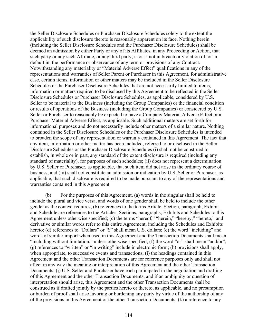 114 the Seller Disclosure Schedules or Purchaser Disclosure Schedules solely to the extent the applicability of such disclosure thereto is reasonably apparent on its face. Nothing herein (including the Seller Disclosure Schedules and the Purchaser Disclosure Schedules) shall be deemed an admission by either Party or any of its Affiliates, in any Proceeding or Action, that such party or any such Affiliate, or any third party, is or is not in breach or violation of, or in default in, the performance or observance of any term or provisions of any Contract. Notwithstanding any materiality or “Material Adverse Effect” qualifications in any of the representations and warranties of Seller Parent or Purchaser in this Agreement, for administrative ease, certain items, information or other matters may be included in the Seller Disclosure Schedules or the Purchaser Disclosure Schedules that are not necessarily limited to items, information or matters required to be disclosed by this Agreement to be reflected in the Seller Disclosure Schedules or Purchaser Disclosure Schedules, as applicable, considered by U.S. Seller to be material to the Business (including the Group Companies) or the financial condition or results of operations of the Business (including the Group Companies) or considered by U.S. Seller or Purchaser to reasonably be expected to have a Company Material Adverse Effect or a Purchaser Material Adverse Effect, as applicable. Such additional matters are set forth for informational purposes and do not necessarily include other matters of a similar nature. Nothing contained in the Seller Disclosure Schedules or the Purchaser Disclosure Schedules is intended to broaden the scope of any representation or warranty contained in this Agreement. The fact that any item, information or other matter has been included, referred to or disclosed in the Seller Disclosure Schedules or the Purchaser Disclosure Schedules (i) shall not be construed to establish, in whole or in part, any standard of the extent disclosure is required (including any standard of materiality), for purposes of such schedules; (ii) does not represent a determination by U.S. Seller or Purchaser, as applicable, that such item did not arise in the ordinary course of business; and (iii) shall not constitute an admission or indication by U.S. Seller or Purchaser, as applicable, that such disclosure is required to be made pursuant to any of the representations and warranties contained in this Agreement. (b) For the purposes of this Agreement, (a) words in the singular shall be held to include the plural and vice versa, and words of one gender shall be held to include the other gender as the context requires; (b) references to the terms Article, Section, paragraph, Exhibit and Schedule are references to the Articles, Sections, paragraphs, Exhibits and Schedules to this Agreement unless otherwise specified; (c) the terms “hereof,” “herein,” “hereby,” “hereto,” and derivative or similar words refer to this entire Agreement, including the Schedules and Exhibits hereto; (d) references to “Dollars” or “$” shall mean U.S. dollars; (e) the word “including” and words of similar import when used in this Agreement and the Transaction Documents shall mean “including without limitation,” unless otherwise specified; (f) the word “or” shall mean “and/or”; (g) references to “written” or “in writing” include in electronic form; (h) provisions shall apply, when appropriate, to successive events and transactions; (i) the headings contained in this Agreement and the other Transaction Documents are for reference purposes only and shall not affect in any way the meaning or interpretation of this Agreement and the other Transaction Documents; (j) U.S. Seller and Purchaser have each participated in the negotiation and drafting of this Agreement and the other Transaction Documents, and if an ambiguity or question of interpretation should arise, this Agreement and the other Transaction Documents shall be construed as if drafted jointly by the parties hereto or thereto, as applicable, and no presumption or burden of proof shall arise favoring or burdening any party by virtue of the authorship of any of the provisions in this Agreement or the other Transaction Documents; (k) a reference to any