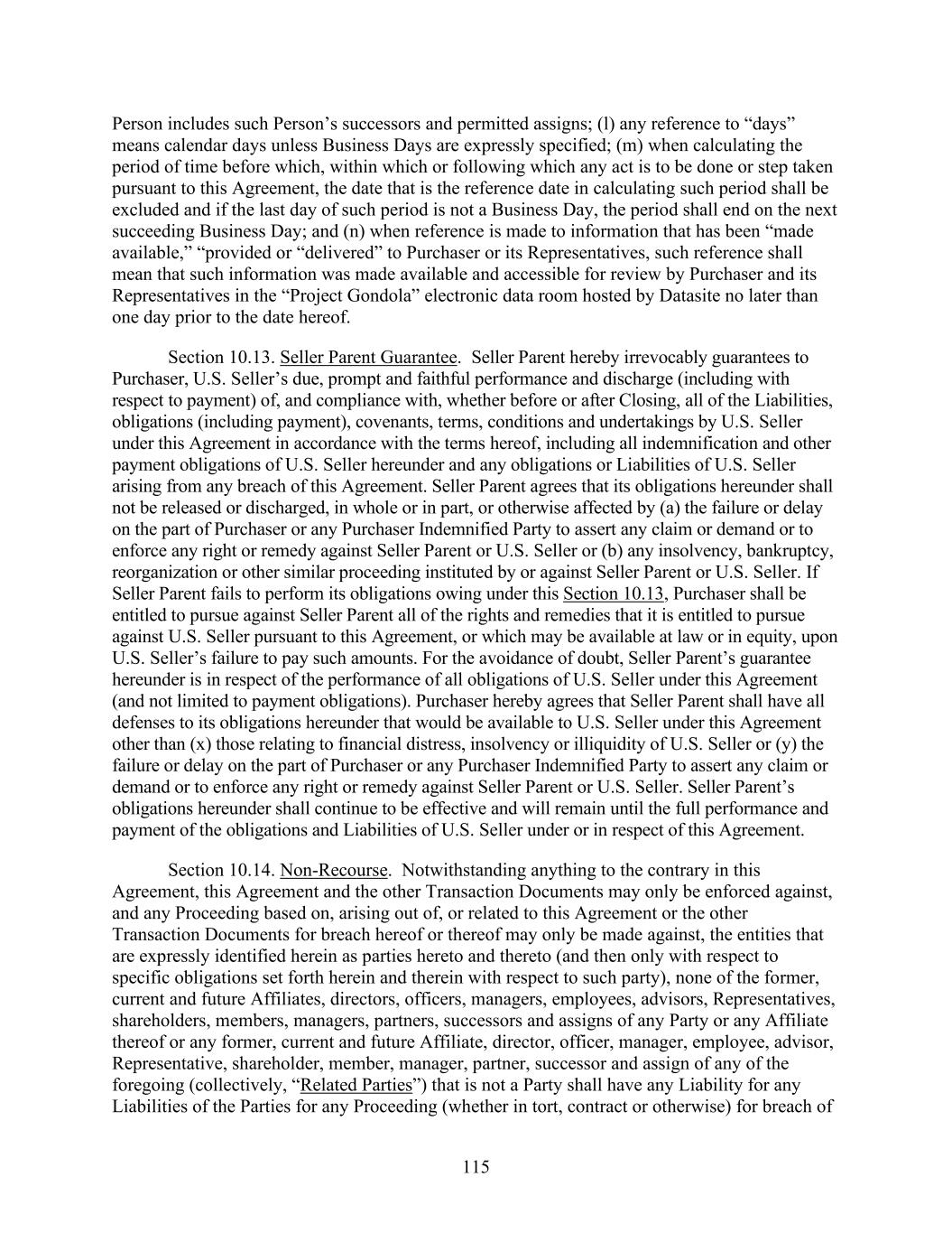 115 Person includes such Person’s successors and permitted assigns; (l) any reference to “days” means calendar days unless Business Days are expressly specified; (m) when calculating the period of time before which, within which or following which any act is to be done or step taken pursuant to this Agreement, the date that is the reference date in calculating such period shall be excluded and if the last day of such period is not a Business Day, the period shall end on the next succeeding Business Day; and (n) when reference is made to information that has been “made available,” “provided or “delivered” to Purchaser or its Representatives, such reference shall mean that such information was made available and accessible for review by Purchaser and its Representatives in the “Project Gondola” electronic data room hosted by Datasite no later than one day prior to the date hereof. Section 10.13. Seller Parent Guarantee. Seller Parent hereby irrevocably guarantees to Purchaser, U.S. Seller’s due, prompt and faithful performance and discharge (including with respect to payment) of, and compliance with, whether before or after Closing, all of the Liabilities, obligations (including payment), covenants, terms, conditions and undertakings by U.S. Seller under this Agreement in accordance with the terms hereof, including all indemnification and other payment obligations of U.S. Seller hereunder and any obligations or Liabilities of U.S. Seller arising from any breach of this Agreement. Seller Parent agrees that its obligations hereunder shall not be released or discharged, in whole or in part, or otherwise affected by (a) the failure or delay on the part of Purchaser or any Purchaser Indemnified Party to assert any claim or demand or to enforce any right or remedy against Seller Parent or U.S. Seller or (b) any insolvency, bankruptcy, reorganization or other similar proceeding instituted by or against Seller Parent or U.S. Seller. If Seller Parent fails to perform its obligations owing under this Section 10.13, Purchaser shall be entitled to pursue against Seller Parent all of the rights and remedies that it is entitled to pursue against U.S. Seller pursuant to this Agreement, or which may be available at law or in equity, upon U.S. Seller’s failure to pay such amounts. For the avoidance of doubt, Seller Parent’s guarantee hereunder is in respect of the performance of all obligations of U.S. Seller under this Agreement (and not limited to payment obligations). Purchaser hereby agrees that Seller Parent shall have all defenses to its obligations hereunder that would be available to U.S. Seller under this Agreement other than (x) those relating to financial distress, insolvency or illiquidity of U.S. Seller or (y) the failure or delay on the part of Purchaser or any Purchaser Indemnified Party to assert any claim or demand or to enforce any right or remedy against Seller Parent or U.S. Seller. Seller Parent’s obligations hereunder shall continue to be effective and will remain until the full performance and payment of the obligations and Liabilities of U.S. Seller under or in respect of this Agreement. Section 10.14. Non-Recourse. Notwithstanding anything to the contrary in this Agreement, this Agreement and the other Transaction Documents may only be enforced against, and any Proceeding based on, arising out of, or related to this Agreement or the other Transaction Documents for breach hereof or thereof may only be made against, the entities that are expressly identified herein as parties hereto and thereto (and then only with respect to specific obligations set forth herein and therein with respect to such party), none of the former, current and future Affiliates, directors, officers, managers, employees, advisors, Representatives, shareholders, members, managers, partners, successors and assigns of any Party or any Affiliate thereof or any former, current and future Affiliate, director, officer, manager, employee, advisor, Representative, shareholder, member, manager, partner, successor and assign of any of the foregoing (collectively, “Related Parties”) that is not a Party shall have any Liability for any Liabilities of the Parties for any Proceeding (whether in tort, contract or otherwise) for breach of
